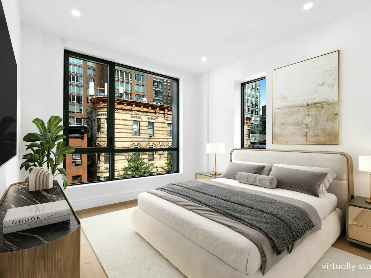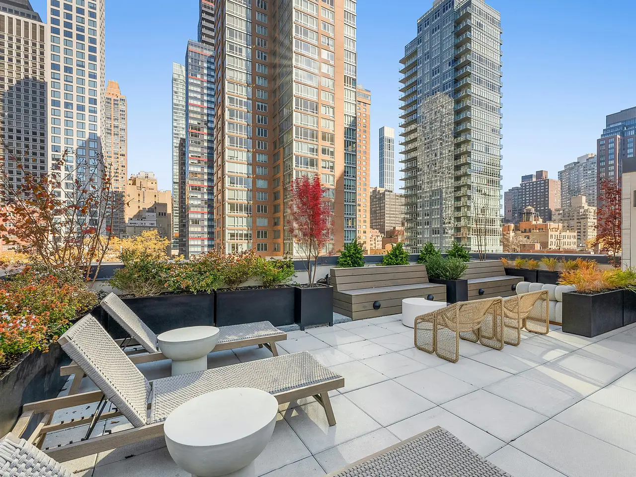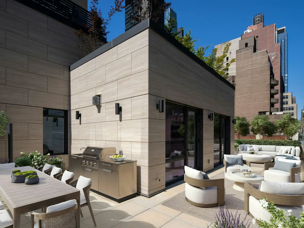 With three expansive outdoor spaces, the Penthouse is an enticing full-floor, four-bedroom, three and a half-bathroom residence spanning 2,566 interior square feet. This palatial space boasts a sprawling private terrace with breathtaking 180-degree views of midtown Manhattan as well as two additional outdoor spaces for a total of 989 exterior square feet. Upon entry, you are welcomed into a gracious gallery/foyer with expansive storage closets. Oversized north facing windows permeate the open plan, and the north facing living/dining room featuring a stone fireplace with abundant natural light highlights the mesmerizing skyline views beyond. The impressively outfitted kitchen features custom cabinetry by BOTTEGA, polished Taj Mahal Quartzite countertops and backsplash, fully integrated Miele Appliances, and Hansgrohe chrome fixtures. An oversized peninsula connects to the great room and provides ample space for dining with loft like openness. The sprawling terrace with outdoor kitchen located off the living room is perfect for entertaining guests or relaxing after a long day. The bedroom wing is discreetly tucked away from the living spaces and contains a laundry room with a Miele washer and dryer. Three large secondary bedrooms feature large-scale windows with skyline views, and each is complete with vast closet space. The primary bedroom sits at the end of the bedroom wing. This magnificent south and east facing suite includes an oversized window with skyline views and a gracious walk-in closet with room for significant storage and dressing space. The brilliantly appointed five-piece primary bathroom, with radiant heated floors, features North Pearl marble, a custom vanity and recessed medicine cabinet by BOTTEGA, and Hansgrohe chrome fixtures. Additional highlights include 9' ceilings in the living room and bedrooms, 8" wide plank Croatian Sandstone white oak floors throughout, and split system multi-zone HVAC. Each residence is pre-wired for smart home automation. Find Your New Melody at Minuet Minuet is an emblem of tranquility in the heart of Manhattan. Imagined by Minrav Development and Issac and Stern Architects, Minuet offers an exclusive collection of just fifteen residences at a prestigious address between the leafy streets of Sutton Place and Turtle Bay. Each elegant home is impeccably finished, leaving no detail overlooked. Residents at Minuet will enjoy an enviable suite of essential amenities and services. The bespoke travertine and oak paneled attended lobby, evokes the feel of a private club. The sunlit fitness center includes a separate movement studio and is outfitted with top-of-the-line equipment from Peloton, Aviron, and Precor. A beautifully landscaped rooftop crowns the building, complete with multiple lounge and dining areas and a built-in outdoor kitchen. While all residences are equipped with in unit washers and dryers, an additional laundry room with high-capacity washer and dryer is located at the cellar level. Bike storage is available, and additional private storage is available for purchase. Just a stone's throw away from the heart of buzzing Midtown, discover this haven of tranquility characterized by blocks of stately townhomes and lush tree-lined streets. In this cozy enclave, filled with small artisanal shops, boutique grocers, green parks, and fine dining establishments, you will find all of the conveniences of city living coupled with neighborly charm. The complete offering terms are in an offering plan available from Sponsor. File No. CD 20-0034. Sponsor: 244 E 52 OWNER LLC c/o Minrav Development, 540 Madison Avenue Suite 16N, New York, NY 10022. Equal Housing Opportunity.