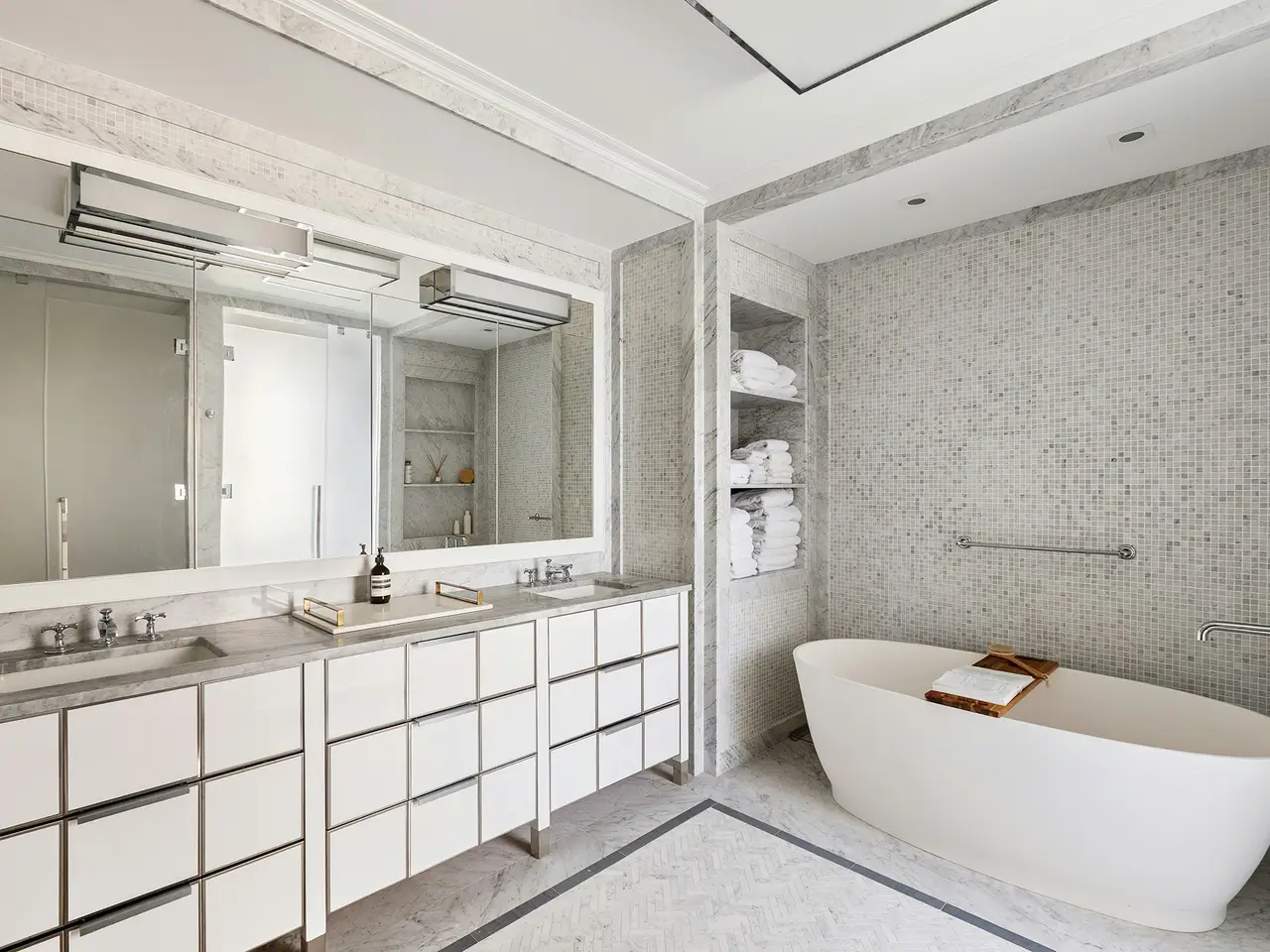 No board approval required for this purchase. This a grand pre-war co-op (with condo like rules when selling or subletting- just a waiver of right of first refusal!) sprawling 2,931 sq. feet (per Offering Plan) offering 4 Bedrooms, 4.5 Bathrooms, sunlight streaming in all day, with windows facing East, West, North and South (all directions)! Brilliantly sunny and facing East from the living room, the primary view is both colorful and serene. Oversized windows look out over green trees and assorted building backyards of varying shapes and sizes, nestled between West 71st-West 72nd, with a peek of high-rise buildings and blue skies in the distance. Servicing the square 25-Foot Wide "Great Room", with regal beamed ceilings and paneling, is the open eat-in-kitchen that would inspire the most discerning chef. Barstools line up along the expansive overhang of the quartzite island, while custom-built, lacquered kitchen cabinets provide an abundance of storage. The Verona induction range vents externally, and an added Miele Convection/Microwave wall oven provides additional high-speed cooking/heating options. The Miele Dishwasher is disguised with beautiful cabinet paneling, and a side-by-side Gaggenau Refrigerator/Freezer offers very spacious storage, and there is also a separate wine fridge. This luxurious kitchen is part of an open, loft-like space (nearly 600 sq. feet) that includes the formal dining area and living room. Additional bells and whistles of the residence include: Solid 5" white oak hardwood floors laid in a handsome herringbone pattern, central air conditioning, and a separate windowed laundry/"Mud" room with a Bosch washer and dryer (a welcome and rare bonus!) Bedroom exposures primarily face West and are flooded with afternoon sun. Peering over a private landscaped courtyard that belongs to the neighboring "Heritage" Condo building, is a peaceful green space, ensuring a quiet setting outside of your primary bedroom windows. While each bedroom is complete with an en suite bathroom, huge closets, oversized windows and ample privacy, the Primary Bedroom Suite enjoys an exquisite fireplace mantle, huge walk-in-closet and an additional windowed "bonus room". The bonus room can serve as a home office, nursery, dressing room, or even a second walk-in closet! The spa-like bathroom has generous proportions with an oversized soaking tub, double sinks and vanities, a huge windowed shower stall, separate toilet booth, and Italianate mosaic marble tile surfaces. Finished in a soothing color palate of light blues, greys, and white, the primary bathroom offers a serene oasis. Offering over 17,000 sq. feet of pristine, newly built amenities, this luxurious co-op welcomes you home with a full staff with concierge, elegant lobby, double library, private screening room, full fitness center, game room, party room/lounge with kitchen, and a spacious children's playroom. Pets are welcome at the Chatsworth, which is located just across from the Upper West Side's most popular Dog Run. Take a stroll through the lush Riverside Park and you'll find this location has easy access to all transportation (including the express subway station at West 72nd, just two blocks away). Enjoy the best of the Upper West Side, from any vantage point, in every direction!