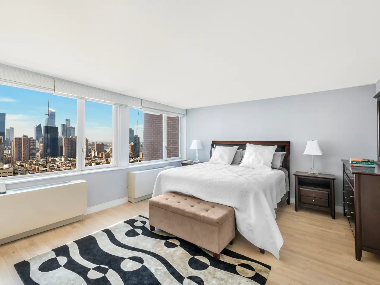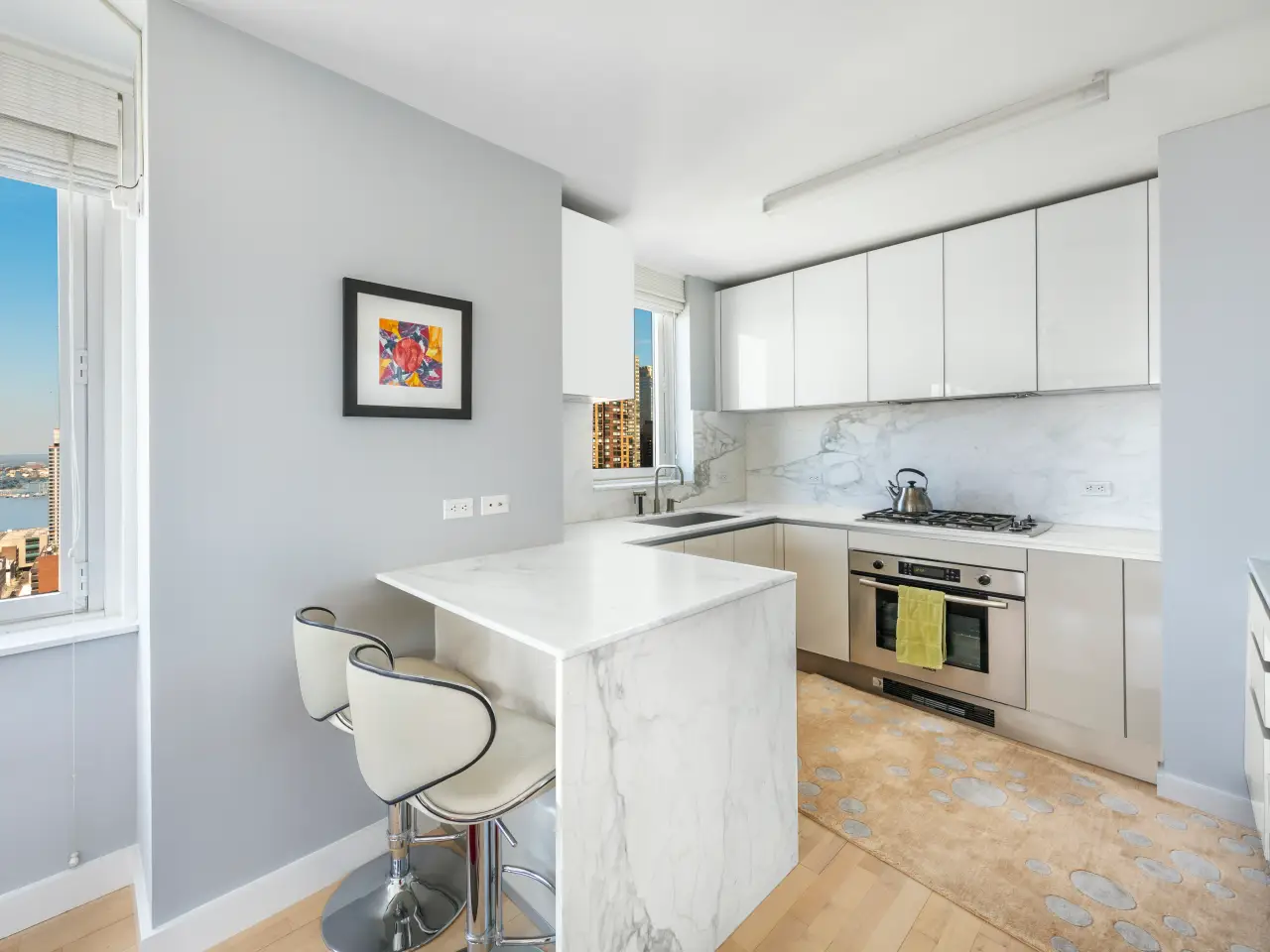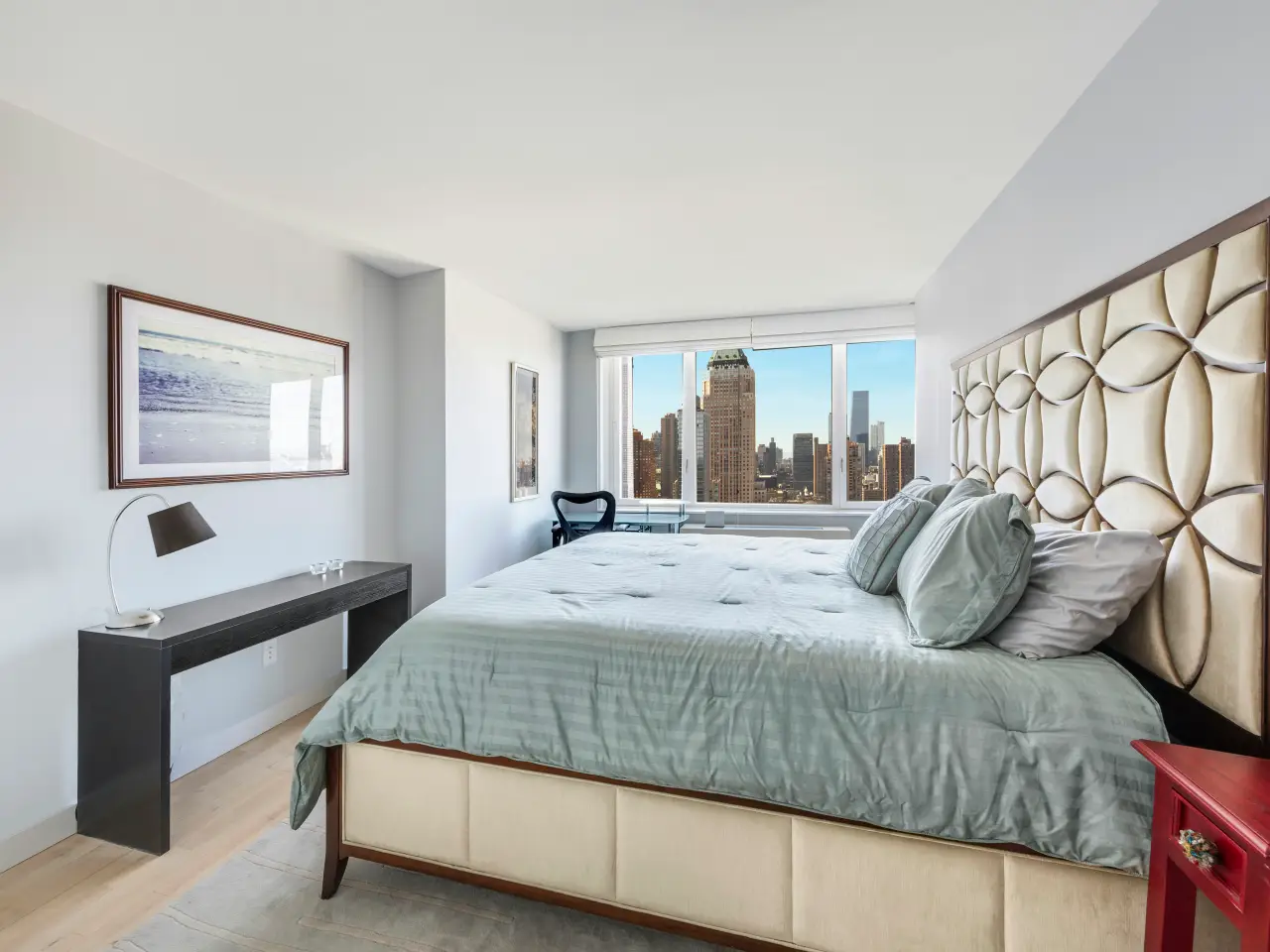 This contemporary high-end furnished two bedroom home has two baths with a fantastic primary bath that contains double sinks and a soaking tub along with a shower stall. The primary bedroom is huge along with a walk in closet. You'll see stunning panoramic views facing the Hudson River and the southern skyline. The nice open kitchen is perfect for entertaining. Enjoy the building with the most spectacular amenities in town! Situated on the 57th and 58th floors facing every direction, you get panoramic views from every angle. There are two resident lounges available for events and parties, a pool with decking, BBQ's with tables and chairs, saunas, steam rooms, a fully equipped gym and yoga room, 12 free classes a week, and massages and facials available at extra charge. In addition, you have a temperature controlled storage room, a garage, a bike room, and a pet spa. This neighborhood is incomparable, with eclectic restaurants and boutiques in the surrounding area, and The Columbus Circle Shopping Mall with Whole Foods, a block away. Available furnished , 6 months to 1 year