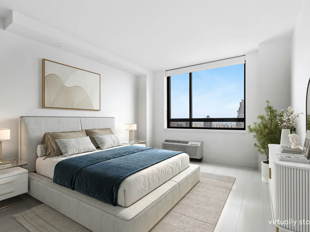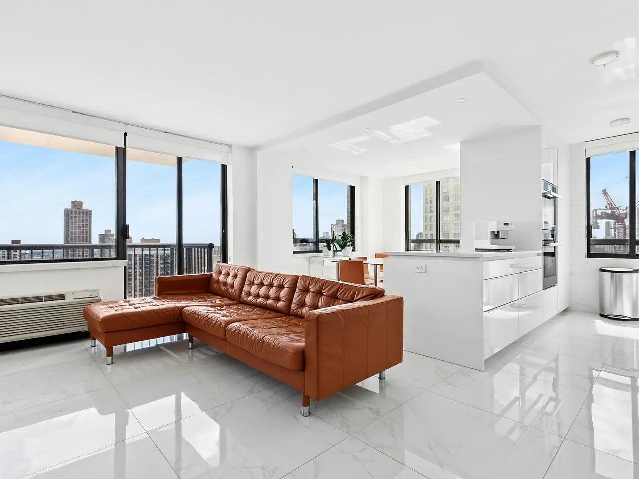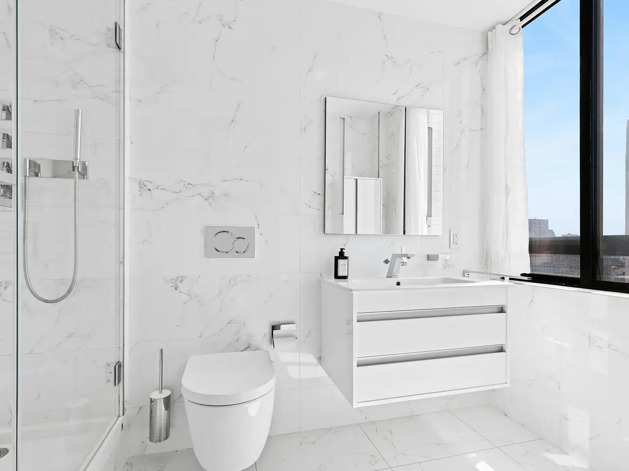 Perched on the 32nd floor, this stunning Upper East Side condominium offers every imaginable highest-end finish, private balcony and sweeping south and east postcard skyline views, filling every room with brilliant natural light. Spanning 1,254 square feet, this 2-bedroom, 2.5-bath residence has been meticulously gut-renovated in collaboration with a renowned architect, blending European sophistication with modern convenience. The open-concept living space is framed by Porcelanosa Carrera porcelain flooring, chosen for both durability and refined style. Expansive low-E double-pane windows enhance the panoramic views while reducing noise and UV rays, ensuring a serene atmosphere throughout the day. At the heart of the home lies a fully customized Poggenpohl kitchen, imported from Germany in glossy white, anchored by a central island and topped with Silestone Eternal Statuaria Quartz, the kitchen is outfitted with a complete suite of top-tier Miele appliances: two large refrigerators, two ovens (including a steam combo), cooktop, hood, dishwasher, and in-unit washer/dryer. King-sized bedrooms, both with elegant en-suite full baths, feature light-colored 8-inch Carlisle wide-plank wood floors, brilliant light and generous storage, including a walk-in California closet in the primary suite. The bathrooms are true sanctuaries, clad floor-to-ceiling in Porcelanosa Carrera porcelain. Every fixture has been carefully selected from the finest European brands. Dornbracht faucets and showers provide precision craftsmanship, while Hansgrohe fixtures add both design and performance. Wall-mounted Duravit vanities and toilets, paired with sleek Geberit systems, maximize space and modern appeal. Robern LED medicine cabinets introduce functional elegance with soft, flattering light, and custom glass shower doors complete the spa-like environment. There is an additional half bath for your guests! Each detail-from the flush finishes to the subtle textures-creates a retreat where luxury meets tranquility. Additional upgrades include all-new electrical wiring and plumbing, wireless Lutron smart lighting controls, and individually controlled LG PTAC units with heating and cooling. Residents of Evans Tower enjoy a full suite of amenities: 24-hour doorman, concierge, rooftop indoor/outdoor swimming pool, sauna, rooftop health club and lounge with skyline views, two expansive sundecks, and private storage options. Fantastic location just a couple blocks from the 4,5,6 and Q trains, Whole Foods, Fairway and endless food and dining options. Pet-friendly. This home has it all!