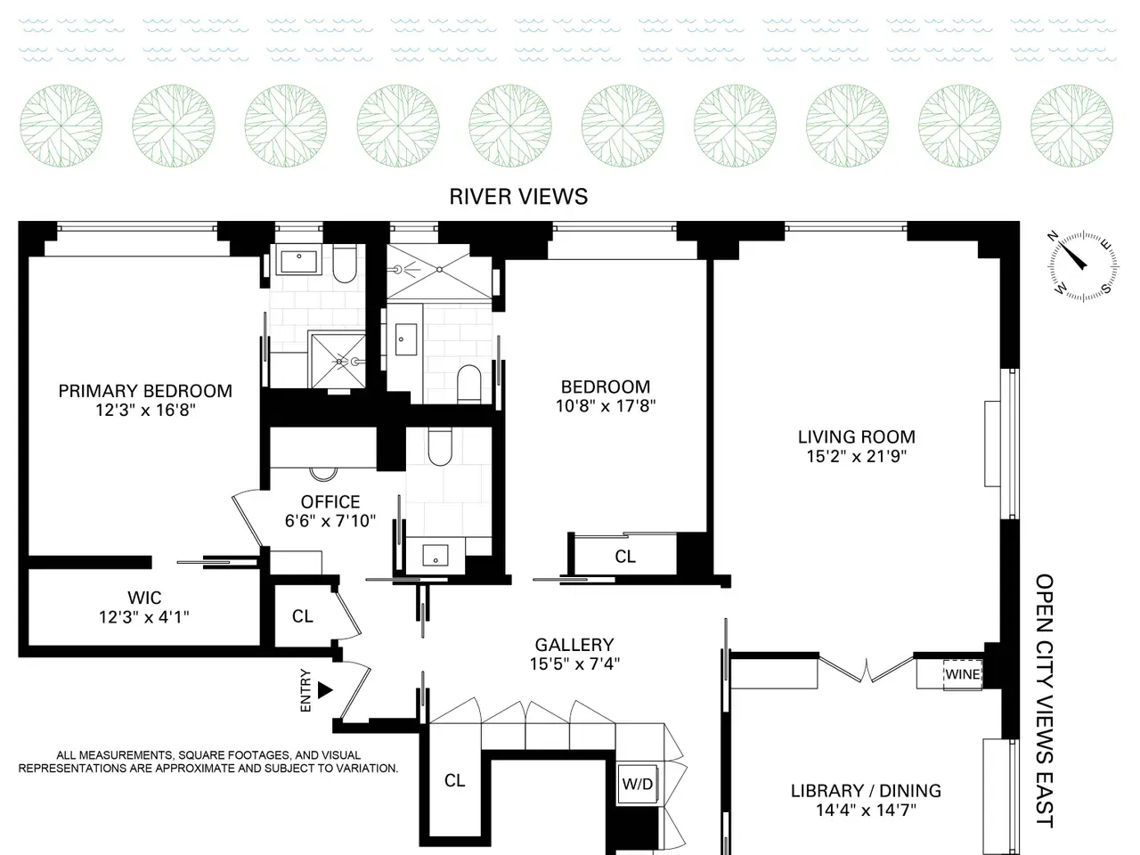 Glorious Light and Views Perfectly positioned on the 12th floor of 37 Riverside Drive at 76th Street-with stunning river and open city views from every window-this newly renovated classic prewar home offers elegant space in pristine condition, in an ideal location. A grand slate-paved gallery welcomes you off the semi-private landing. Directly to the west is the breathtaking corner living room with a nearly floor-to-ceiling window showcasing cinematic views of the splendid Hudson River and a direct sightline to the GW Bridge. To the east is an open city panorama of West Side landmarks, with the entire home filled with natural sunlight all day long. Through antique French oak paneled doors is the formal dining room/library, also with lovely east views. The true gourmand's professional kitchen incorporates the former staff room and bath to create an eat-in sun-filled space with storage for every implement: appliance garage, vented Blue Star stove, Sub-Zero fridge, heated stone floors, water filtration, limitless counter space, and custom white Italian cabinetry. The wet bar serves as a butler's pantry off the dining room and is the ideal setting for entertaining and hosting home-cooked meals. The bedroom wing is comprised of two sizable bedrooms-the primary with a sitting area and private home office, both with glorious river views. Each features a windowed en-suite renovated modern bathroom with heated floors and premier fixtures and materials. A powder room for guests is discreetly located off the gallery, which is lined floor-to-ceiling with paneled storage, cleverly hiding all household items from sight, including the in-unit washer/dryer. Two zones of central AC ensure year-round comfort, and the entire home was rewired for maximum power and AV/Smart Home capabilities. 37 Riverside Drive offers a boutique full-service experience with only 32 units, and provides a full-time doorman, resident building manager, new fitness room, and deeded storage and bike space. An easy stroll to Broadway for delightful shopping, top schools both public and private are moments away, as is express and local train service. 75% financing is permitted, and pets are welcome.