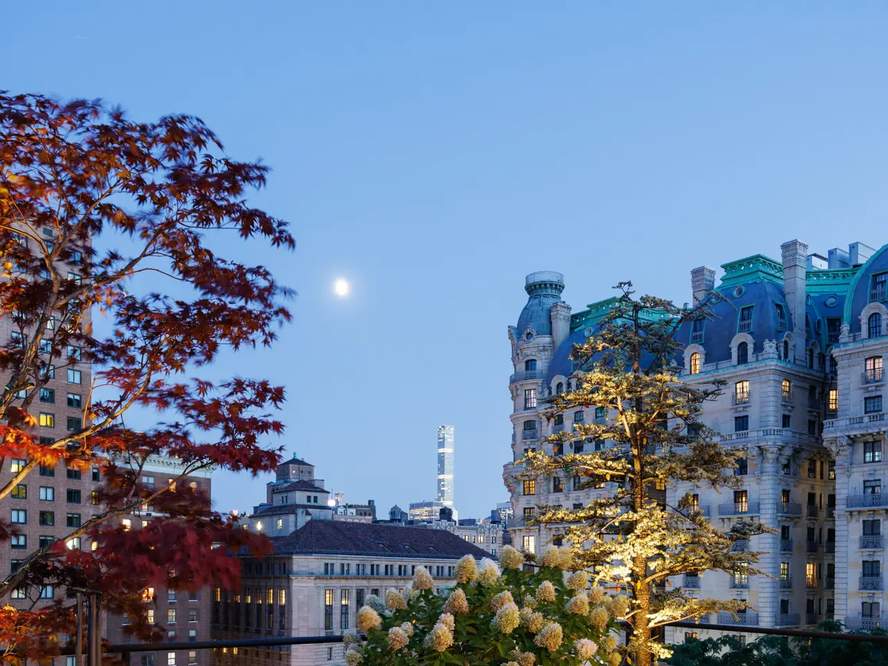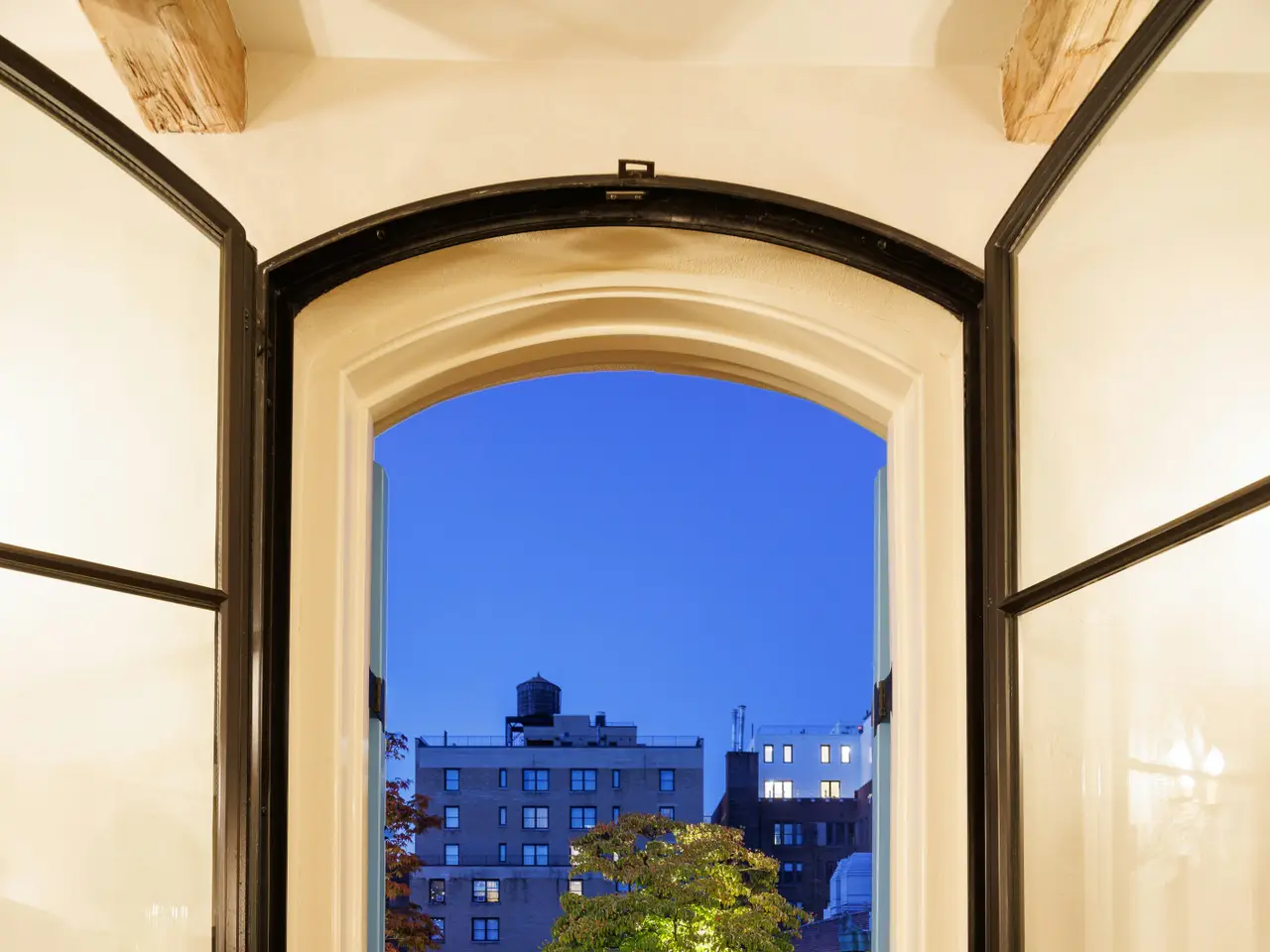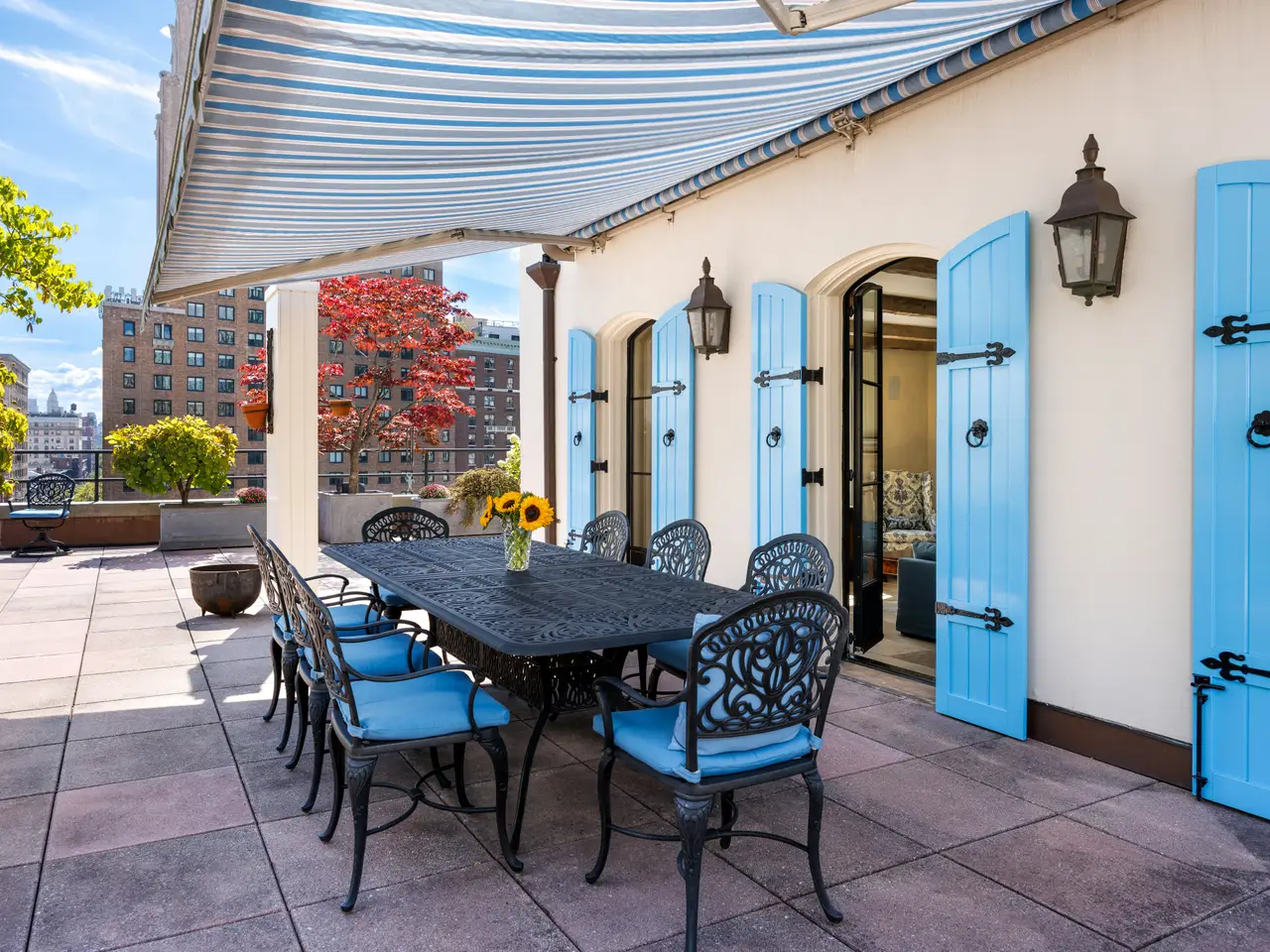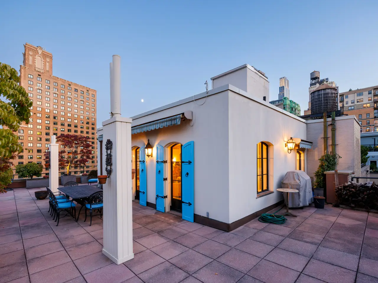 A Mediterranean Oasis on the Upper West Side. This dramatic and beautifully unique duplex penthouse is a tranquil sanctuary with 2 large terraces, 4 exposures with open views, and an elegant renovation! Perched high above the City on Weet 75th Street, wrapped in sweeping 360-degree views and framed by two private terraces, this residence is a seamless blend of romance, impeccable design, and custom and artisanal details. Every element, from hand-finished walls to French limestone floors, French oak hand scraped doors, custom wood shutters, and reclaimed barn beams, tells a story of unique elegance. Arrive via a keyed elevator that opens into a luminous living space where the beamed ceilings and a natural gas antique limestone fireplace help create the ambiance of a French country get away in the City. French doors open to the terrace while windows in 3 directions allow natural light to pour in and the skyline to become part of the home itself. At the heart of the residence is a windowed chef's kitchen complete with a La Cornue five-burner range with stainless and brass detailing, a matching vented hood, an abundance of custom French walnut cabinetry, a Sub-Zero refrigerator with a double freezer, 2 Miele dishwashers, and 2 sinks each with garbage disposals. A pass-through door to the dining room allows the spaces to either be integrated or remain separate. The expansive terrace off of the living room is truly a one-of-a-kind treat in the City set against the ever-changing light and views over the Upper West Side skyline. It is equipped with a wood-burning oven, natural gas grill, automated awnings, drip irrigation, landscape lighting and outdoor speakers. The South facing primary bedroom suite is a rustically romantic space with an original reclaimed barn beam ceiling, two customized walk-in closets providing abundant storage, and its own private terrace with a swing that invites quiet moments above the City. The windowed 6-fixture primary bathroom is a sanctuary in and of itself, with radiant heated limestone floors, a double vanity, a separate water closet, and a gorgeous antique Rogeat soaking tub perfectly positioned to enjoy iconic views of the Ansonia.  Completing the upstairs level of the home are radiant heated limestone and wood floors throughout, an integrated Sonos system and a powder room with a leaded glass window and custom French walnut floor. Descend the French oak staircase to the private downstairs level, where sunlight streams into two generously scaled bedrooms. A spacious, windowed bathroom with a walk-in shower serves this floor as well as a laundry room complete with a full-sized, vented LG washer/dryer, a 150-bottle wine cooler, a backup Sub-Zero under counter refrigerator, sink, and treadmill. Additional modern luxuries include three zones of central air conditioning and heating with integrated humidification, independent hot water and gas systems, exterior-vented bathrooms, fully customized closets throughout, and drip irrigation system on both terraces. 240 West 75th Street is an intimate pre-war boutique cooperative nestled in the heart of the Upper West Side, near Lincoln Center, Riverside Park, and the neighborhood's finest dining and shopping. Residents enjoy the support of a full-time live-in superintendent, laundry room, landscaped courtyard, and close proximity to major transportation lines. Pieds-à-terre and pets are welcome.