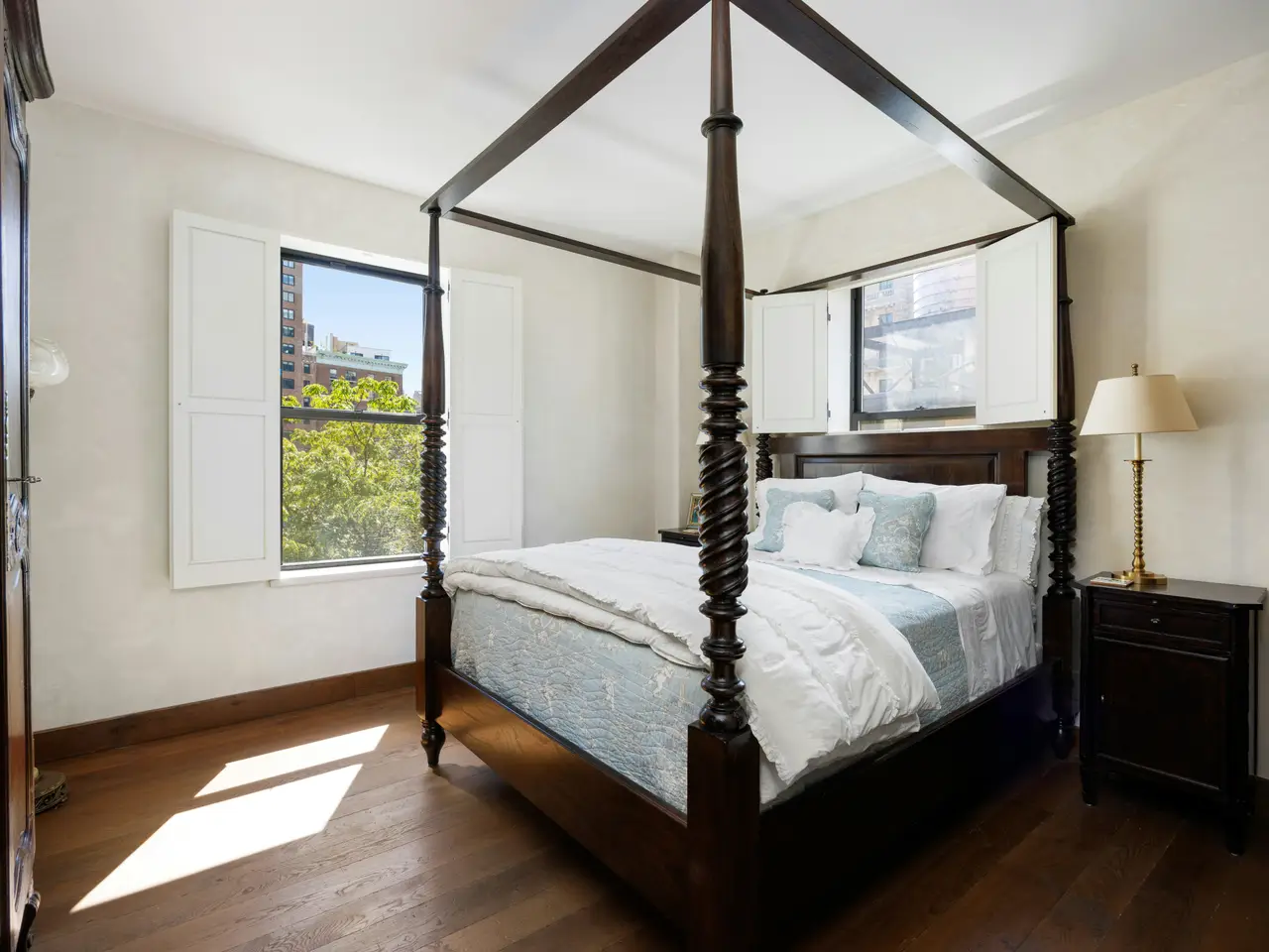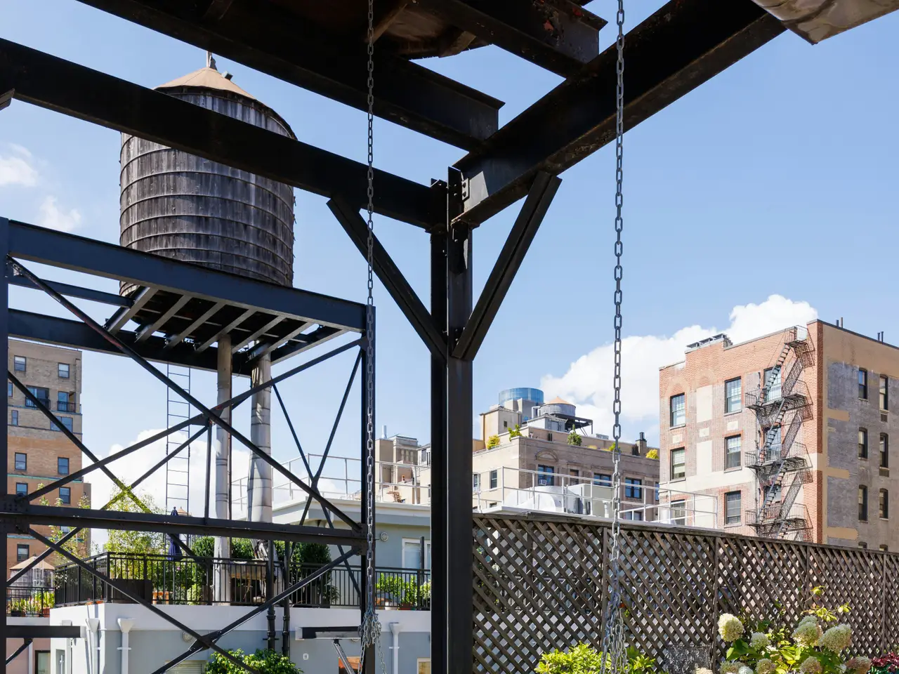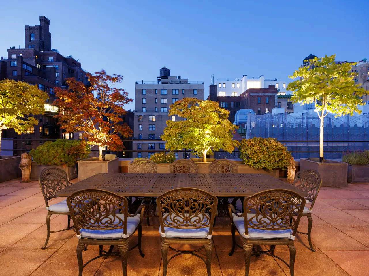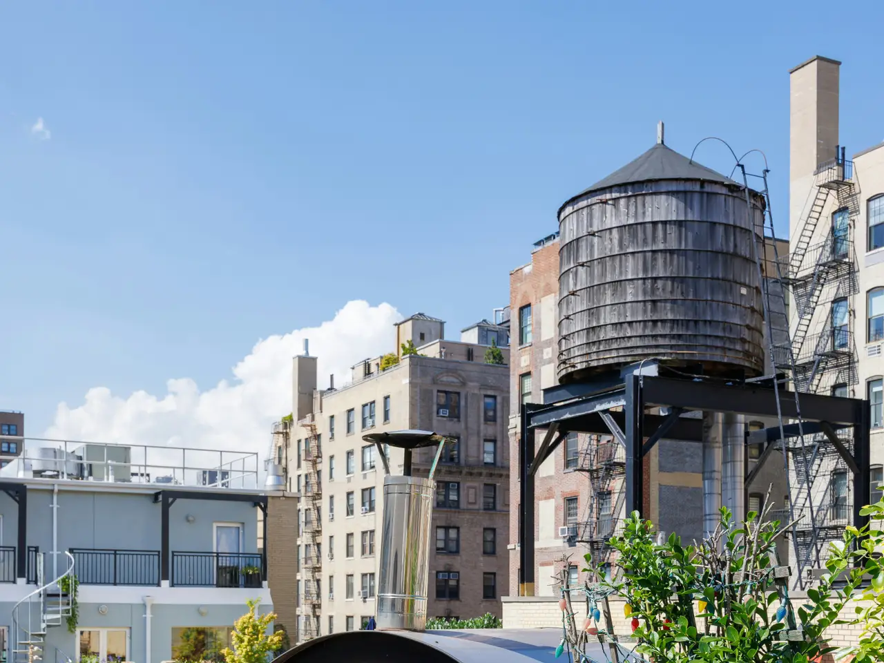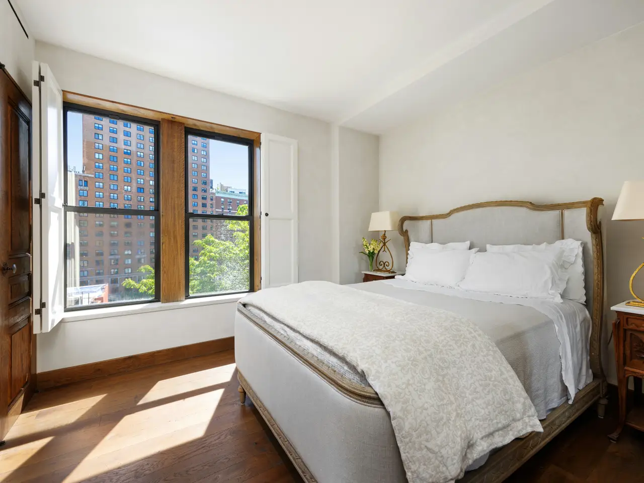 A Mediterranean Oasis on the Upper West Side. This dramatic and beautifully unique duplex penthouse is a tranquil sanctuary with 2 large terraces, 4 exposures with open views, and an elegant renovation! Perched high above the City on Weet 75th Street, wrapped in sweeping 360-degree views and framed by two private terraces, this residence is a seamless blend of romance, impeccable design, and custom and artisanal details. Every element, from hand-finished walls to French limestone floors, French oak hand scraped doors, custom wood shutters, and reclaimed barn beams, tells a story of unique elegance. Arrive via a keyed elevator that opens into a luminous living space where the beamed ceilings and a natural gas antique limestone fireplace help create the ambiance of a French country get away in the City. French doors open to the terrace while windows in 3 directions allow natural light to pour in and the skyline to become part of the home itself. At the heart of the residence is a windowed chef's kitchen complete with a La Cornue five-burner range with stainless and brass detailing, a matching vented hood, an abundance of custom French walnut cabinetry, a Sub-Zero refrigerator with a double freezer, 2 Miele dishwashers, and 2 sinks each with garbage disposals. A pass-through door to the dining room allows the spaces to either be integrated or remain separate. The expansive terrace off of the living room is truly a one-of-a-kind treat in the City set against the ever-changing light and views over the Upper West Side skyline. It is equipped with a wood-burning oven, natural gas grill, automated awnings, drip irrigation, landscape lighting and outdoor speakers. The South facing primary bedroom suite is a rustically romantic space with an original reclaimed barn beam ceiling, two customized walk-in closets providing abundant storage, and its own private terrace with a swing that invites quiet moments above the City. The windowed 6-fixture primary bathroom is a sanctuary in and of itself, with radiant heated limestone floors, a double vanity, a separate water closet, and a gorgeous antique Rogeat soaking tub perfectly positioned to enjoy iconic views of the Ansonia.  Completing the upstairs level of the home are radiant heated limestone and wood floors throughout, an integrated Sonos system and a powder room with a leaded glass window and custom French walnut floor. Descend the French oak staircase to the private downstairs level, where sunlight streams into two generously scaled bedrooms. A spacious, windowed bathroom with a walk-in shower serves this floor as well as a laundry room complete with a full-sized, vented LG washer/dryer, a 150-bottle wine cooler, a backup Sub-Zero under counter refrigerator, sink, and treadmill. Additional modern luxuries include three zones of central air conditioning and heating with integrated humidification, independent hot water and gas systems, exterior-vented bathrooms, fully customized closets throughout, and drip irrigation system on both terraces. 240 West 75th Street is an intimate pre-war boutique cooperative nestled in the heart of the Upper West Side, near Lincoln Center, Riverside Park, and the neighborhood's finest dining and shopping. Residents enjoy the support of a full-time live-in superintendent, laundry room, landscaped courtyard, and close proximity to major transportation lines. Pieds-à-terre and pets are welcome.
