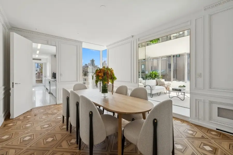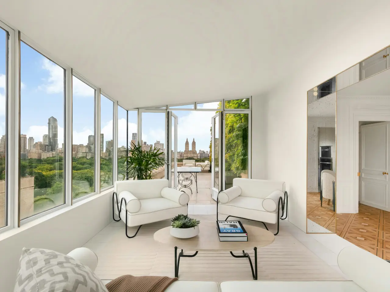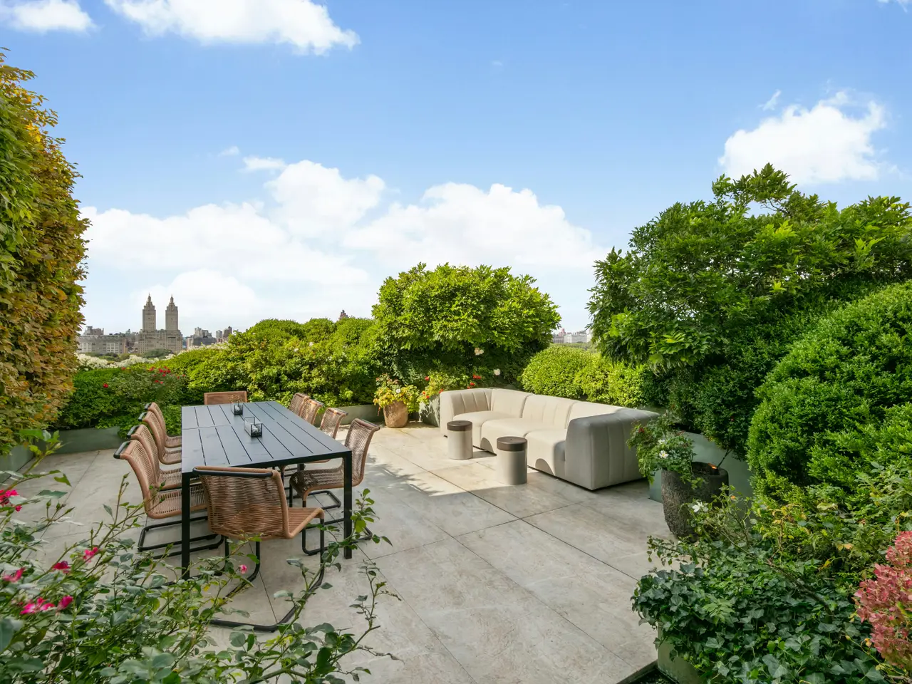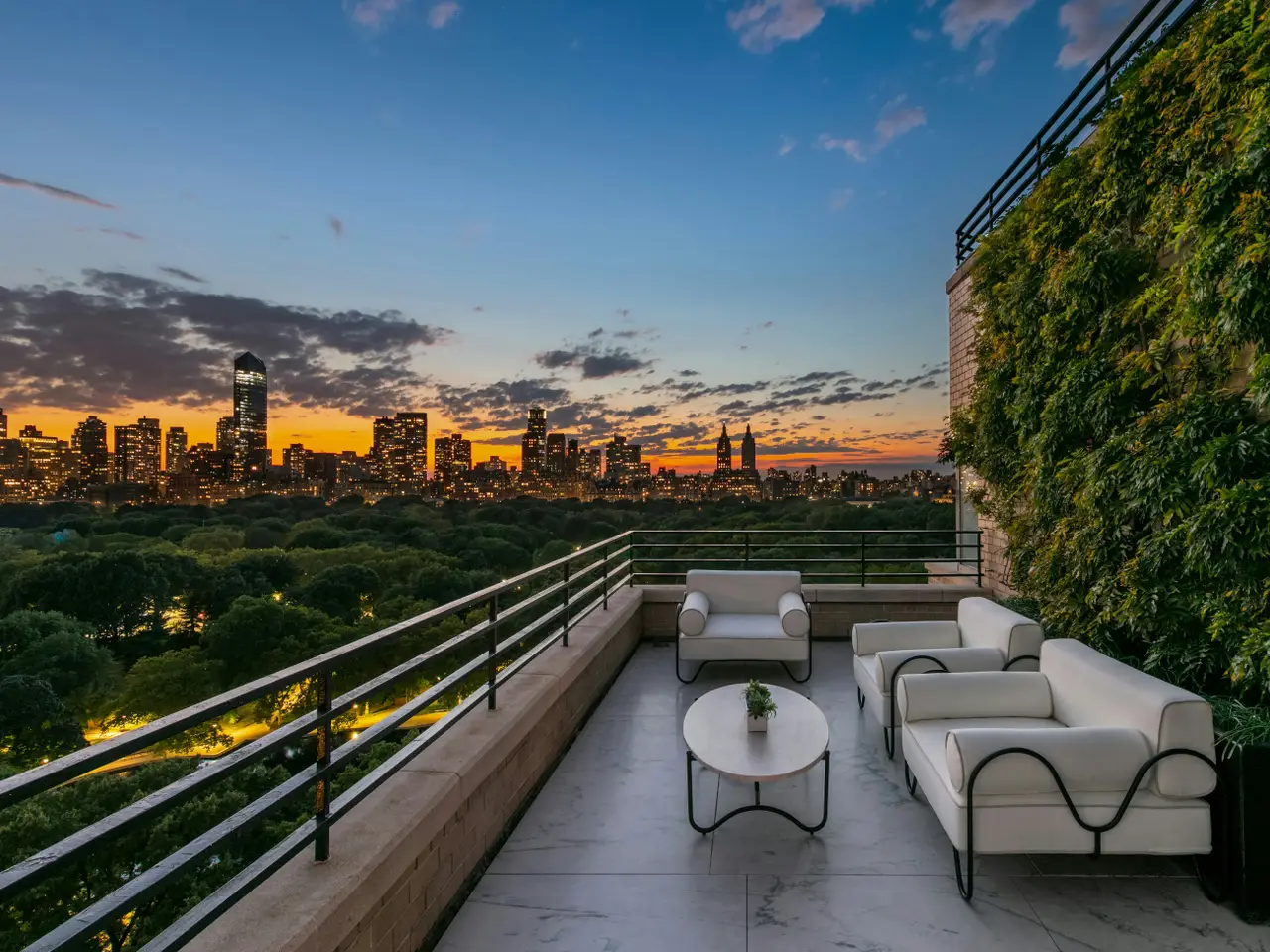 Perched atop 936 Fifth Avenue, this recently updated three-bedroom penthouse is a true gem, offering unparalleled Central Park vistas and an abundance of natural light. The fully renovated, duplex spans 3,800 square feet of exquisite interior space, complemented by over 2,400 square feet of private outdoor terraces. A private elevator opens directly onto the 18th floor, where you're greeted by a stunning marble-clad gallery with double-height ceilings and a sweeping marble staircase. The residence features a series of lush, landscaped wrap-around terraces that enhance every principal room with green, panoramic views. The grand living room is a highlight, boasting a bay window with sweeping westward views over Central Park and expansive northern and southern vistas. The elegant formal dining room impresses with its parquet de Versailles flooring and exquisite boisserie. A floor to ceiling corner window was just added in a recent renovation, offering open Eastern exposures. Adjacent to this is a sun-drenched breakfast room with heated floors, and folding glass doors opening to the Southern terrace. The entire first floor boasts soaring 10'+ ceilings throughout. The chef's kitchen is a culinary dream, outfitted with custom-designed Bulthaup cabinetry, a large Wolf stove, Miele ovens, and a Sub-Zero refrigerator, all framed by open, airy views. A stylish powder room completes the public spaces. The main bedroom suite, located on the lower floor, offers stunning Central Park views and direct terrace access. Its spacious en-suite bathroom features heated marble floors, double sinks, a large soaking tub, and a shower, all finished in luxurious onyx. Additionally, there are two generously sized bedrooms on the first floor, each with en-suite bathrooms, ample closet space, large windows, and terrace access. Upstairs, the library/media room is a standout feature, equipped with a surround sound system and blackout shades. It offers another bay window and three additional large windows with single-pane fenestration. This level also provides access to a west- and north-facing landscaped terrace, complete with a grill, refrigerator, and ice maker, ideal for al-fresco dining. The upper floor includes a staff room, a half bath, and a sizable outdoor laundry room. The apartment is enhanced with five-zone central air conditioning, new windows and doors with insulated glass for soundproofing and weather resistance, a Crestron/Lutron system, as well as waterproofing and irrigation systems for the terraces. An ADT security system is also installed, and the apartment is wired throughout. Built in 1955, 936 Fifth Avenue is situated at the southeast corner of 75th Street and Fifth Avenue. The building provides white-glove service, including a full-time doorman, elevator attendant, resident manager, fitness center, and laundry room. Up to 50% financing is permitted, with a 4% flip tax payable by the buyer.