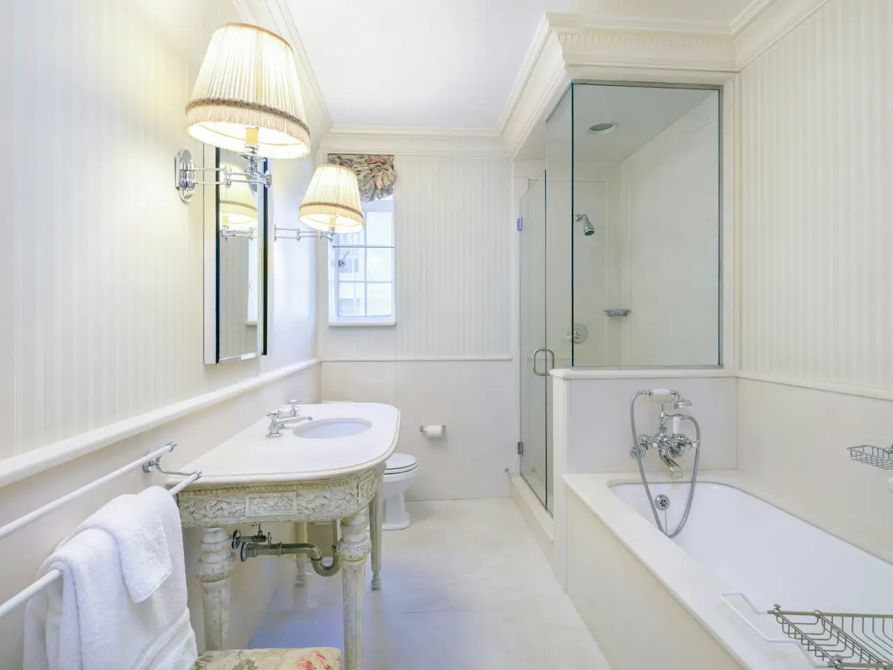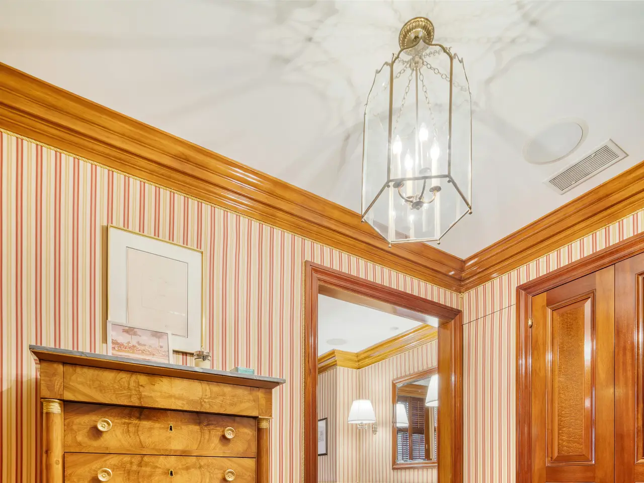 Newly renovated, glamorous duplex at Millan House. A foyer with a sweeping curved staircase provides the point of arrival for this elegant apartment. A step-down living room is entered through an archway, and has a wood burning fireplace, ten foot ceilings, and original casement windows, with sunny southern exposure over the roof of the landmarked Park Avenue Armory. A gorgeously pine-paneled library is adjoining, an ideal spot for cozy evenings or intimate gatherings. There is a huge cloak and powder room with a mahogany and marble vanity. A large and gracious formal dining room with parquet de Versailles floors and china closet faces north to Millan House's famed garden. All of the doors are figured mahogany with custom brass hardware. Beyond the dining room is a pantry with marble counters, ample storage, an under counter subzero wine fridge, two SubZero refrigerator drawers, and a sink and a bar. The pantry leads to a gourmet eat-in kitchen with a SubZero refrigerator, Miele dishwasher and brand new six-burner Bertazzoni vented chef's range. In the rear of the apartment is a full bath, a large and private guest bedroom and a wonderful laundry room with tons of storage. Ascending the staircase one arrives on the upstairs floor, also accessed by the passenger elevator. A large primary bedroom suite has a south-facing bedroom with lovely views over the Armory and the midtown skyline. The middle bedroom has been artfully transformed into a jaw-dropping dressing room with elegant mahogany built ins worthy of Saville Row. Beyond is a bathroom that transports one to the most elegant of London hotels, with a free-standing soaking tub, a large limestone shower with rainfall head, a separate water closet, a marble and mahogany vanity, and custom mahogany moldings and millwork throughout. A hallway leads to a very private and spacious guest suite, with a custom marble bathroom, eastern exposure over the garden, and ample closet space. The apartment is fully centrally air conditioned. Built by John D. Rockefeller in 1931, Millan House consists of two separate buildings connected by a two-level Italianate interior private garden courtyard, with a wonderful fountain and seating areas. Designed by architect Andrew J. Thomas with 57 apartments, the buildings have Romanesque details such as carved animal capitals and arched loggias. Pied-a-terres and pets are welcome. 3% flip tax by purchaser. Special assessment for Local Law 11 through 7/25 of $1897 a month.