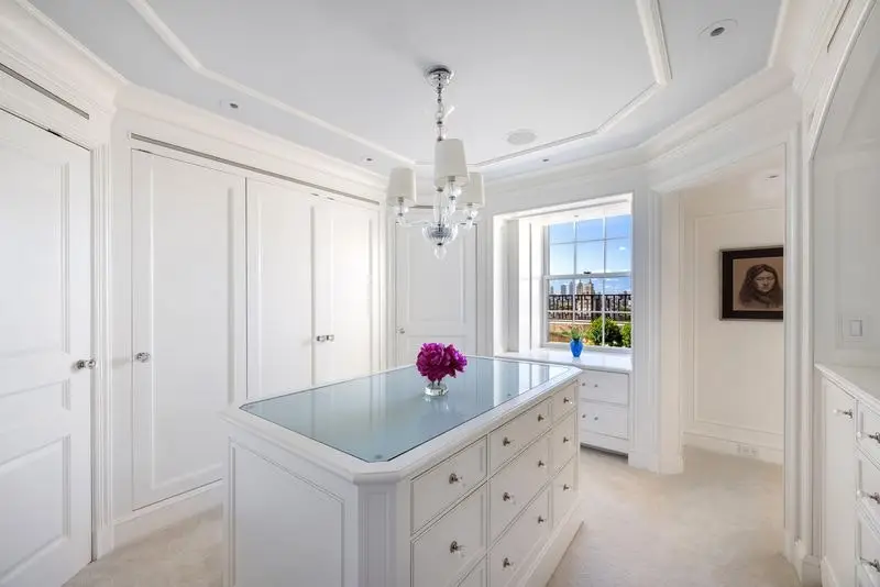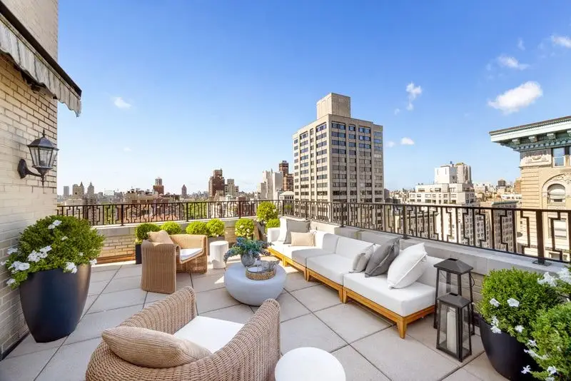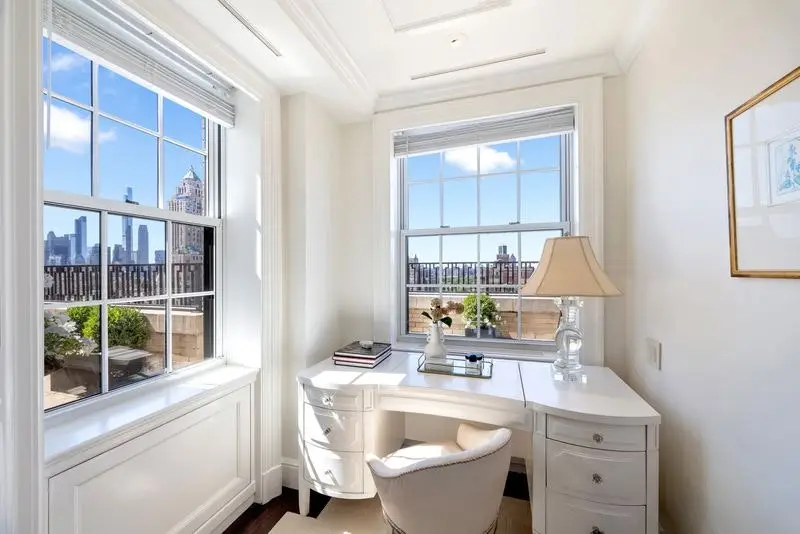 TRIPLE MINT 6,985 SQ FT. PENTHOUSE Perfectly situated in one of Park Avenue's most prestigious white-glove cooperatives, this extraordinary penthouse has been renovated to perfection and boasts 6,985 square feet of interior space and 1,300 square feet of beautifully landscaped terraces. The home enjoys magnificent open views spanning westward to Central Park and capturing the Manhattan Skyline to the south. The residence consists of 14 rooms, 5 bedrooms, 6 full bathrooms, and 2 powder rooms. Natural light stream in from all four exposures throughout the day. The 16th Floor: A private elevator landing opens into a dramatic circular marble gallery, anchored by a sweeping staircase with a finely wrought bronze balustrade. To one side, a handsome paneled mahogany library with a wood-burning marble fireplace and three French doors opens to a western terrace facing Central Park. Adjacent, a large and inviting corner family room has access to an additional landscaped terrace. At the heart of the home, the spectacular chef's kitchen is designed for both everyday living and grand entertaining. Outfitted with custom cabinetry, expansive Carrara marble surfaces, and top-of-the line appliances, it provides both elegance and functionality. A private office , powder room and internal elevators complete this level. The 17th Floor: Ascending the marble staircase-or arriving by elevator to a private elevator vestibule-guests are welcomed into an expansive marble gallery leading to an impressive living room and an elegant circular dining room. Perfectly proportioned and filled with natural light streaming in through oversized picture windows, the living room enjoys triple exposures and striking city views. The dining room, distinguished by mahogany inlaid floors and a marble wood-burning fireplace, sets the stage for unforgettable gatherings. Supporting these grand entertaining spaces are a fully equipped butler's pantry, staff quarters or fifth guest suite with full bath, and an additional powder room. The 18th Floor: The enormous private bedroom floor has a total of four bedrooms and five bathrooms. The sprawling primary suite has dual over-sized bathrooms and vast amounts of closet space. The suite has triple exposures and is surrounded by a beautifully landscaped terrace with open views toward Central Park. There are three additional corner bedrooms with an en-suite marble baths and walk-in closets. All of the bedrooms have impressive open views and are pin-drop quiet. A spacious laundry room completes this level of the residence. The Building: Built in 1930 and designed by renowned architectural firm Sloan & Robertson, 895 Park Avenue is a prestigious white-glove cooperative in the heart of the Upper East Side Historical District. Residents enjoy impeccable white-glove service, including 24-hour doormen, porters, a resident manager, a state-of-the-art gym, and a squash court. The building permits 50% financing, is pet-friendly, and there is a 3% buyer-paid flip tax.