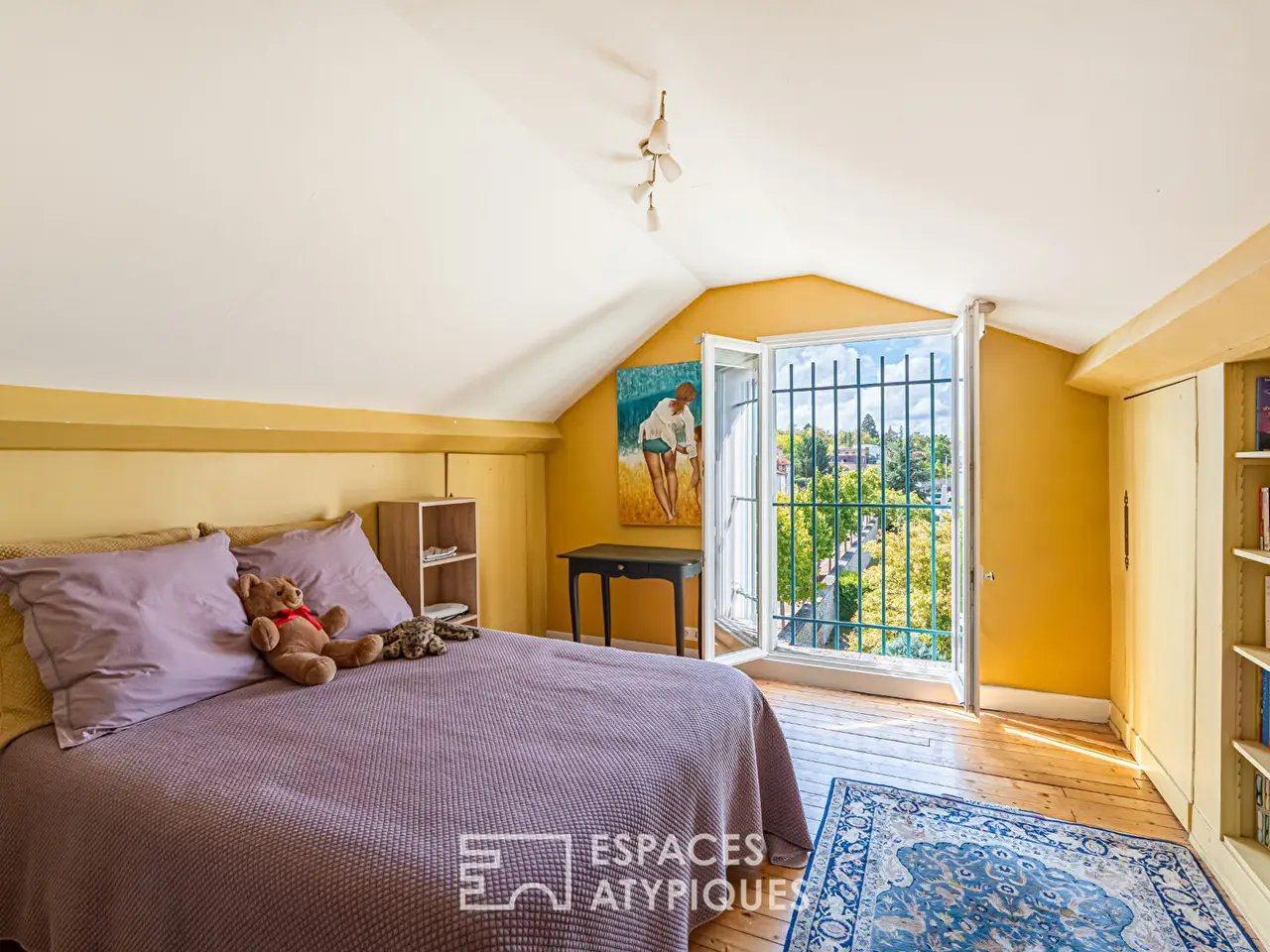 In a sought-after area, hidden from view, this pretty bourgeois house has benefited from a beautiful extension that opens onto a 722 sqm garden, enclosed and quiet. After a flight of steps, the wide entrance, decorated with cement tiles and old parquet flooring, offers a charming independent kitchen with triple exposure, then continuously, a 17 sqm bedroom which benefits from a shower room. The reception room of 44 sqm bathed in light, decorated with its fireplace, opens onto a large terrace surrounded by its garden beautifully arranged with flowers and shrubs subtly shaded. The lower level has a generous bedroom/workshop of 44 sqm facing its private terrace. This beautiful volume can easily be organized into a suite with its bathroom or into an office for an independent profession, with its exterior access. The first floor is organized around the landing which distributes three pretty bedrooms of 11, 12 and 17 sqm which share a bathroom. The last floor consists of a landing which leads to a large bedroom with storage of 23 sqm, an office and an attic games room of 18 sqm. Finally, the basement includes a boiler room, cellar and two storage rooms. The garden allows two above-ground parking spaces (electric terminal). A rare property, combining character, comfort and prime location, in a calm and green environment, in the immediate vicinity of many amenities. ENERGY CLASS: E / CLIMATE CLASS: E. Estimated average amount of annual energy expenditure for standard use, established from 2021 energy prices: between EUR5,040 and EUR6,880 Nursery and elementary schools 3 and 5 min walk away. N 13, A14 5 min by car, Tram 13 9 min on foot, International High School 9 min on foot, REF. 12700 Additional information * 8 rooms * 6 bedrooms * 1 bathroom * 1 bathroom * Outdoor space : 722 SQM * Parking : 2 parking spaces * Property tax : 3 294 € Energy Performance Certificate Primary energy consumption e : 278 kWh/m2.year High performance housing