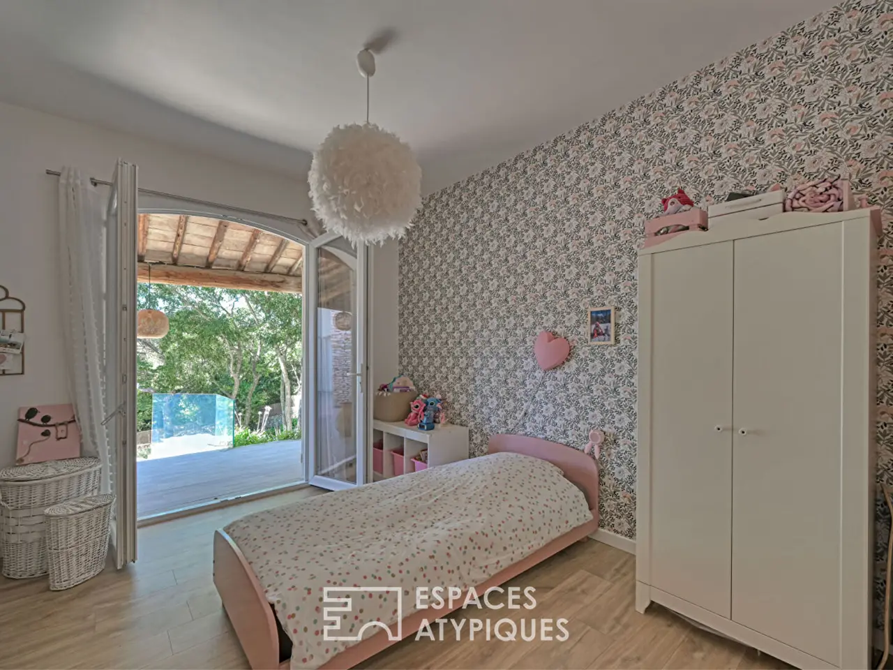 Just minutes from downtown Nimes, nestled on a hillside, a rare living environment. On a meticulously landscaped 3000 sqm plot, this fully renovated old house offers 220 sqm of elegance and comfort, in a serene and luminous atmosphere. Upon entering, the eye is drawn to the generous volumes and the fluid flow between the spaces. Stone, glass, and natural materials intertwine skillfully, creating an ambiance that is both warm and contemporary. The spacious living room, bathed in light thanks to large bay windows, opens onto a private terrace with panoramic views of the surrounding nature. The central fireplace and the attention paid to every decorative detail reinforce this feeling of well-being. The open, fully equipped kitchen extends this convivial living space, designed for entertaining. On the ground floor, two elegant bedrooms and a shower room welcome guests, while a master suite with a private bathroom offers an intimate and refined cocoon. Upstairs, a hotel-worthy suite, with a custom-made dressing room and a bathroom equipped with a whirlpool tub for two, invites absolute relaxation. Outside, the Mediterranean garden evokes a Provencal postcard, with its stone walls. Every corner has been designed to offer moments of calm or conviviality. A beautiful swimming pool completes this ensemble, accompanied by its pool house and a fully equipped summer kitchen. This villa perfectly combines character and modern comfort. It also features photovoltaic panels for better energy management, as well as four private parking spaces. This unique place is an invitation to slow down, to contemplate, to live fully. A rare house, designed as a refuge of beauty and light, just steps from all amenities. ENERGY CLASS B (107) / CLIMATE CLASS A (3) Estimated average amount of annual energy expenditure for standard use: between 1694 and 2292 euros/year Additional information * 6 rooms * 4 bedrooms * 2 bathrooms * 1 bathroom * Outdoor space : 2800 SQM * Parking : 4 parking spaces * Property tax : 3 850 € Energy Performance Certificate Primary energy consumption b : 107 kWh/m2.year High performance housing