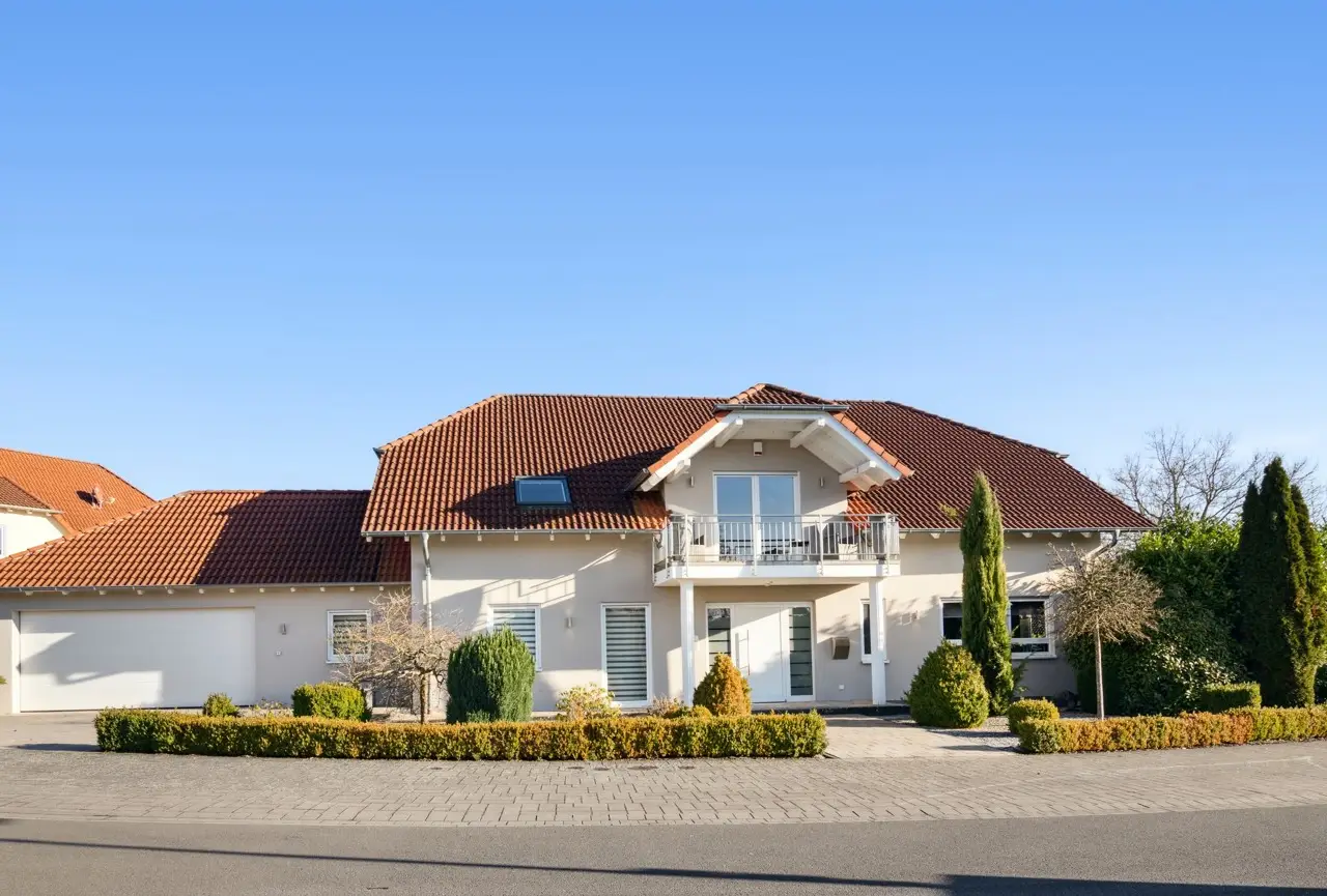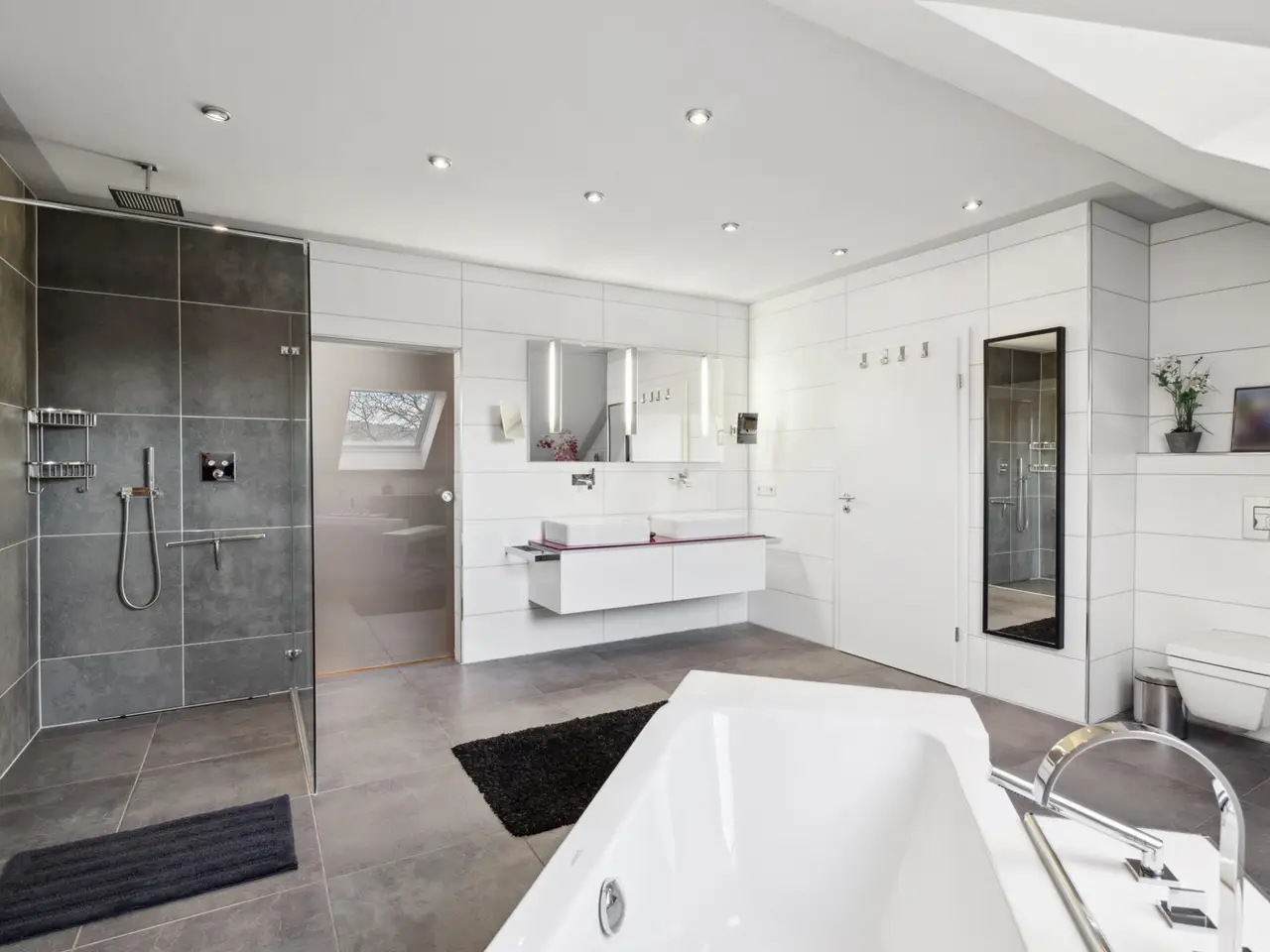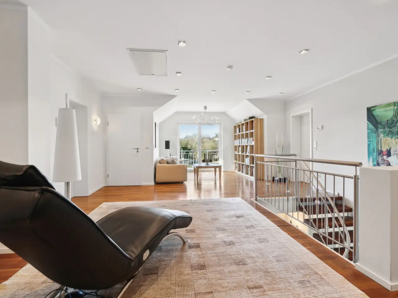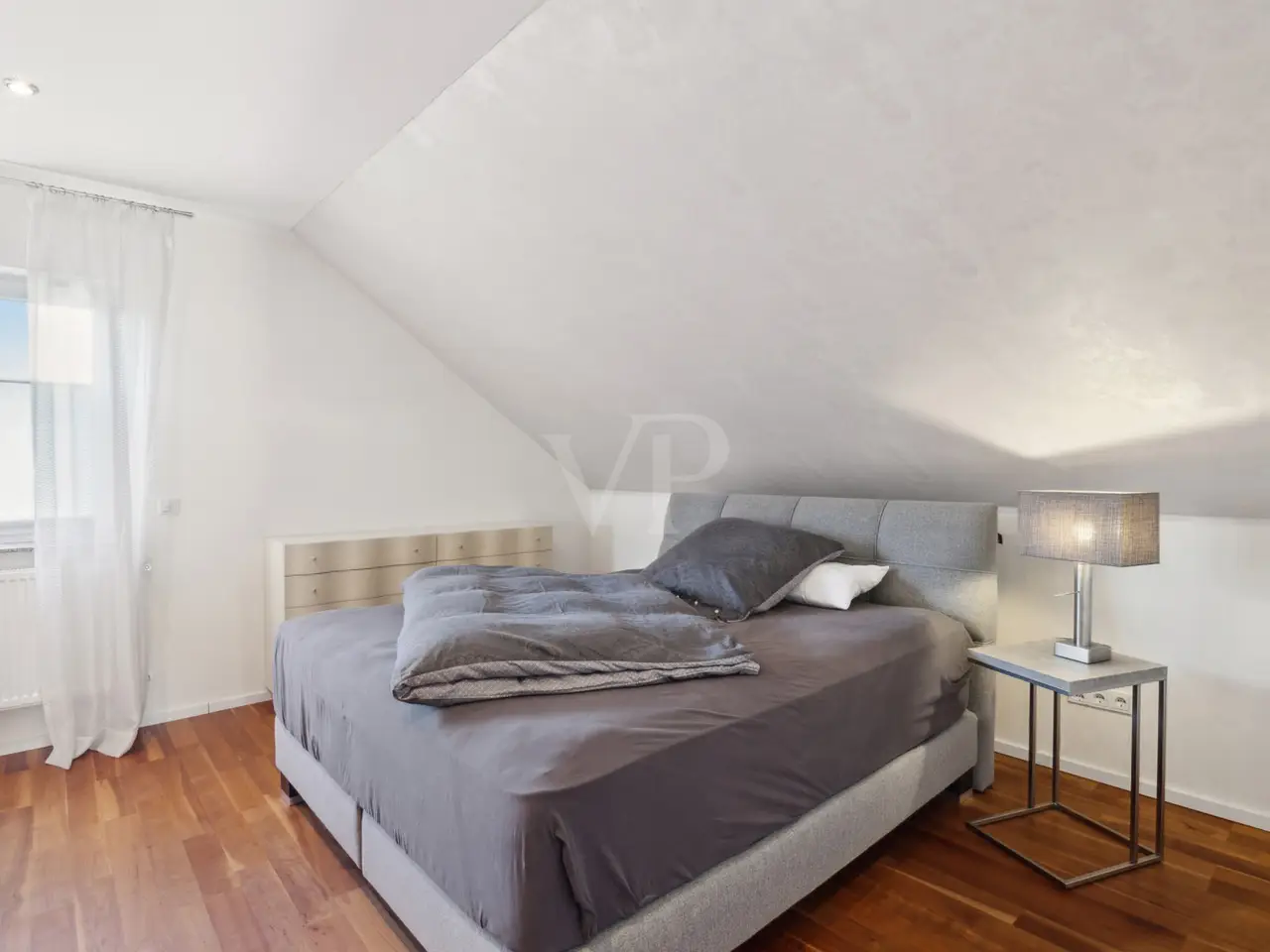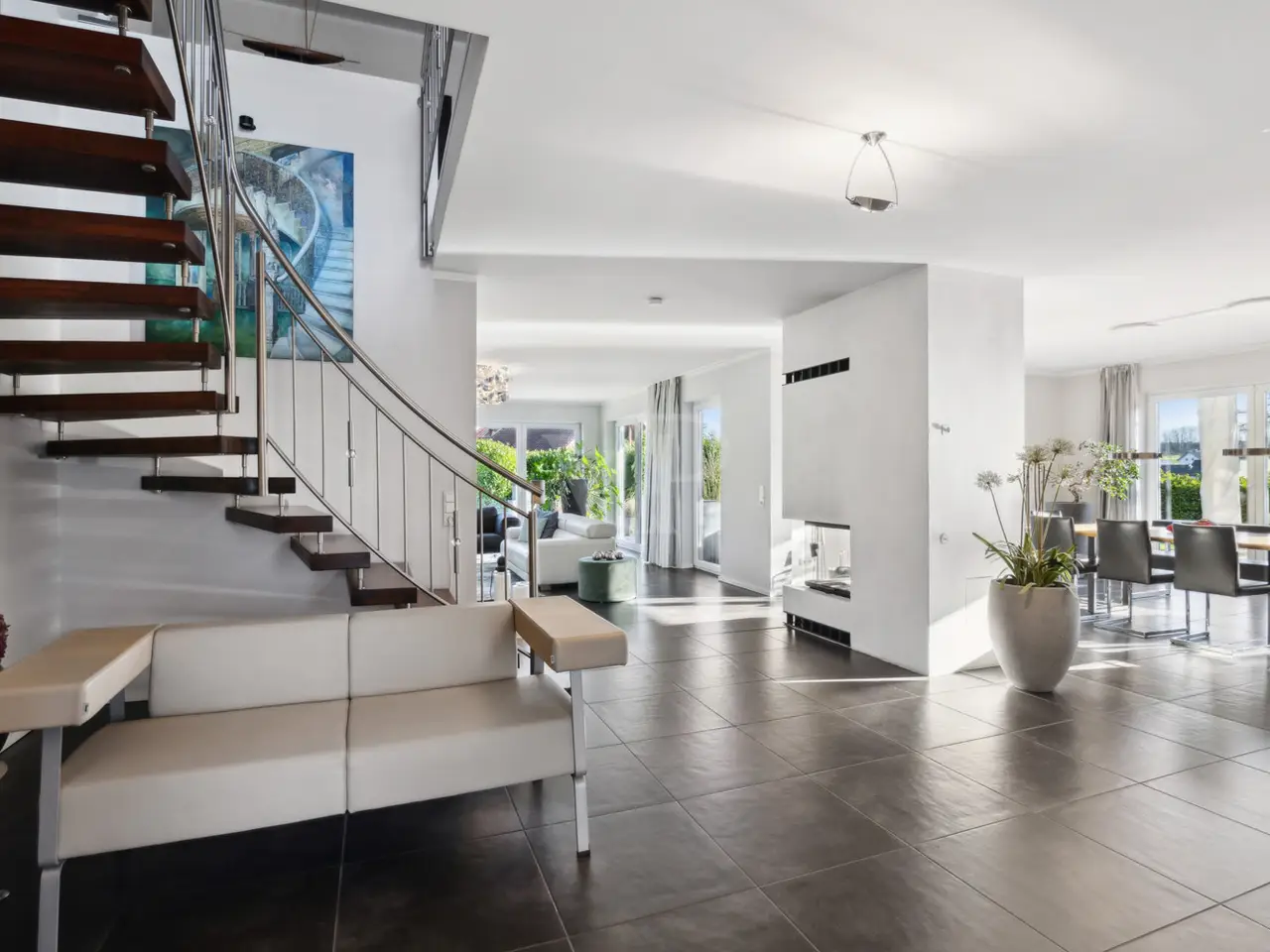This exclusive detached house from 2008 combines state-of-the-art living comfort with maximum elegance and luxury. With an impressive living space of approx. 322 m² on a beautifully landscaped corner plot of approx. 919 m², this property meets even the highest demands for a prestigious and stylish home. As soon as you enter the property, it becomes clear that no compromises have been made here: The prestigious entrance area impresses with high-quality materials and clear lines. It leads seamlessly into the open-plan living area, which is flooded with light thanks to floor-to-ceiling window fronts and offers a magnificent view of the lovingly designed garden. The elegant gray tiled floor combined with underfloor heating gives the room a modern, elegant touch. A particular highlight is the stylish fireplace, which serves as an elegant room divider between the living and dining areas. It harmoniously connects both areas and provides an additional aesthetic element. The exclusive designer kitchen sets new standards: with a generous cooking island, an induction hob, high-quality Siemens appliances and elegant surfaces, it is a real masterpiece that impresses both visually and functionally. The flowing transition to the dining area, which is stylishly illuminated by Occhio designer lights, makes this room the perfect place for culinary delights and convivial evenings. On the main level, a separate bedroom wing offers maximum privacy. The spacious bedroom has an adjoining dressing room, a luxurious shower room and direct access to a private terrace - the ideal retreat for quiet moments. A guest WC with exclusive fittings and a practical utility room complete this level in the vestibule. The upper floor of this dream property is a masterpiece of space and light. The gallery with its elegant reading corner and access to another balcony creates an atmosphere of tranquillity and inspiration. The luxurious master area comprises a spacious bedroom, a separate dressing room for him and her and a high-quality bathroom that leaves nothing to be desired. The free-standing designer bathtub, a walk-in rain shower and stylish double washbasins transform the bathroom into an exclusive wellness oasis. In addition, three further generously proportioned bedrooms offer a variety of uses, whether as a children's room, private office or fitness room. The garden area of this property is another highlight. The fully screened garden, surrounded by dense planting and elegant bamboo, offers absolute privacy and a luxurious ambience. The covered terrace invites you to relax and is the ideal place for stylish outdoor evenings or summer parties. There is a spacious double garage for vehicles, which is directly connected to the house. It offers space for two cars and additional storage space. The offer is complemented by two further parking spaces in front of the house. This detached house is the epitome of luxurious living. It combines a well thought-out room layout, state-of-the-art technology and high-quality fittings in an exclusive location. Experience living at the highest level and arrange a viewing today to see the uniqueness of this property for yourself.