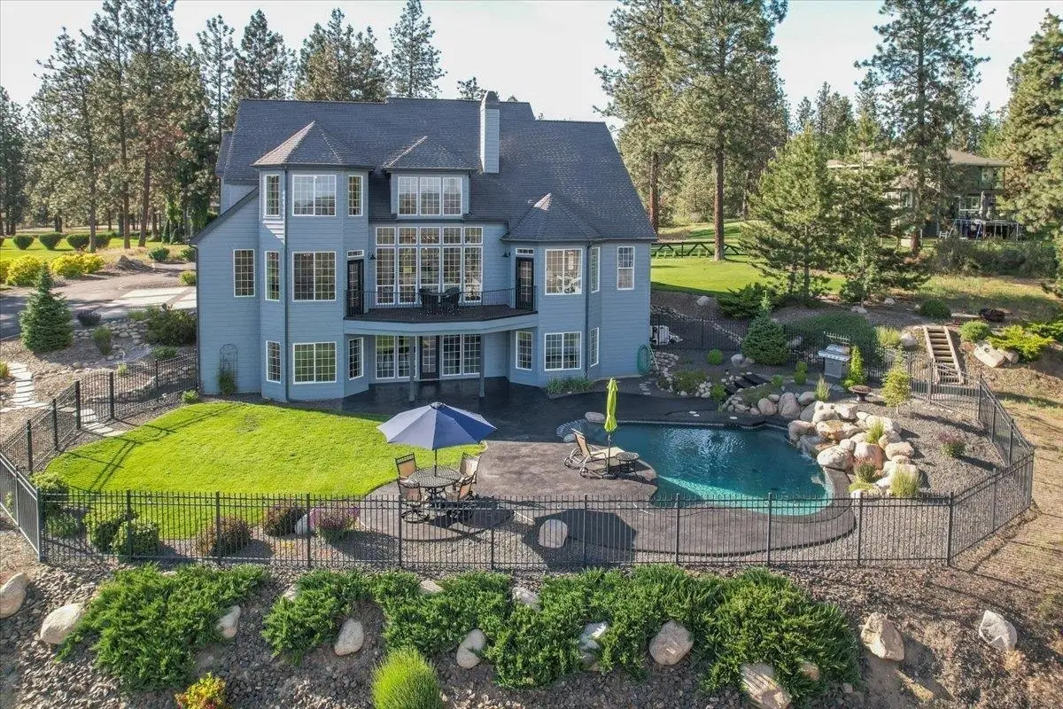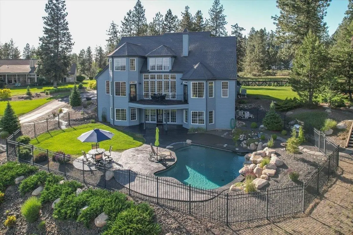 Custom built two-story with daylight walkout basement modern farmhouse style home on 1+ acre lot with an incredible lake view! There is so much to love in this home that has an open floor plan, floor to ceiling windows and newer LVP plank flooring. Solid alder wood doors. Spacious kitchen with granite counters, built-in gas range, new dishwasher and a huge island. Main floor primary suite with a walk-in closet and full bath. Formal dining room plus an office/library. Second floor features 3 bedrooms and 2 bathrooms along with a bonus play room over the garage. Lower level family room has a wet bar, workout room, plus a home theater room along with a 5th bedroom and bathroom. Wait there's more! A salt-water pool with a waterfall feature. 3-car oversized garage and plenty of driveway parking. Newer HVAC system (01/2025). HardiePlank siding & shake accent. All in a gated neighborhood with amazing views of Lake Spokane that's conveniently located to shopping, dining & an easy commute to Spokane.