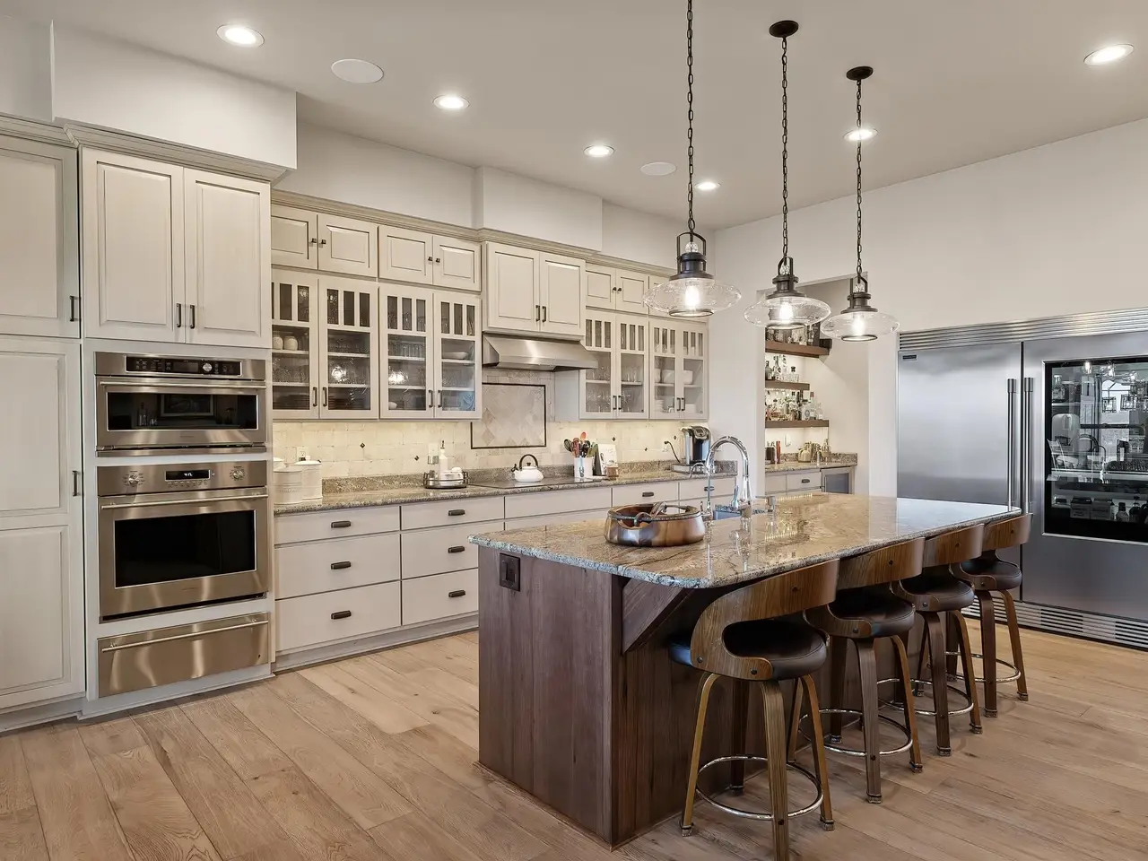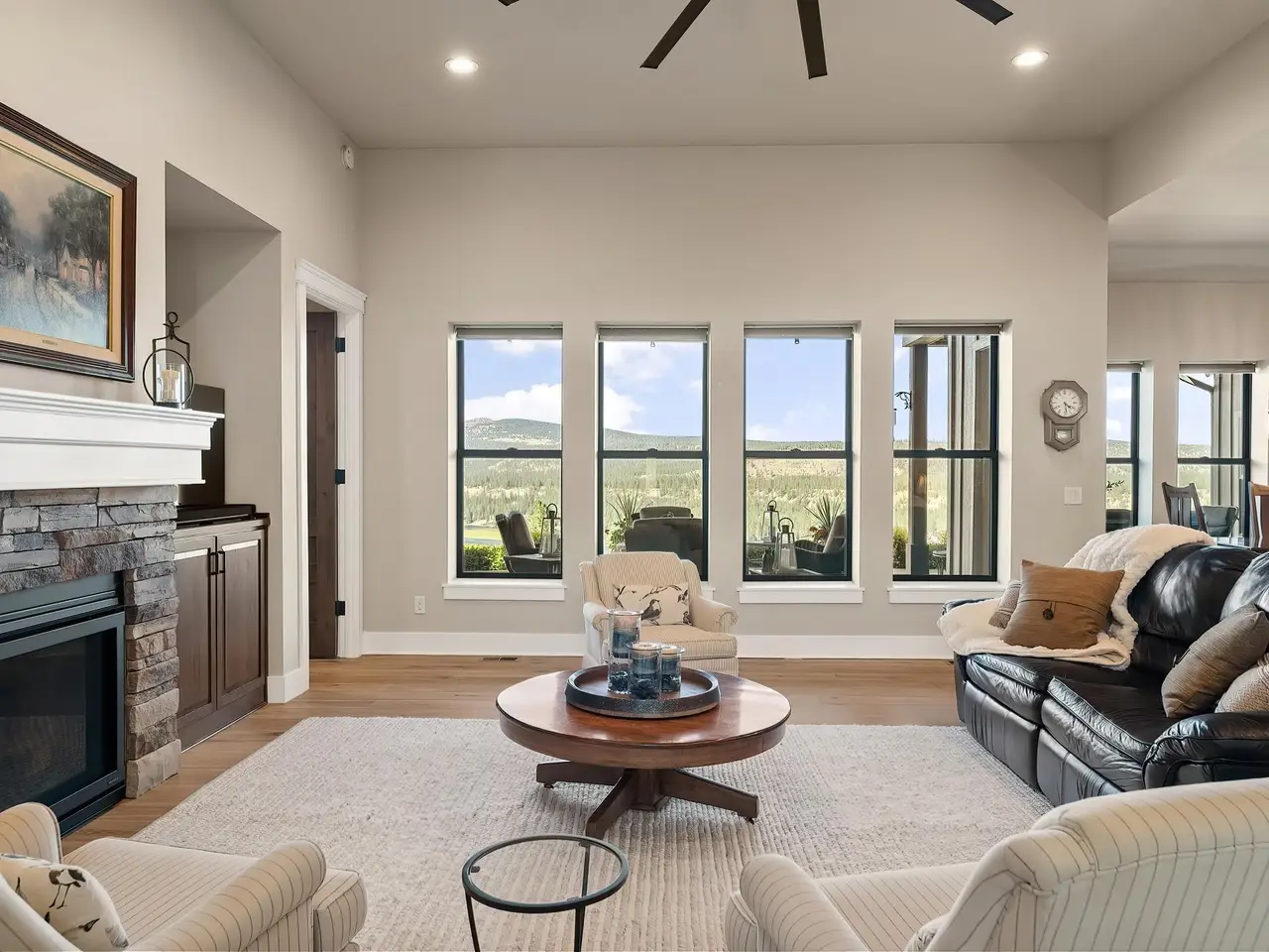There is so much to love about this stunning property with sweeping views of Lake Spokane & Mt. Spokane. This home features the BEST of everything with 4-bedrooms and 5 bathrooms. Enjoy 1-level living in this thoughtfully designed home with the primary suite and two additional en-suite bedrooms on the main floor, plus a stylish half bath for guests. Upstairs you'll find a spacious 416 sq ft retreat with its own half bath, perfect for a home office, art space, or guest suite. Featuring engineered wood floors, 8-foot knotty alder doors, 10 ft vaulted ceilings, hard surface counters throughout and high-end appliances including a Frigidaire Professional Series refrigerator/freezer, GE Monogram induction cooktop, convection oven/microwave & warming drawer. The chef's kitchen moves outdoors with a 36' built-in DCS barbecue grill, 2-burner gas cooktop & a large covered patio with stamped concrete. An oversized 2-car attached garage is complemented by a massive 40x60 shop w/ a 14-ft center door w/ space for a 35' RV.