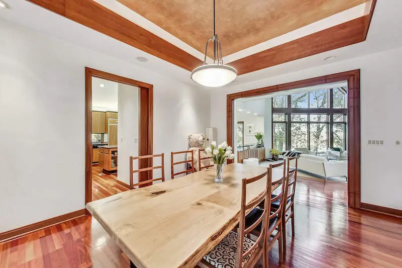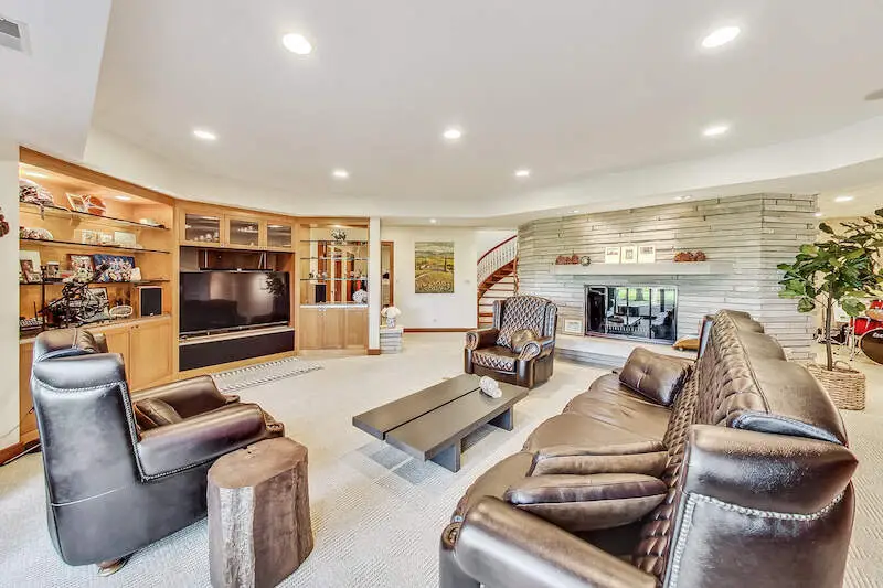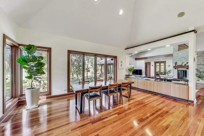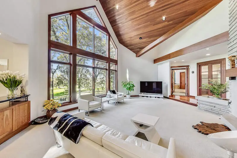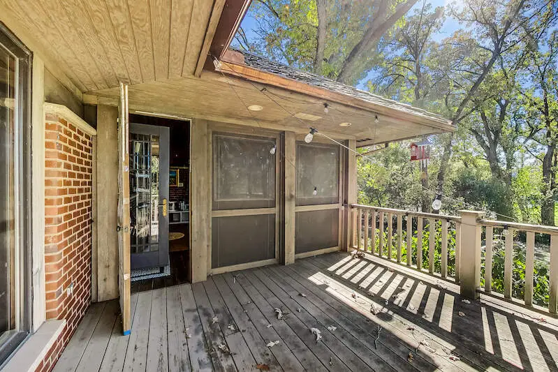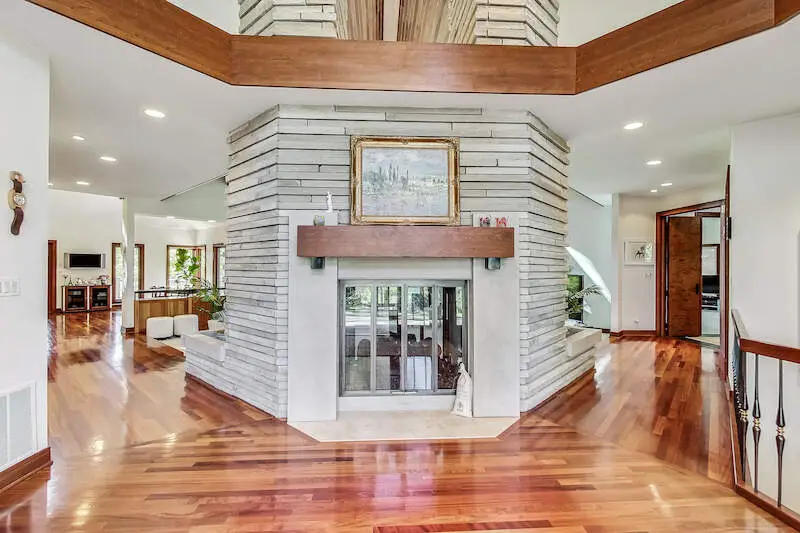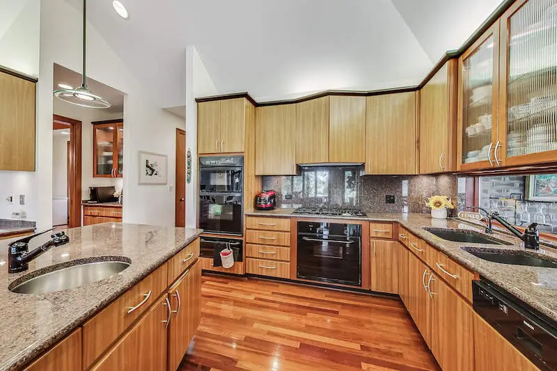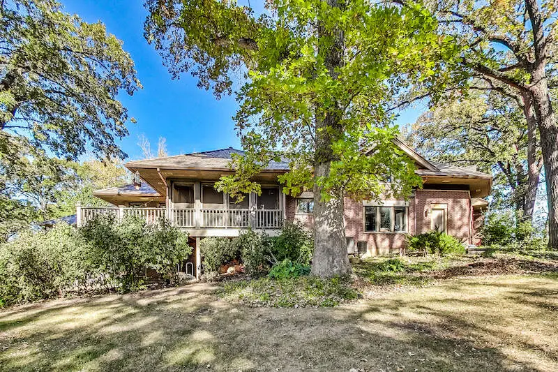 Designed by the talented and highly acclaimed architect, Ron McCormick. Iconic home situated on approximately 1.3 acres and overlooking the sweeping views of 16th fairway of Wynstone Golf Course. For those discriminating buyers desiring the finest of a unique custom built home with features including stone and woods incorporating the gorgeous oaks of outside and the contemporary oasis of the inside. One is welcomed by a dramatic entrance to almost 4000 square feet on the first floor! The layout and style of the home captures every aspect of the property. Ideal home for those seeking multi generational situation or more elegant and private guest space. Expansive primary suite on main level, blend of mid century and Frank Lloyd Wright tones in the kitchen, dining area, and great room with expensive flooring and wood touches. Upstairs provides the perfect guest quarters with living space, bedroom, and separate kitchenette area. The finished walkout emphasizes the openness of the home and highlights the floating staircase. Incredible spaciousness to entertain, enjoy the fine elements of the home, and the impressive property with towering trees. Recent HVAC replaced and one year new roof.