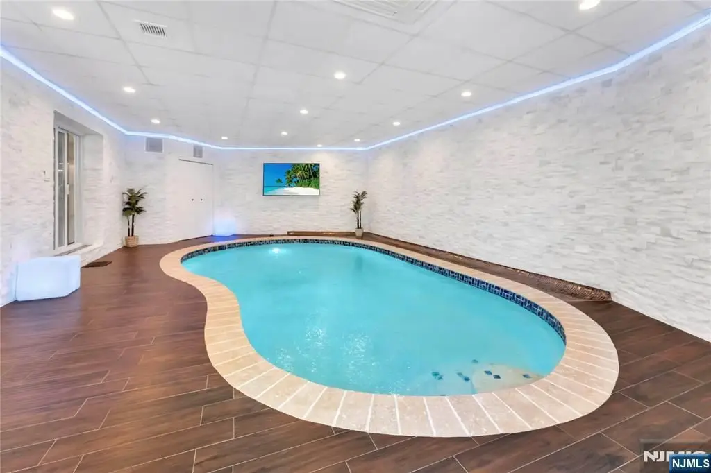 STUNNING SPANISH VILLA-STYLE ESTATE MILLION-DOLLAR SKYLINE VIEWS PRIVATE OASIS SPA RETREAT at the end of a private cul-de-sac, this fully renovated Spanish villa-style showpiece offers breathtaking skyline panoramas and million-dollar views from nearly every room. Nestled on beautifully tiered, exotically landscaped grounds with architectural lighting, it perfectly blends privacy with Mediterranean elegance.Step inside through a handcrafted pivoting front door into a grand living space featuring high, soaring wood-beamed ceilings, one of three dramatic stone fireplaces, and a flowing open floor plan. Entertain in the formal dining area and gourmet chef's kitchen with quartz counters, oversized island, pro-grade appliances, and access to three expansive, newly renovated outdoor decks with lighting.The first-floor primary suite is a private retreat with deck access, fireplace, dual walk-in closets, and a spa-inspired bath with soaking tub and Euro shower. Upstairs: a home office with balcony and en-suite guest suite. The showstopping lower level includes a year-round indoor saltwater pool, steam shower, 4 person jacuzzi, dry heat sauna, and a custom walnut waterfall bar with cast-iron accents overlooking the skyline. Topped with a custom re-designed red Spanish terra-cotta roof, state-of-the-art garage w/frosted glass doors, full-house generator, smart security, and ceiling-height custom patio doors/windows that bathe the home in natural light.
