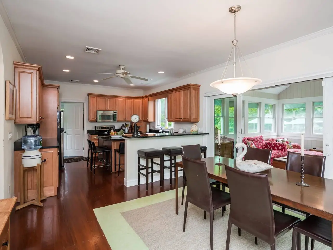 The perfect rental in a waterfront community in Sag Harbor/North Haven, just up the block from a wide span of east-facing bay beach for swimming, kayaking, fishing, and gorgeous sunrises. This well-appointed, light-filled traditional with privacy all around combines open common areas for entertaining with three en-suite bedrooms (including first and second level primary rooms); a bonus room with open views acts as a fourth bedroom, with convertible queen sofa and exterior entrance. Basement gym area with elliptical trainer, workout station, stationary bike; plus ping-pong table, and bring your own kayaks. Large deck overlooks rejuvenating saline, energy efficient solar heated pool. Two miles from Sag Harbor Village and Long Beach, North Haven Village offers community tennis, basketball court, and brand new playground a block away at Village Hall.