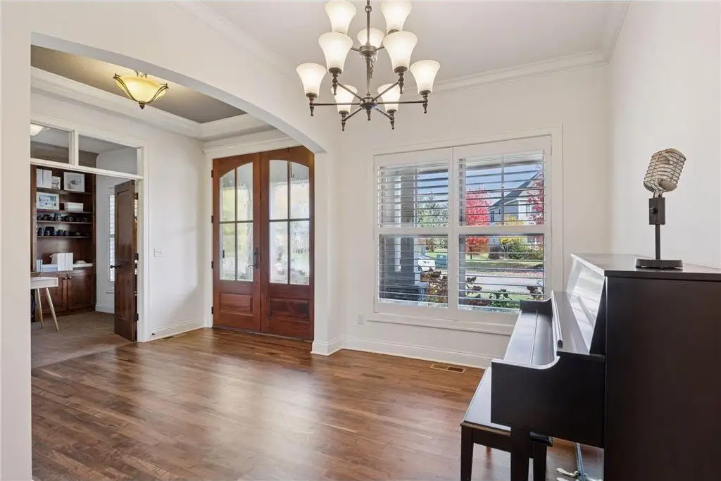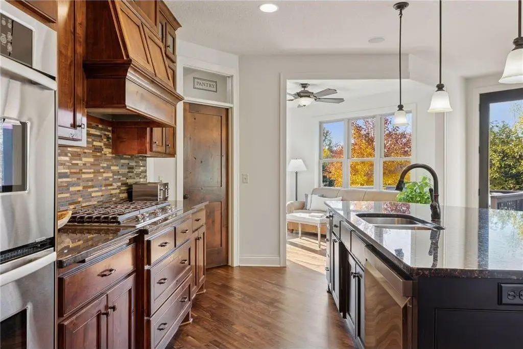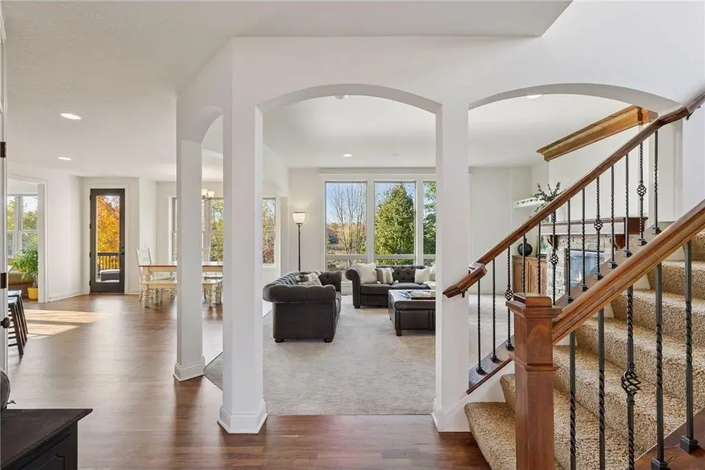 This exceptional North Oaks home offers timeless craftsmanship, luxurious finishes, and serene pond views - perfectly combining elegance & everyday comfort. Enter the main level to rich walnut wood floors that flow into the Great Room through graceful arched entryways. The Great Room features knotty alder built-in cabinetry, a stone-hearth gas fireplace, and tall windows overlooking the backyard & pond. A Sun Room & Informal Dining area flow seamlessly from the Kitchen, which boasts a large slate-gray island, knotty alder cabinetry, granite counters, stainless double oven, gas cooktop with commercial-grade hood, built-in microwave & a spacious walk-in pantry. The formal Dining Room includes a granite-topped enamel buffet set with a stunning arched niche, and a private Office offers knotty alder wood built-ins. Step out to the Deck off the Informal Dining area for outdoor living. Upstairs, you'll find four bedrooms include a luxurious Primary Suite boasting dual vanities, a soaking tub with pond views, large tiled walk-in shower with bench & double shower head, and a oversized walk-in closet. Bedrooms 2 & 3 share a Jack-and-Jill Bath with dual sinks and separate tub/toilet area; Bedroom 4 has its own private ¾ Bath. A spacious Laundry Room with sink & folding area completes the upper level. The finished walk-out basement is ideal for entertaining with a full Wet Bar featuring seating, granite counters, knotty alder cabinets & wine rack, Game/Billiard Room, Family Room with stone-hearth fireplace, an Exercise Room convertible to a 6th Bedroom, plus a 5th Bedroom & a Full Bath. The expansive, flat backyard opens to trees & pond vistas. Residents enjoy the Rapp Farm sub-association pool and pool house, plus North Oaks’ private walking trails, tennis courts, sports fields, parks, lakes & beach. Combining refined materials, flowing spaces, and exceptional craftsmanship, this home offers luxury living in a truly picturesque setting. Within Mounds View schools, too!