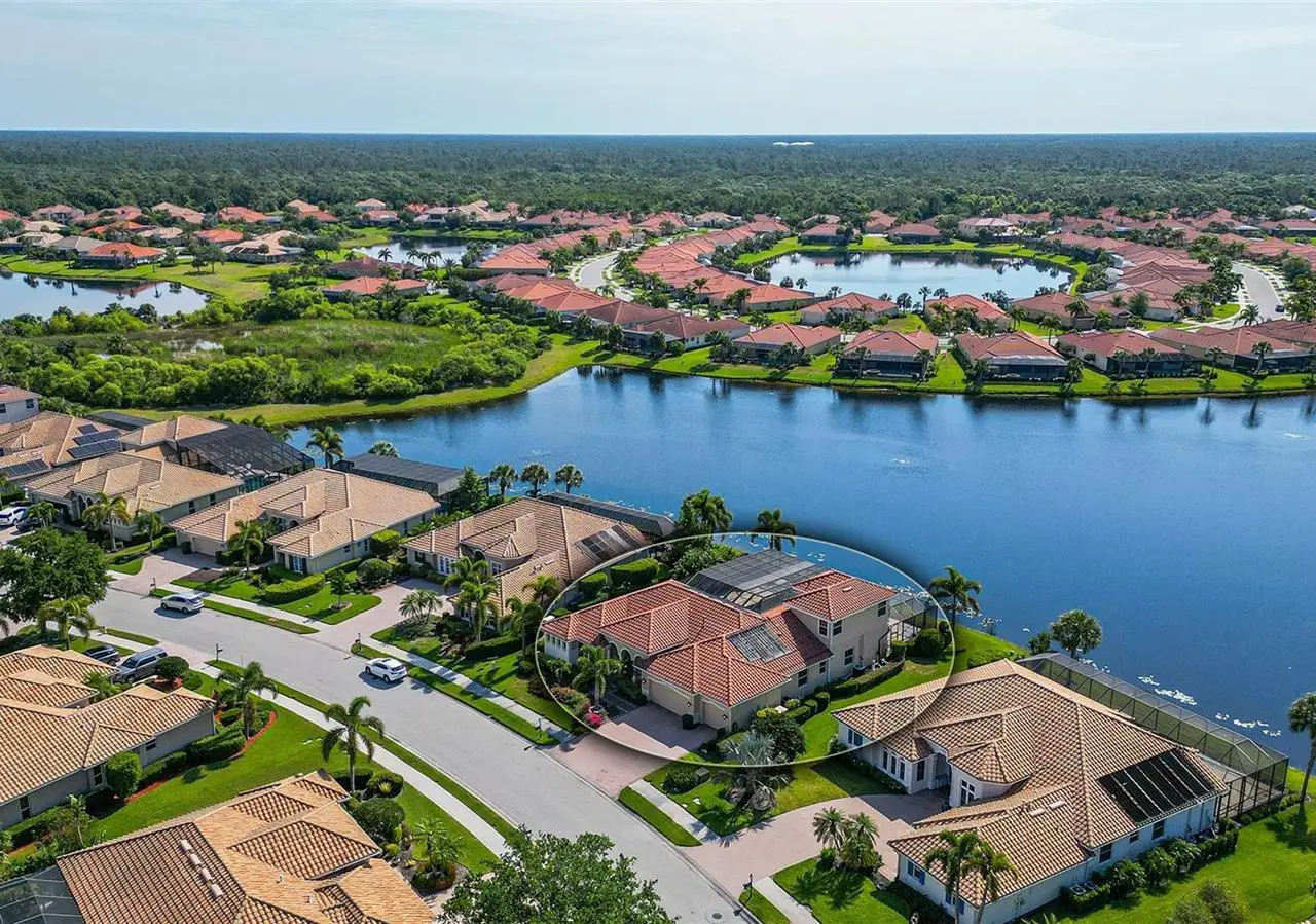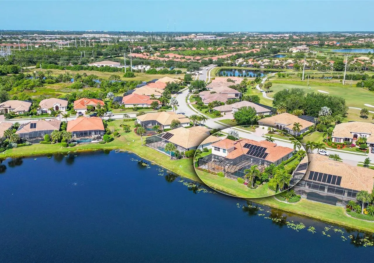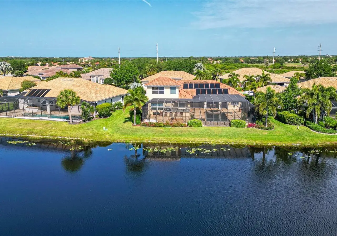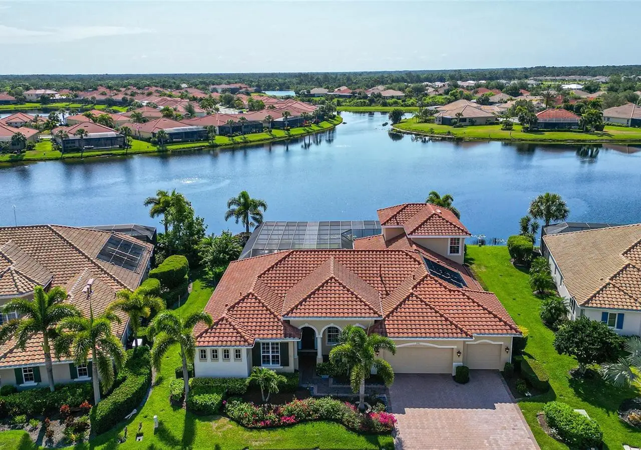 This is a WOW! You will ooh and ahh when you enter this elegant home. Prime lakefront lot with expansive views. The infinity saltwater pool literally flows into the lake and is heated with solar, gas & electric. The chef's kitchen features granite counters, island, breakfast bar, eat-in kitchen area with aquarium window, 6 burner gas stove top, Advantium oven/microwave, convection oven and warming tray, separate ice maker, 42' side-by-side refrigerator, two Bosch dishwashers. All bedroom closets have custom wood shelving. Master bedroom offers an additional sitting/exercise area. Master bath boasts a Jacuzzi tub, dual shower heads, double sinks & tile accents. The Den/library has gorgeous wood built in book cases. You will enjoy all the columns, crown molding, high end ceiling fans, tray ceilings, central vac, beautiful wood flooring, plantation shutters, hurricane shutters or impact windows throughout plus a whole house Generac gas generator with warranty. Barn door separates 2 of the bedrooms and bath. Upgraded A/C unit with air scrubber, electronic Air filtration system, & UV Bulb. Omnilogic Pool control system plus an autofill system. Whole house power cleaner and surge protector. 3 car garage with epoxy coating will hold all your toys & overhead storage. 24/7 security guard at gate. The golf club membership is separate and not required. Including a heated pool, a lap pool, tennis courts, fitness courts, restaurant and boardwalk down to the river. CDD fee is included in the tax amount. Minutes to beaches shopping, banking, restaurants & more. Truly a must see.