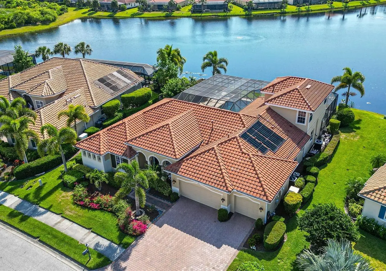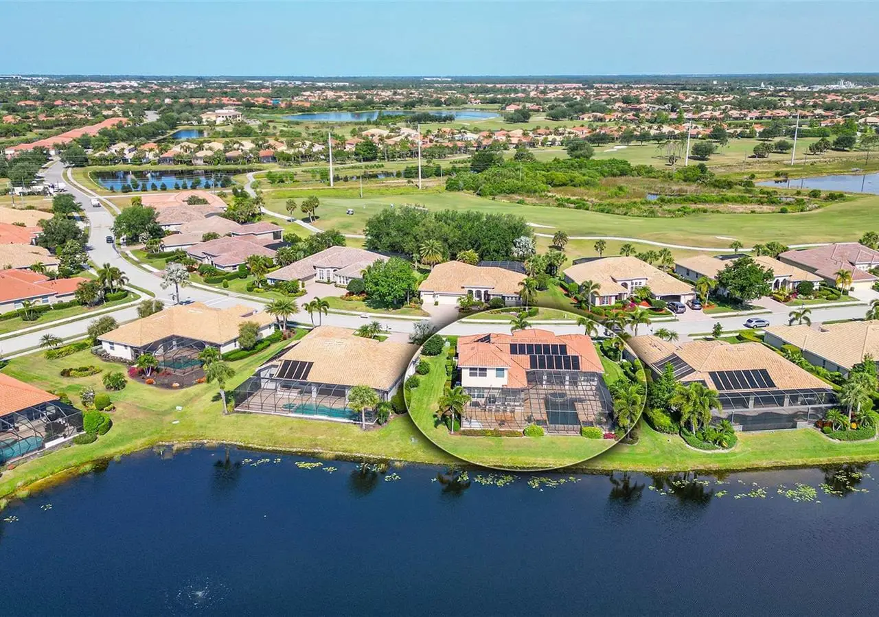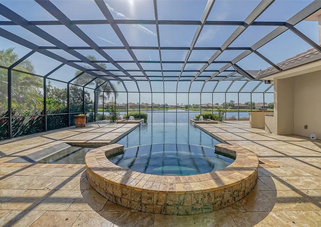 This is a WOW! You will ooh and ahh when you enter this elegant home. Prime lakefront lot with expansive views. The infinity saltwater pool literally flows into the lake and is heated with solar, gas & electric. The chef's kitchen features granite counters, island, breakfast bar, eat-in kitchen area with aquarium window, 6 burner gas stove top, Advantium oven/microwave, convection oven and warming tray, separate ice maker, 42' side-by-side refrigerator, two Bosch dishwashers. All bedroom closets have custom wood shelving. Master bedroom offers an additional sitting/exercise area. Master bath boasts a Jacuzzi tub, dual shower heads, double sinks & tile accents. The Den/library has gorgeous wood built in book cases. You will enjoy all the columns, crown molding, high end ceiling fans, tray ceilings, central vac, beautiful wood flooring, plantation shutters, hurricane shutters or impact windows throughout plus a whole house Generac gas generator with warranty. Barn door separates 2 of the bedrooms and bath. Upgraded A/C unit with air scrubber, electronic Air filtration system, & UV Bulb. Omnilogic Pool control system plus an autofill system. Whole house power cleaner and surge protector. 3 car garage with epoxy coating will hold all your toys & overhead storage. 24/7 security guard at gate. The golf club membership is separate and not required. Including a heated pool, a lap pool, tennis courts, fitness courts, restaurant and boardwalk down to the river. CDD fee is included in the tax amount. Minutes to beaches shopping, banking, restaurants & more. Truly a must see.