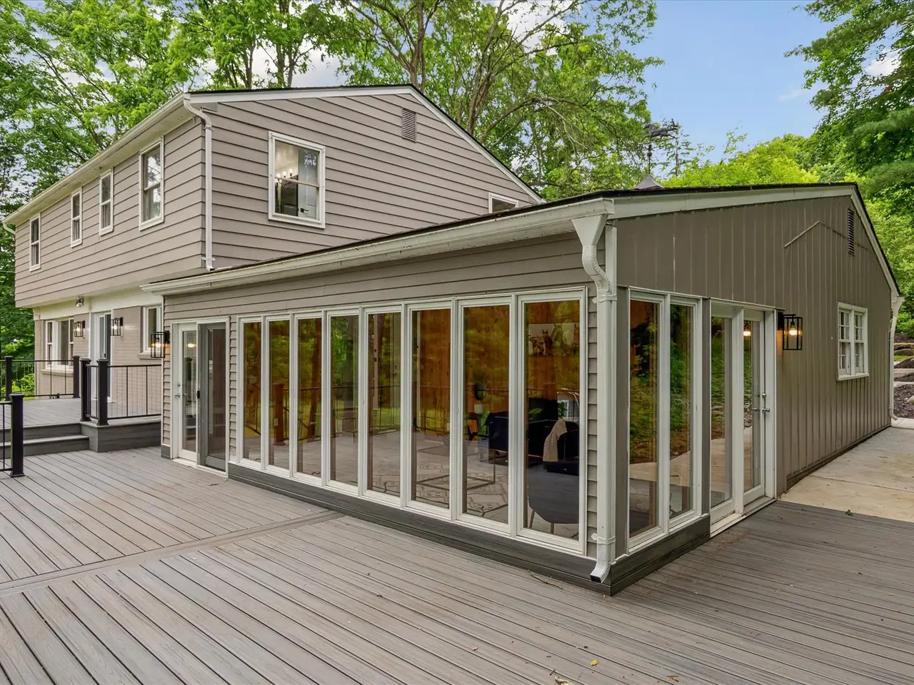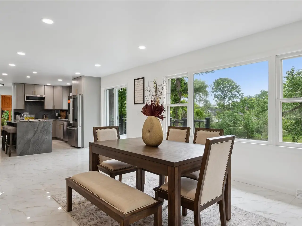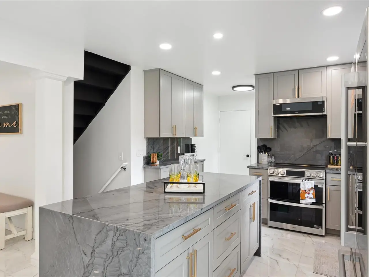 - Custom chef's kitchen with quartz countertops and stainless steel appliances