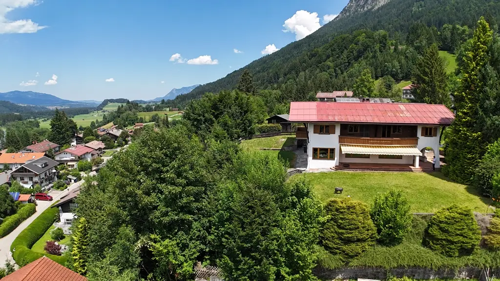 In one of the most sought-after and at the same time rarest locations that Oberstdorf has to offer, this detached house presents itself as a real gem - a property that only comes on the market once in a generation. The address "Am First" is already one of the village's premium locations per se, but this property occupies an absolute top position among them. In the middle of the exclusive residential areas "Plattenbichl" and "Am First", this property stands out as a top location - with an unobstructable panorama, absolute tranquillity and a plot size that is hard to find today. The special atmosphere greets you as soon as you enter: stylish architecture, lovingly preserved elements from the 1959 construction year and a condition that impresses with continuous maintenance and high-quality modernization. The exterior is characterized by mature structures and an elegance that is never loud, but always present. The property offers breathtaking views of the surrounding mountains - including unobstructed views of the ski jump - while at the same time offering absolute privacy. The spacious outdoor seating areas on both floors have been designed with a keen sense of orientation and panorama and invite you to linger at any time of day. The interior of the house is characterized by fine materials, extraordinary details and furnishings that are above average even for the year of construction. High-quality parquet flooring (partly in a herringbone pattern), elaborate solid wood ceilings, coffered ceilings and well thought-out fixtures run through the entire house. Windows and shutters have been continuously modernized - the stylish folding shutters on the upper floor in particular underline the charming overall appearance. With three bedrooms and three bathrooms on two floors, the room layout offers an ideal setting for families, guests or retreats. Particularly noteworthy is the integrated wellness area with sauna, large shower and relaxation zone - an oasis of relaxation with direct access to the outdoor seating area. The technical infrastructure has been extensively renovated and future-proofed: a modern pellet heating system was installed just last year - a reliable and efficient heating system with generous buffer storage. In addition, the basement area was professionally protected and structurally upgraded to ensure a dry, stable indoor climate - discreetly and sustainably implemented without visibly interfering with the fabric of the building. The garage is directly connected to the house, heated and accessible via a garage forecourt, which is also suitable as an additional parking space. This property is not just a house - it is a rare piece of Oberstdorf living culture that offers its new owners much more than just a home: a retreat, a center of life, a place for lasting memories. Such properties are not usually sold - they are inherited. The fact that it is now coming onto the market is a unique opportunity for lovers of exclusive properties in exceptional locations. An offer of exceptional quality - for people who are looking for something special and appreciate the rare.