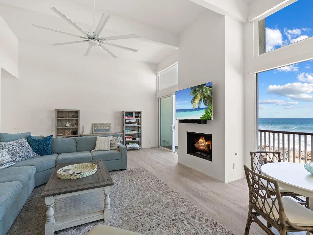Oceanfront Townhome with Unrivaled White Water Views! Perfectly positioned in a quaint 13-unit oceanfront community, this 3 bed, 2.5 bath townhome offers panoramic, uninterrupted white water views and the rare luxury of the complex’s private sandy beach with firepit just steps from your door. At 1,860 square feet, this end-unit feels like a standalone home, with no one above or below and direct access into a private two-car garage. The home was thoughtfully remodeled in 2020 with a clean, coastal esthetic featuring ceramic plank flooring, refreshed bathrooms, an updated kitchen with new appliances and gas cooking, all-new windows, and fully redone plumbing. Enjoy ocean views from nearly every angle, whether you're gathered around the fireplace in the soaring living room, entertaining from the elevated kitchen and dining area, or relaxing on your private oceanfront deck. The primary suite offers space and privacy, while two additional ocean-view bedrooms make hosting a breeze. The home is offered fully furnished and turnkey ready for you to move in and enjoy the beach life from day one. Located in a highly walkable pocket of Oceanside, you're just steps to Buccaneer Cafe and minutes to downtown’s newest restaurants, trendy coffee shops, and the iconic Oceanside pier. Whether you're looking for a refined second home or the perfect year-round beach escape, this is a rare opportunity to own oceanfront in one of North County's most coveted locations.