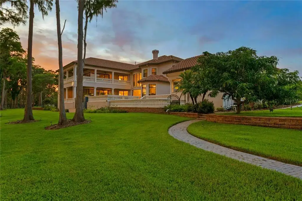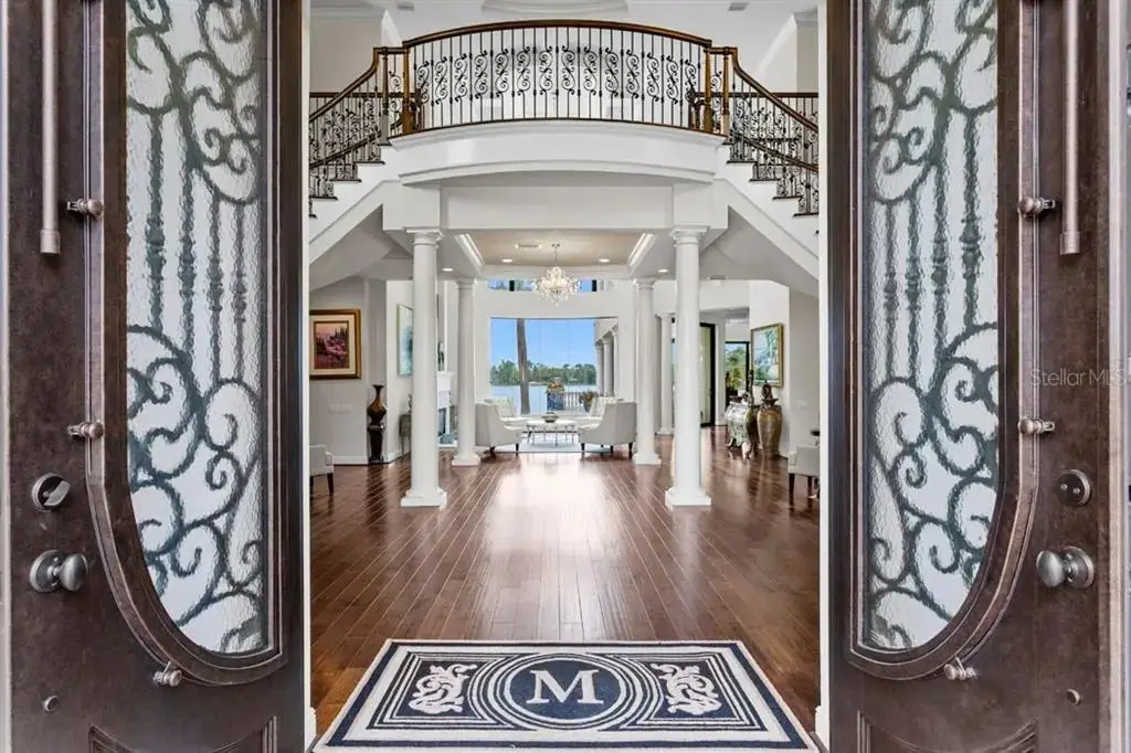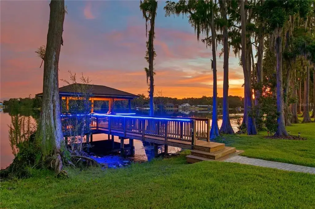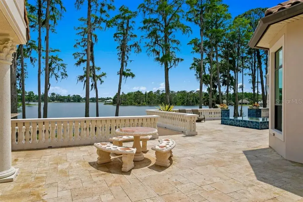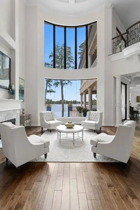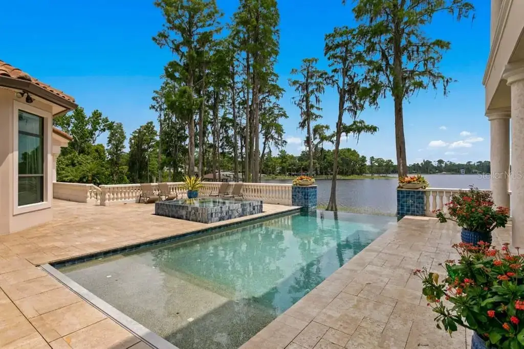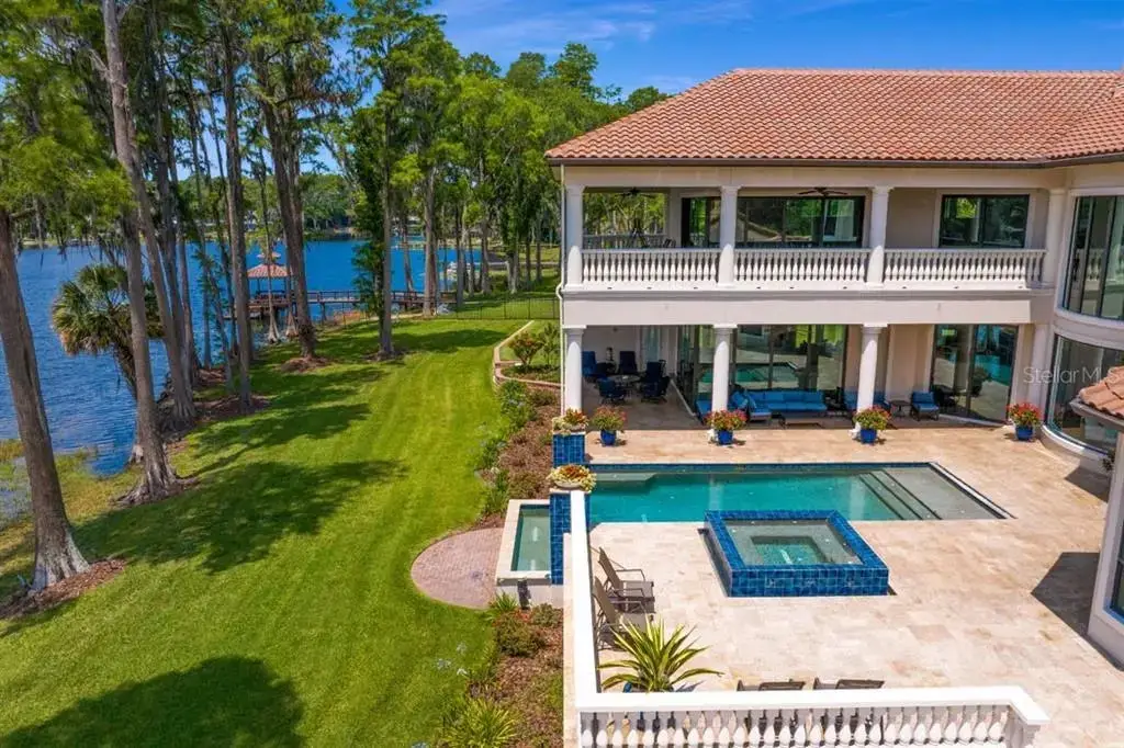 Gated lakefront estate offering space, privacy, and a stunning natural setting—17124 Crawley Road in Odessa is a rare opportunity to live expansively on nearly 6 acres along the tranquil shoreline of Rainbow Lake. With 300 feet of private lake frontage, this custom residence offers 10,545 square feet of living space. Built for both comfort and entertaining, the main house includes 5 bedrooms, 6 full baths, 2 half baths, entertainment space, gym, study, and 2 attached garages—one on each side of the home—designed for convenience and symmetry. Separate guest house features 1 bedroom and 1 full bath. The estate is finished with a pool, spa, and private dock—all with no HOA or CDD fees. Step through the grand double doors into a sweeping foyer with a dramatic double staircase. Straight ahead, the formal living room welcomes you with nearly 24-foot ceilings, gas fireplace, and open view to the pool and lake beyond. The spacious family room serves as a relaxed space with TV, electric fireplace, and sliding glass doors that lead seamlessly to the outdoor terrace. At the heart of the home, the kitchen is both stylish and functional—featuring a striking Cianitus granite island and Cambria Menai quartz on the perimeter, along with a gas range with 1.5 ovens, a separate wall oven, pot filler, microwave and refrigerator, and thoughtful storage. Nearby butler’s pantry with granite countertops and wine refrigerator connects the kitchen to the formal dining room, ideal for entertaining or daily living. Downstairs also includes a primary suite with a fireplace and sitting area, dual custom closets, and a spa-style bath with freestanding tub and oversized walk-in shower. 2 additional ensuite bedrooms are located on the main level. A dedicated study with soaring ceilings and separate gym complete the thoughtful main-level layout. Upstairs, 2 large suites offer the flexibility of dual primary bedrooms, each with its own full bath and walk-in closet. Just beyond, a large entertainment area includes a sunken game room, wet bar with refrigerator, and balcony with balustrades—perfect for entertaining or relaxing. Throughout the home, 8-foot doors, wood flooring, detailed crown and tray ceilings, and custom-finished walk-in closets in every bedroom enhance the design, while both upstairs and downstairs laundry rooms and electric vehicle charging station in the garage add everyday convenience. The separate guest cabana offers a refined yet relaxed extension of the home’s living space. Located just off the pool, it includes a built-in TV, crown and tray ceilings, and walk-in closet, along with full bath and bar with refrigerator. The grounds are the heart of this property. Designed by Ryan Hughes Design Build, the outdoor spaces are a blend of texture, scale, and serenity. Stacked stone retaining walls, lush gardens, fruit trees, and paver walkways surround a heated saltwater pool and spa, fire pit, covered terrace, full summer kitchen, and a separate outdoor full bath for added convenience. At the water’s edge, a private dock features electricity and nautical rope detailing, offering direct access to Rainbow Lake. Located in the heart of Odessa—where luxury homes, wide-open spaces, and natural beauty converge—this estate captures the essence of lakefront living with the convenience of being just minutes from Tampa, major roadways, and top-tier amenities. A rare opportunity to live expansively, privately, and beautifully.