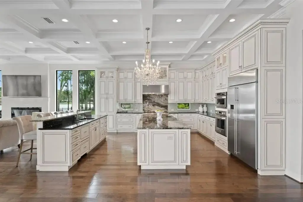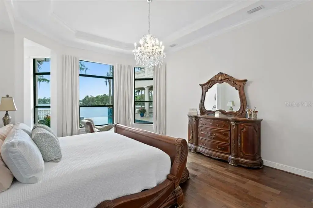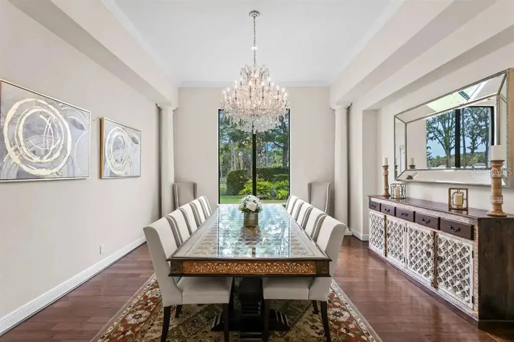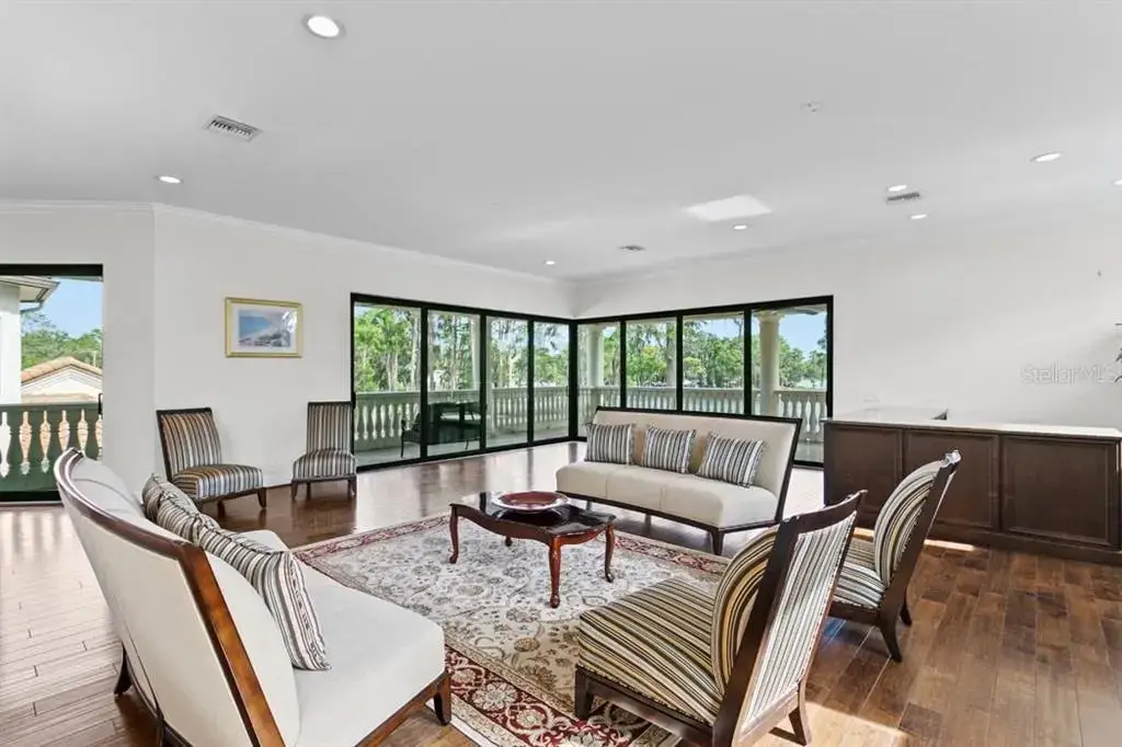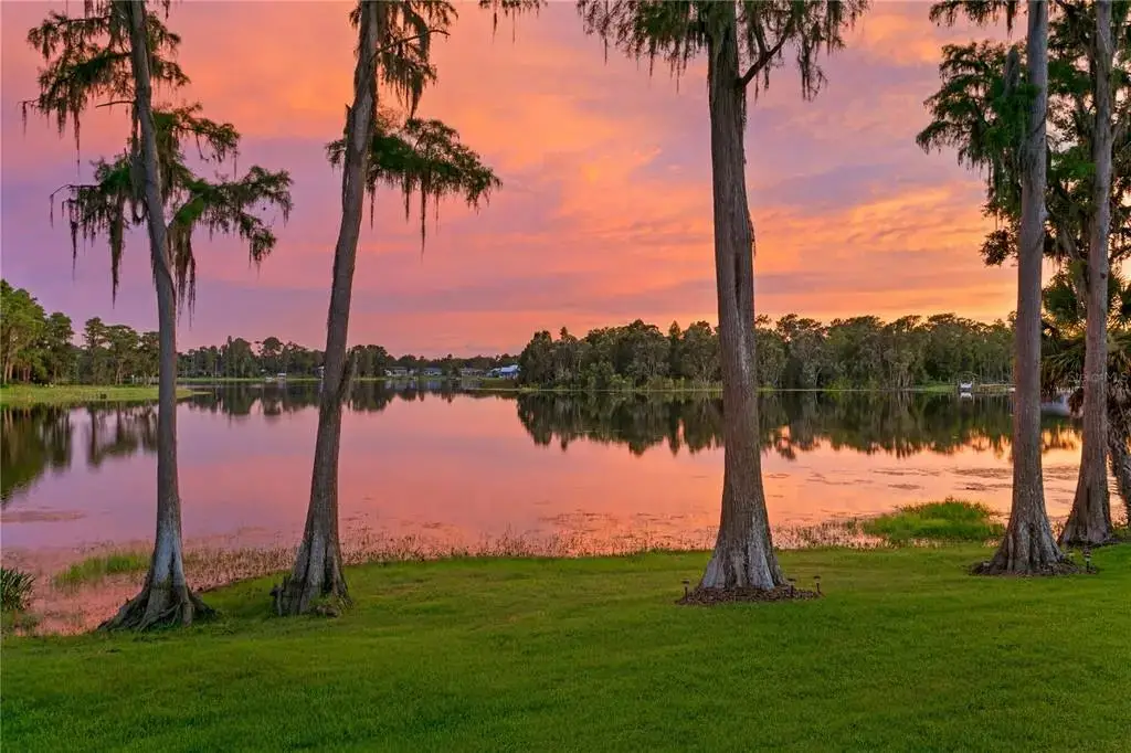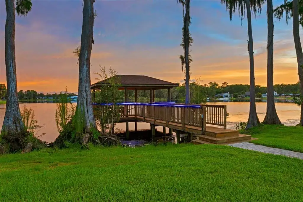 Gated lakefront estate offering space, privacy, and a stunning natural setting—17124 Crawley Road in Odessa is a rare opportunity to live expansively on nearly 6 acres along the tranquil shoreline of Rainbow Lake. With 300 feet of private lake frontage, this custom residence offers 10,545 square feet of living space. Built for both comfort and entertaining, the main house includes 5 bedrooms, 6 full baths, 2 half baths, entertainment space, gym, study, and 2 attached garages—one on each side of the home—designed for convenience and symmetry. Separate guest house features 1 bedroom and 1 full bath. The estate is finished with a pool, spa, and private dock—all with no HOA or CDD fees. Step through the grand double doors into a sweeping foyer with a dramatic double staircase. Straight ahead, the formal living room welcomes you with nearly 24-foot ceilings, gas fireplace, and open view to the pool and lake beyond. The spacious family room serves as a relaxed space with TV, electric fireplace, and sliding glass doors that lead seamlessly to the outdoor terrace. At the heart of the home, the kitchen is both stylish and functional—featuring a striking Cianitus granite island and Cambria Menai quartz on the perimeter, along with a gas range with 1.5 ovens, a separate wall oven, pot filler, microwave and refrigerator, and thoughtful storage. Nearby butler’s pantry with granite countertops and wine refrigerator connects the kitchen to the formal dining room, ideal for entertaining or daily living. Downstairs also includes a primary suite with a fireplace and sitting area, dual custom closets, and a spa-style bath with freestanding tub and oversized walk-in shower. 2 additional ensuite bedrooms are located on the main level. A dedicated study with soaring ceilings and separate gym complete the thoughtful main-level layout. Upstairs, 2 large suites offer the flexibility of dual primary bedrooms, each with its own full bath and walk-in closet. Just beyond, a large entertainment area includes a sunken game room, wet bar with refrigerator, and balcony with balustrades—perfect for entertaining or relaxing. Throughout the home, 8-foot doors, wood flooring, detailed crown and tray ceilings, and custom-finished walk-in closets in every bedroom enhance the design, while both upstairs and downstairs laundry rooms and electric vehicle charging station in the garage add everyday convenience. The separate guest cabana offers a refined yet relaxed extension of the home’s living space. Located just off the pool, it includes a built-in TV, crown and tray ceilings, and walk-in closet, along with full bath and bar with refrigerator. The grounds are the heart of this property. Designed by Ryan Hughes Design Build, the outdoor spaces are a blend of texture, scale, and serenity. Stacked stone retaining walls, lush gardens, fruit trees, and paver walkways surround a heated saltwater pool and spa, fire pit, covered terrace, full summer kitchen, and a separate outdoor full bath for added convenience. At the water’s edge, a private dock features electricity and nautical rope detailing, offering direct access to Rainbow Lake. Located in the heart of Odessa—where luxury homes, wide-open spaces, and natural beauty converge—this estate captures the essence of lakefront living with the convenience of being just minutes from Tampa, major roadways, and top-tier amenities. A rare opportunity to live expansively, privately, and beautifully.