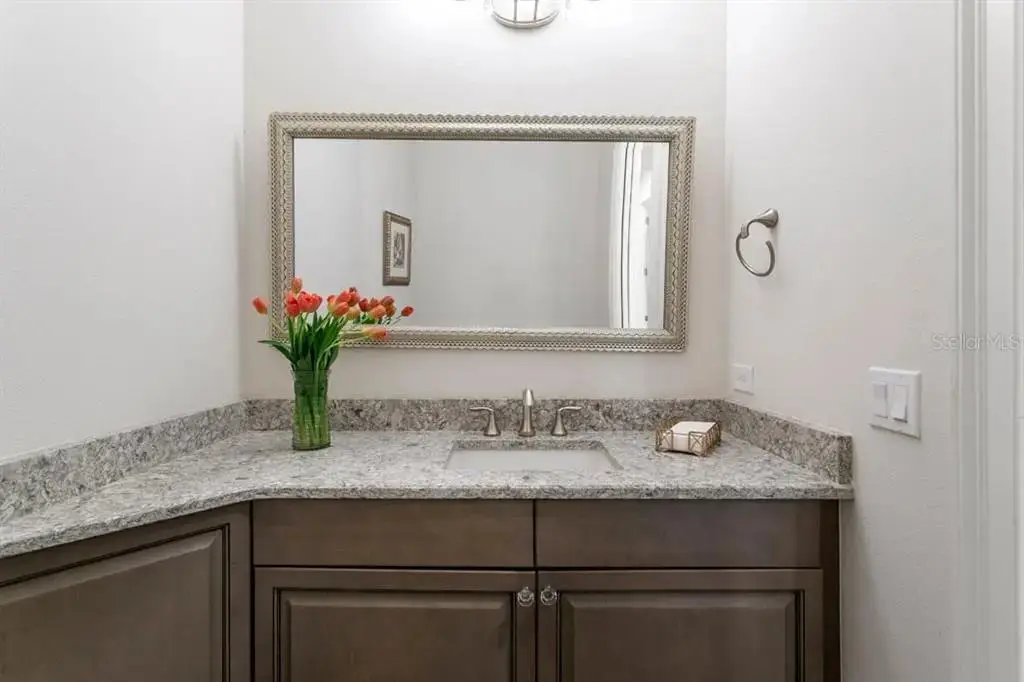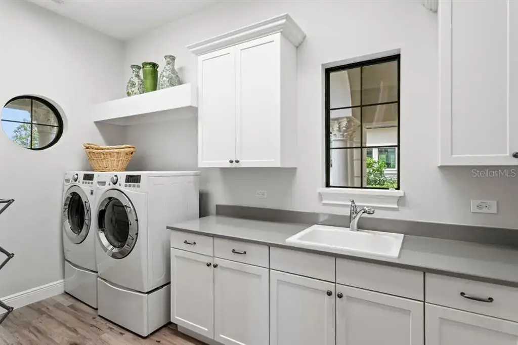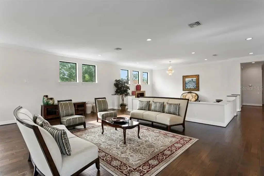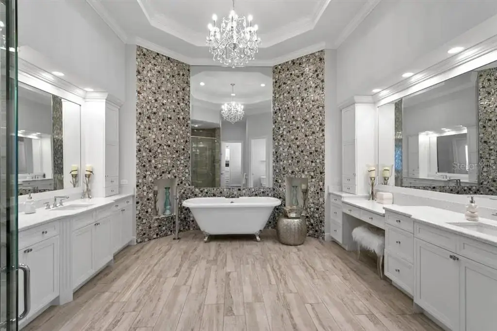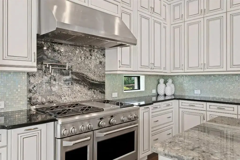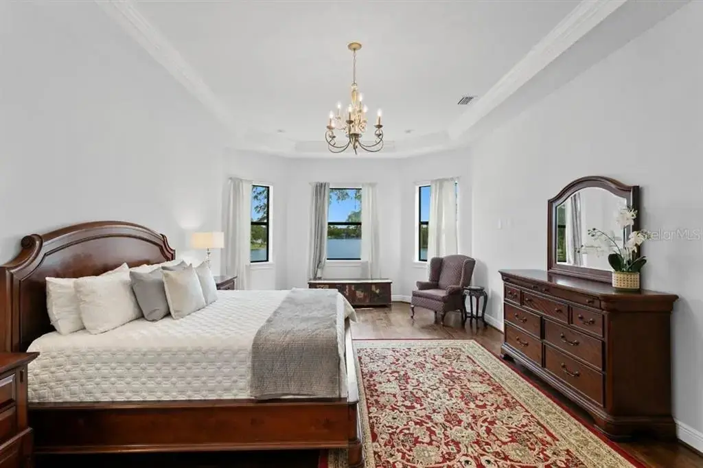 Gated lakefront estate offering space, privacy, and a stunning natural setting—17124 Crawley Road in Odessa is a rare opportunity to live expansively on nearly 6 acres along the tranquil shoreline of Rainbow Lake. With 300 feet of private lake frontage, this custom residence offers 10,545 square feet of living space. Built for both comfort and entertaining, the main house includes 5 bedrooms, 6 full baths, 2 half baths, entertainment space, gym, study, and 2 attached garages—one on each side of the home—designed for convenience and symmetry. Separate guest house features 1 bedroom and 1 full bath. The estate is finished with a pool, spa, and private dock—all with no HOA or CDD fees. Step through the grand double doors into a sweeping foyer with a dramatic double staircase. Straight ahead, the formal living room welcomes you with nearly 24-foot ceilings, gas fireplace, and open view to the pool and lake beyond. The spacious family room serves as a relaxed space with TV, electric fireplace, and sliding glass doors that lead seamlessly to the outdoor terrace. At the heart of the home, the kitchen is both stylish and functional—featuring a striking Cianitus granite island and Cambria Menai quartz on the perimeter, along with a gas range with 1.5 ovens, a separate wall oven, pot filler, microwave and refrigerator, and thoughtful storage. Nearby butler’s pantry with granite countertops and wine refrigerator connects the kitchen to the formal dining room, ideal for entertaining or daily living. Downstairs also includes a primary suite with a fireplace and sitting area, dual custom closets, and a spa-style bath with freestanding tub and oversized walk-in shower. 2 additional ensuite bedrooms are located on the main level. A dedicated study with soaring ceilings and separate gym complete the thoughtful main-level layout. Upstairs, 2 large suites offer the flexibility of dual primary bedrooms, each with its own full bath and walk-in closet. Just beyond, a large entertainment area includes a sunken game room, wet bar with refrigerator, and balcony with balustrades—perfect for entertaining or relaxing. Throughout the home, 8-foot doors, wood flooring, detailed crown and tray ceilings, and custom-finished walk-in closets in every bedroom enhance the design, while both upstairs and downstairs laundry rooms and electric vehicle charging station in the garage add everyday convenience. The separate guest cabana offers a refined yet relaxed extension of the home’s living space. Located just off the pool, it includes a built-in TV, crown and tray ceilings, and walk-in closet, along with full bath and bar with refrigerator. The grounds are the heart of this property. Designed by Ryan Hughes Design Build, the outdoor spaces are a blend of texture, scale, and serenity. Stacked stone retaining walls, lush gardens, fruit trees, and paver walkways surround a heated saltwater pool and spa, fire pit, covered terrace, full summer kitchen, and a separate outdoor full bath for added convenience. At the water’s edge, a private dock features electricity and nautical rope detailing, offering direct access to Rainbow Lake. Located in the heart of Odessa—where luxury homes, wide-open spaces, and natural beauty converge—this estate captures the essence of lakefront living with the convenience of being just minutes from Tampa, major roadways, and top-tier amenities. A rare opportunity to live expansively, privately, and beautifully.