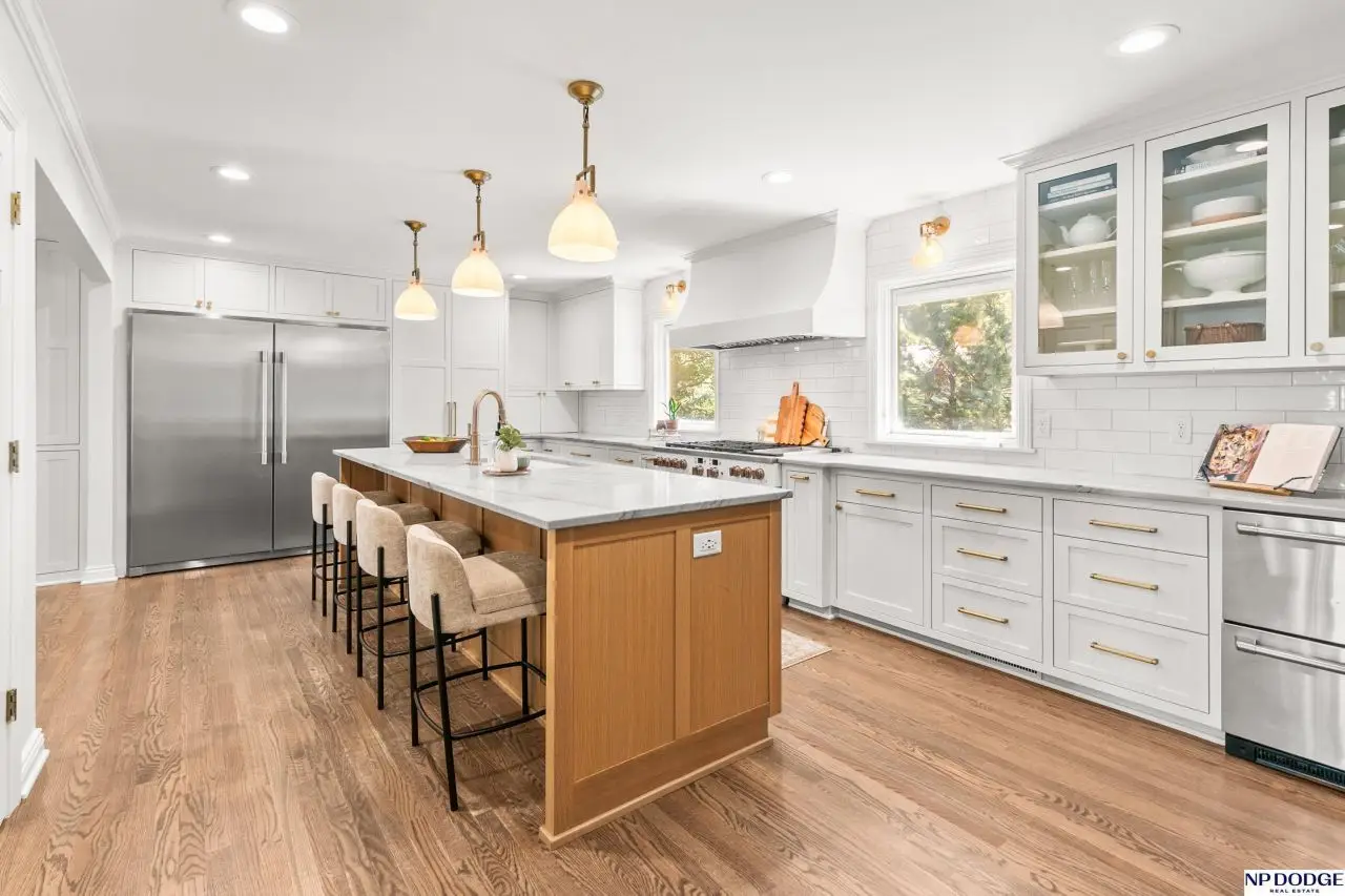 This stunning 2-story home in the heart of West Fairacres has been transformed over the past decade, most renovations from 2020, 2025, into a functional masterpiece blending luxury, leisure, & convenience. Nearly $300,000 in upgrades include a chef's kitchen w/ floor-to-ceiling custom cabinetry, quartzite countertops, GE Café 6-burner range, dual KitchenAid dishwashers, & oversized fridge/freezer. The primary suite offers a spa-inspired bath w/ heated marble floors, soaking tub, steam shower, & walnut cabinetry, plus walk-in closets in all 2nd-floor bedrooms. A redesigned main bath & added 2nd-floor laundry enhance everyday comfort. Updates include a new roof (2025), HVAC systems (2020), James Hardie siding, & refinished hardwoods. Outdoor living shines w/ a stone firepit, patio, & a beautiful four-season room off the back overlooking the landscaped corner lot. The oversized 3-car side-load garage includes wiring for a heater & a floor drain, perfect for Nebraska winters.