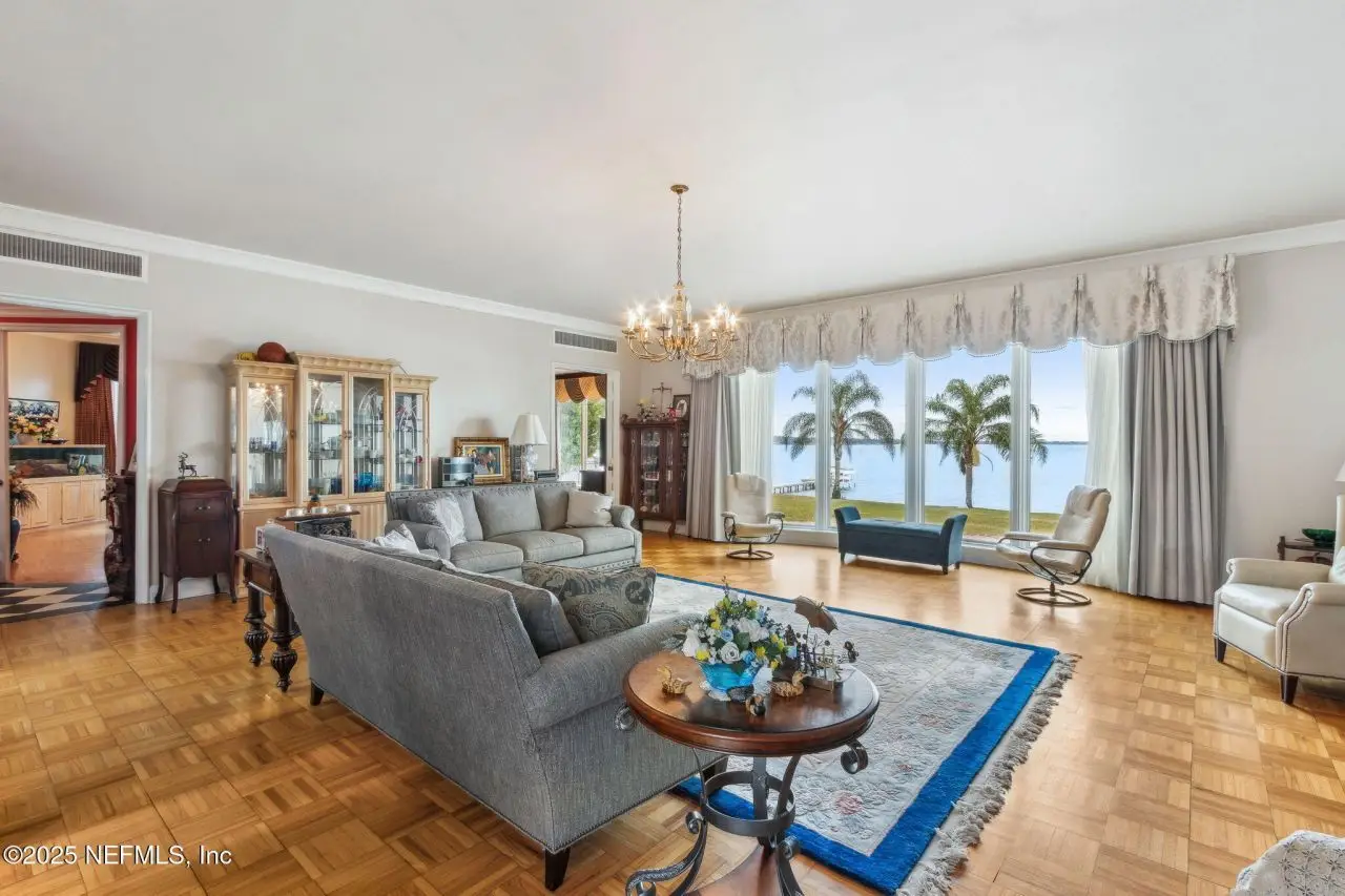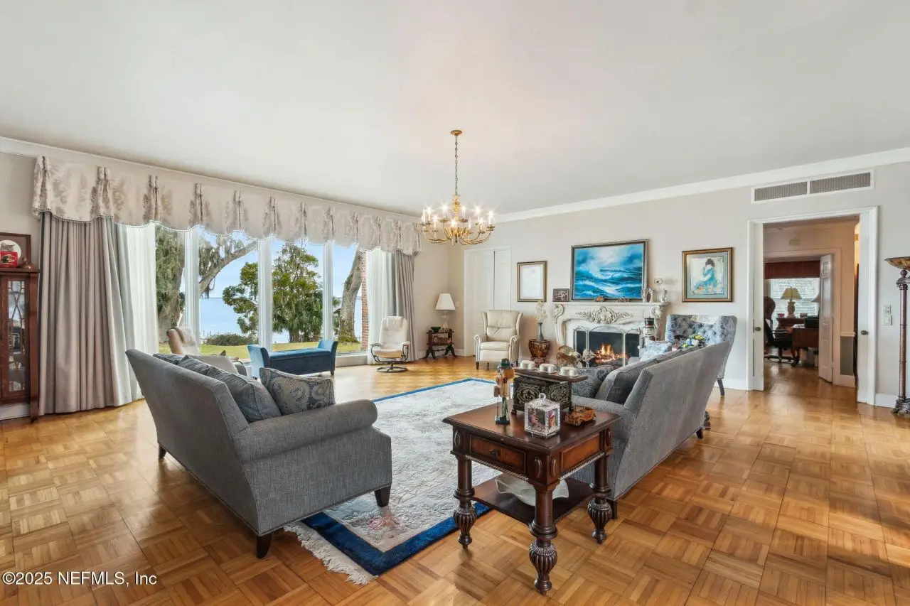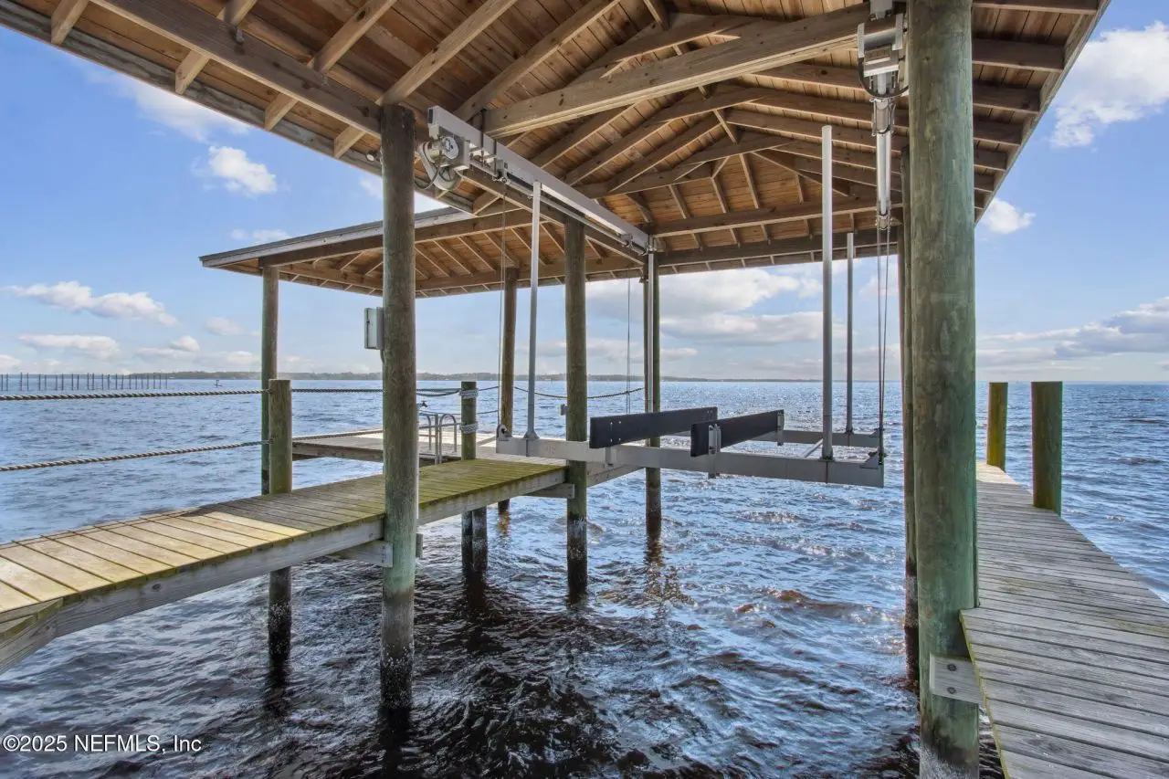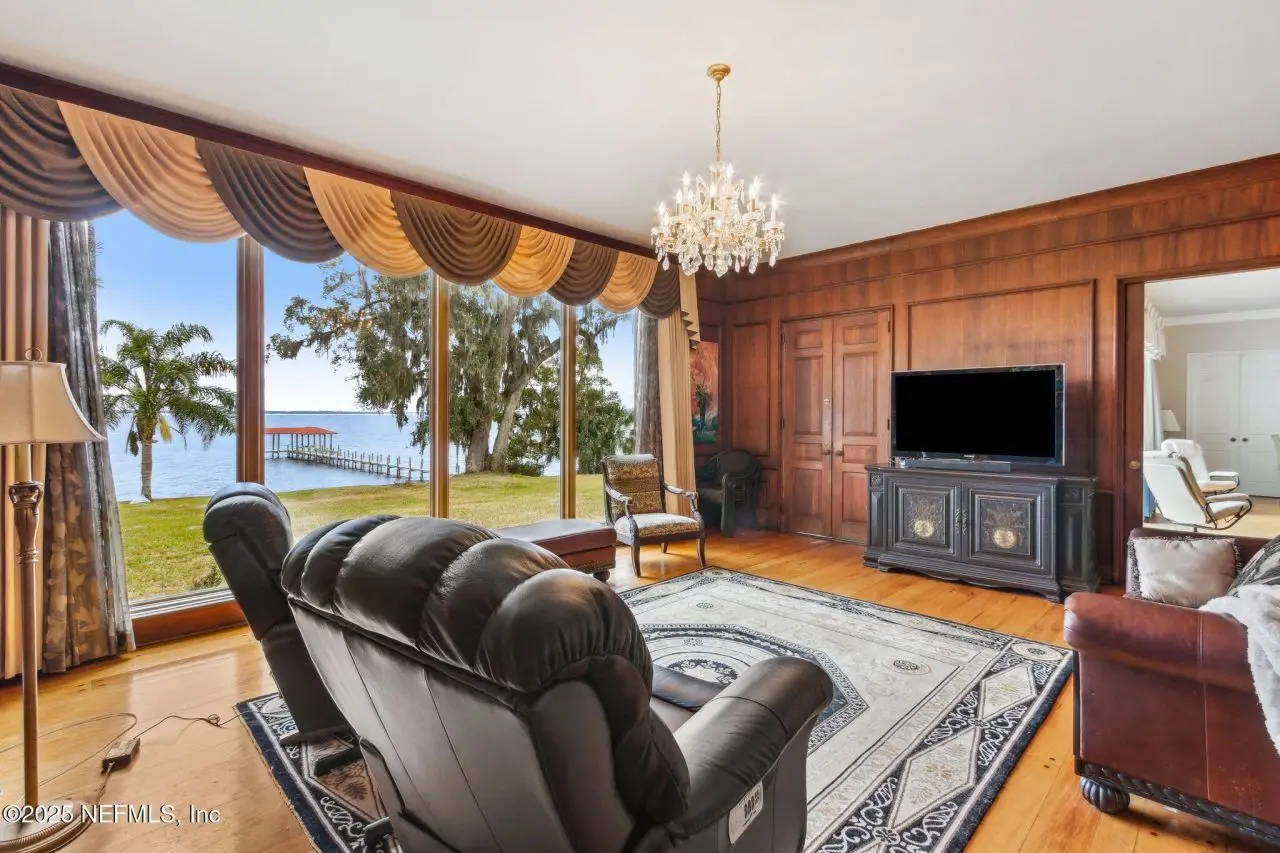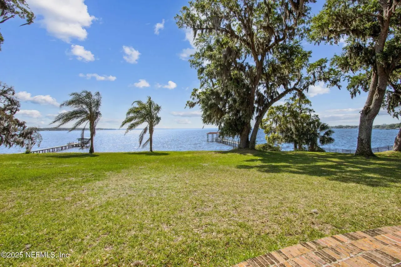 Step into luxury with this stunning all brick St Johns Riverfront home. Features include dock with boat house and 10,000lb lift on 2.4 acres situated on high natural bluff with beautiful views and glorious sunrises. With five fireplaces this 5,860 square foot five bedroom, 5.5 bath home provides ample space for family and guests with a versatile floor plan. The huge primary suite includes large sitting room with fireplace overlooking the St Johns river, additional Marble fireplace in bedroom, a lovely dressing room and the bathroom includes a Sauna. Huge Living Room with stunning River views. The library overlooking the river has wet bar. The attached apartment has living room, kitchenette, full bath and separate bedroom. There is approximately 219 feet of riverfront. House has been re-piped, has RV parking, whole house water filtration system, most windows are Pella, bulkhead, water and electric at the dock, electric at RV parking area. Exterior Gardner's half bath.