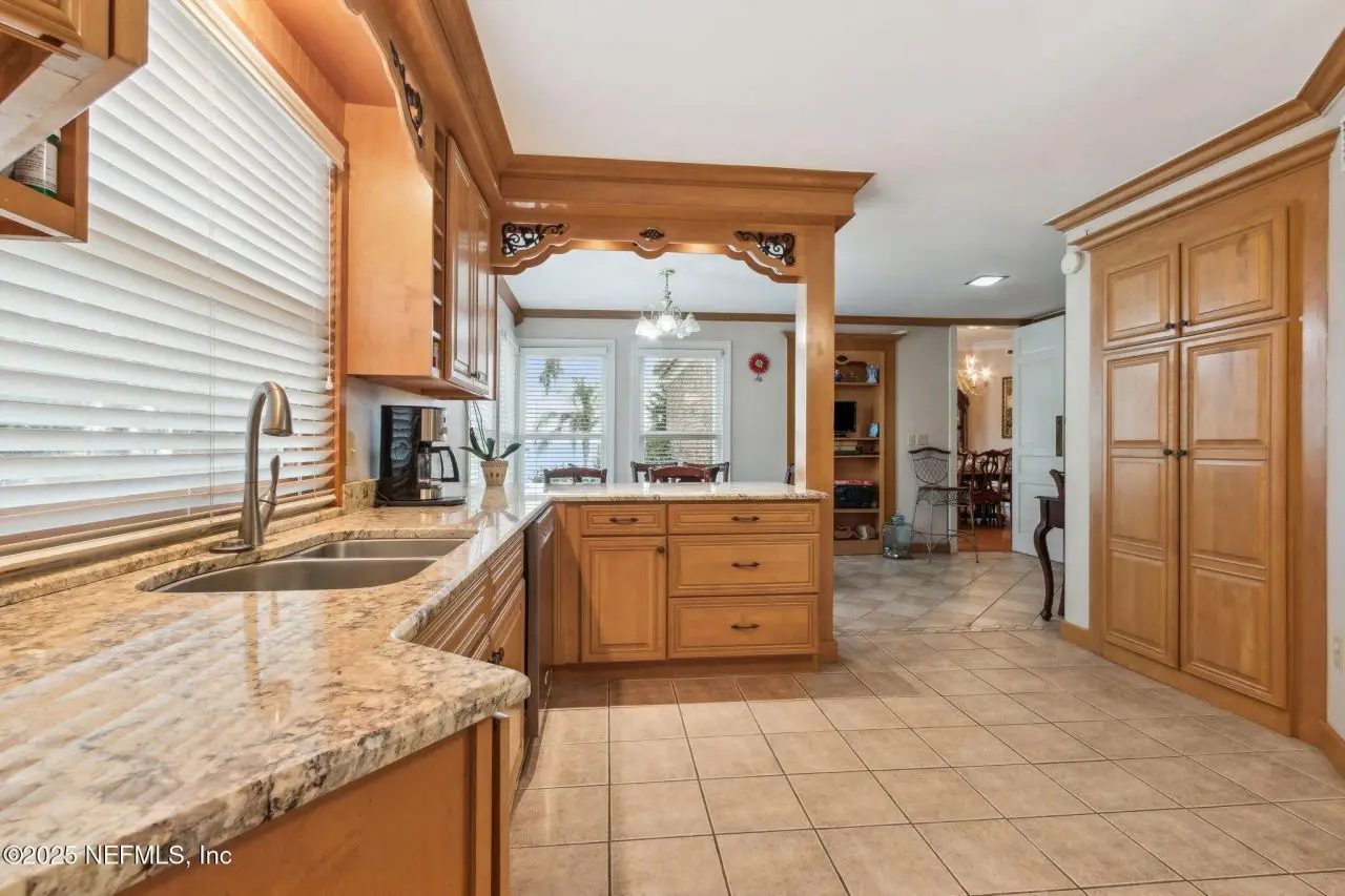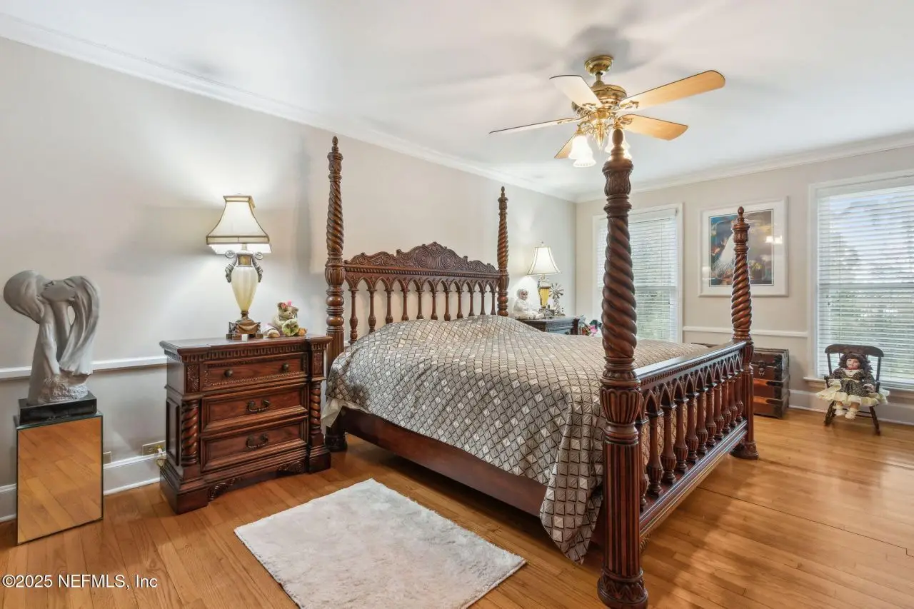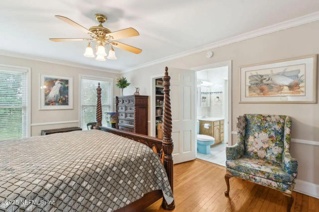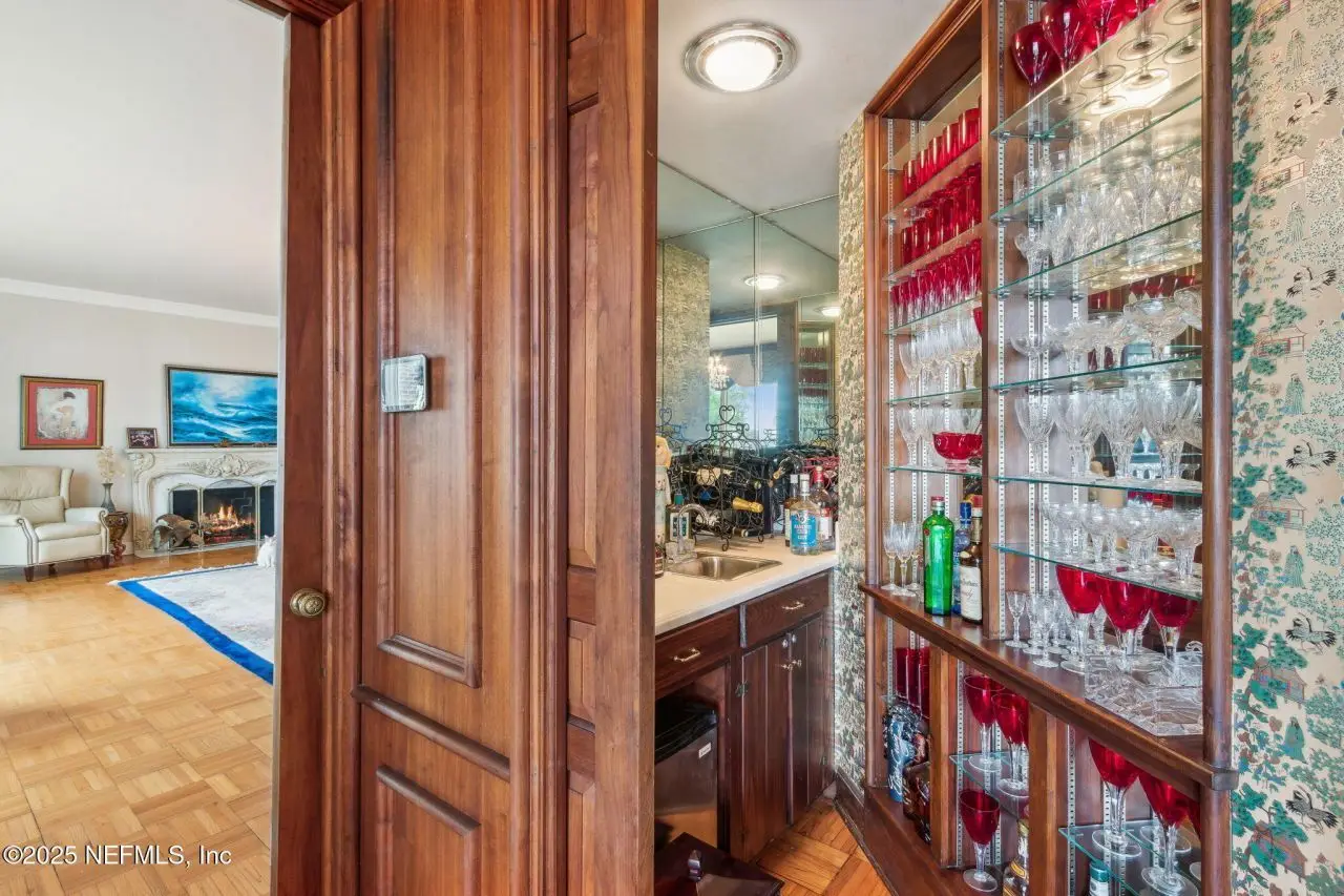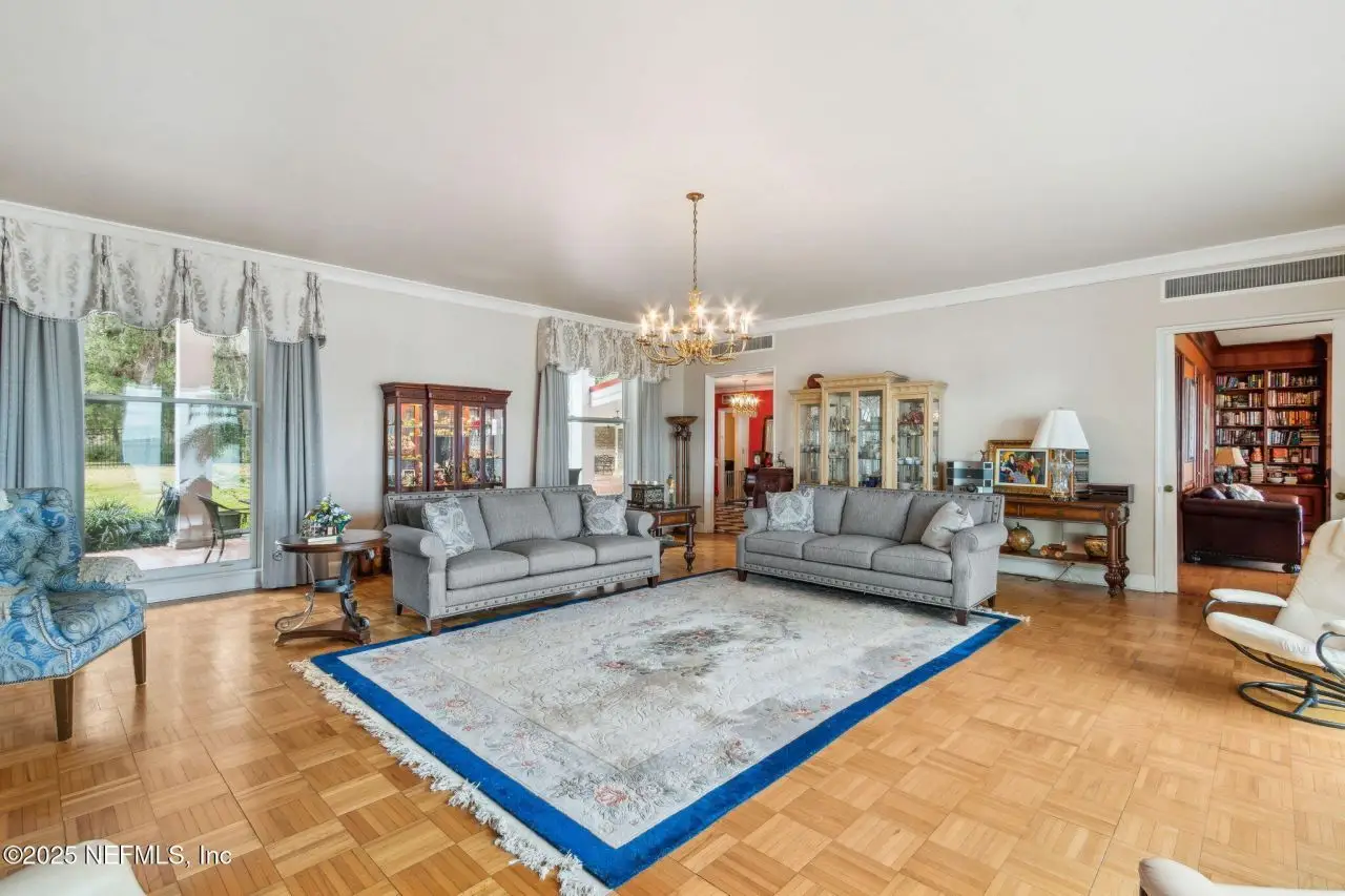 Step into luxury with this stunning all brick St Johns Riverfront home. Features include dock with boat house and 10,000lb lift on 2.4 acres situated on high natural bluff with beautiful views and glorious sunrises. With five fireplaces this 5,860 square foot five bedroom, 5.5 bath home provides ample space for family and guests with a versatile floor plan. The huge primary suite includes large sitting room with fireplace overlooking the St Johns river, additional Marble fireplace in bedroom, a lovely dressing room and the bathroom includes a Sauna. Huge Living Room with stunning River views. The library overlooking the river has wet bar. The attached apartment has living room, kitchenette, full bath and separate bedroom. There is approximately 219 feet of riverfront. House has been re-piped, has RV parking, whole house water filtration system, most windows are Pella, bulkhead, water and electric at the dock, electric at RV parking area. Exterior Gardner's half bath.