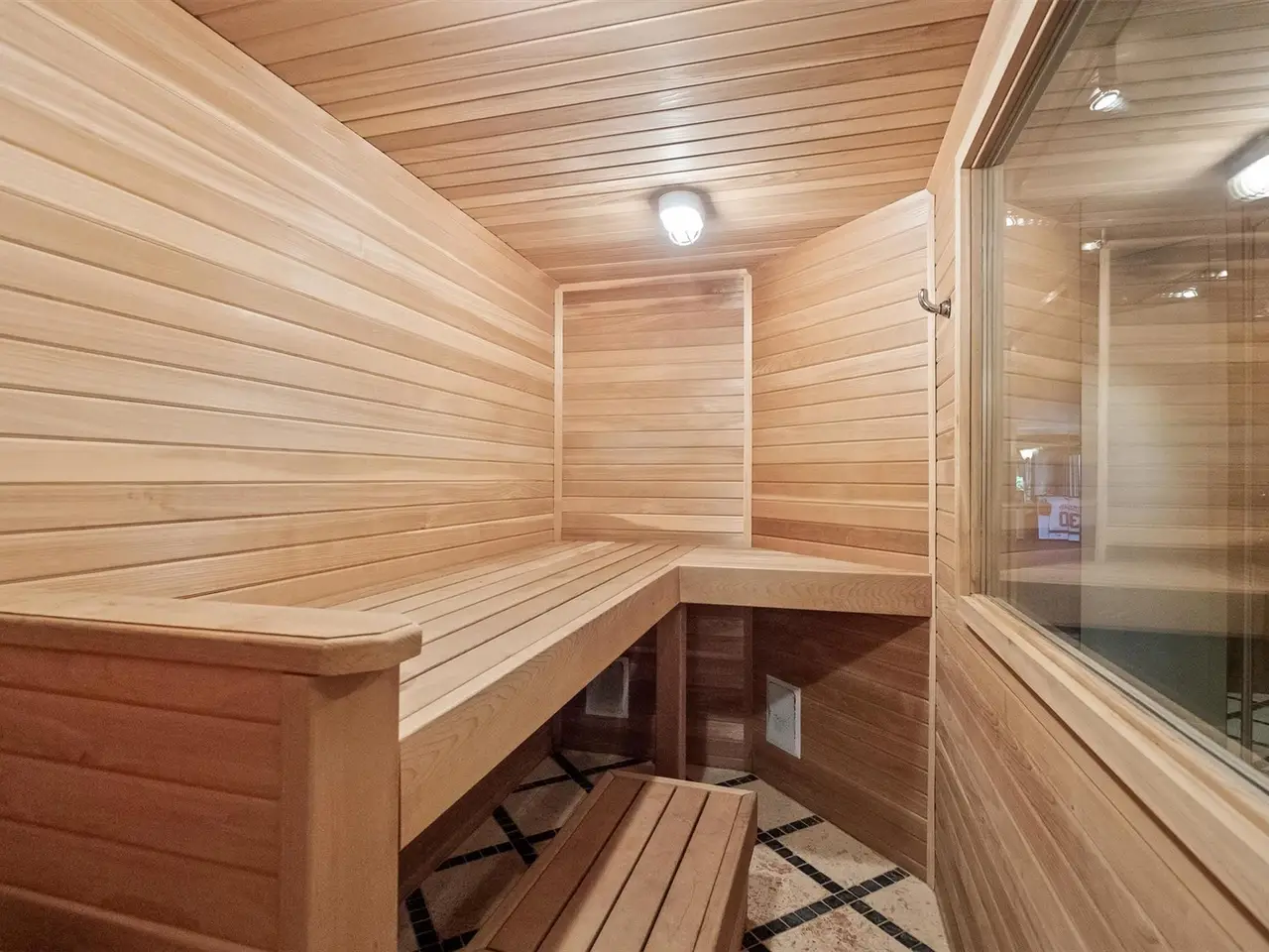 Enormous exercise studio with gym lockers and sauna