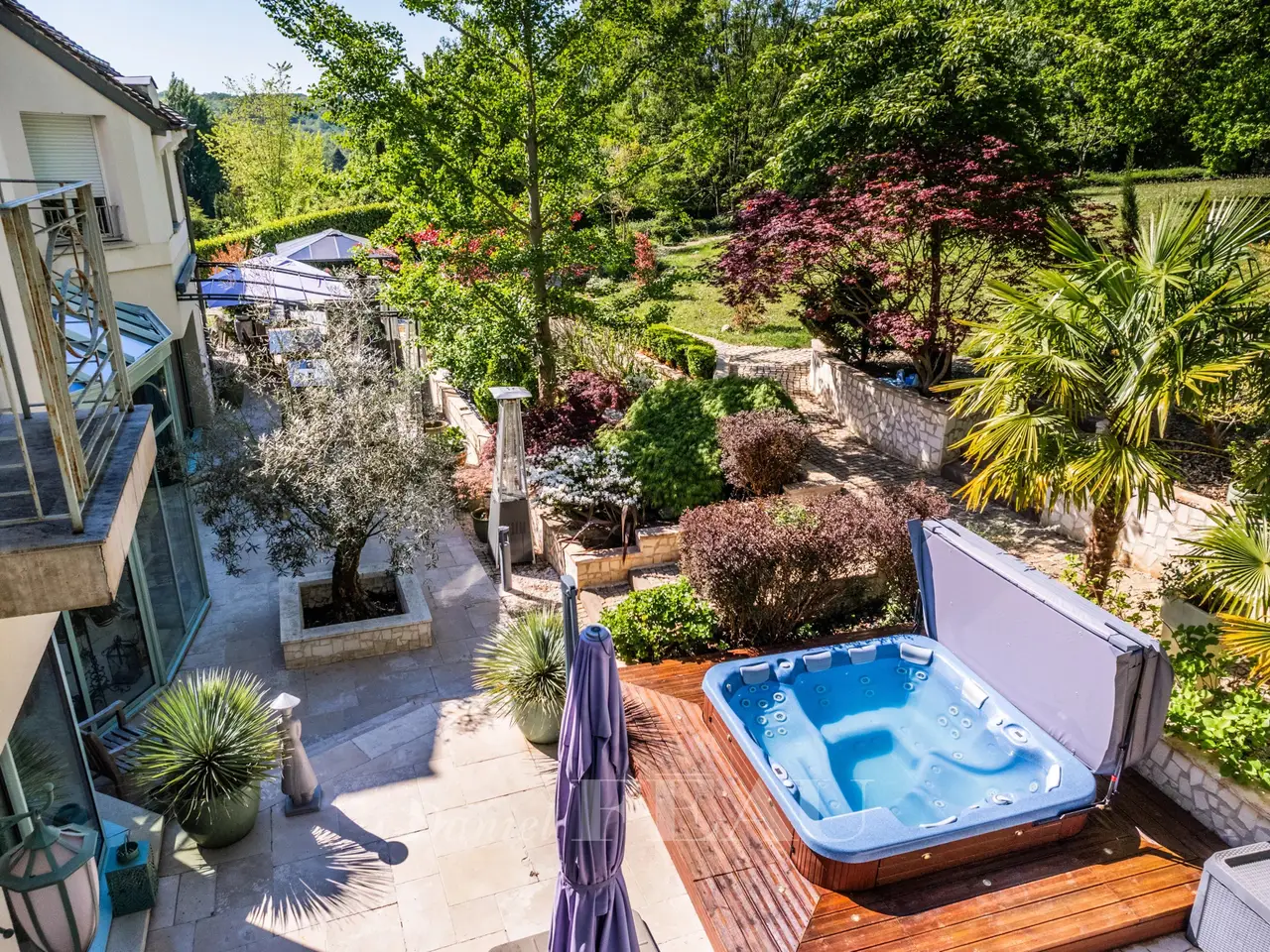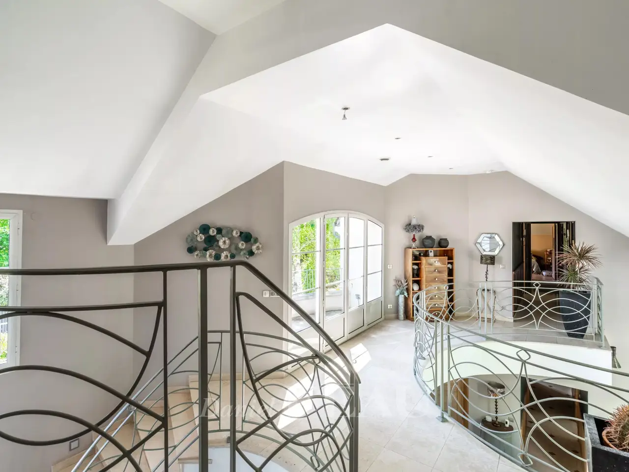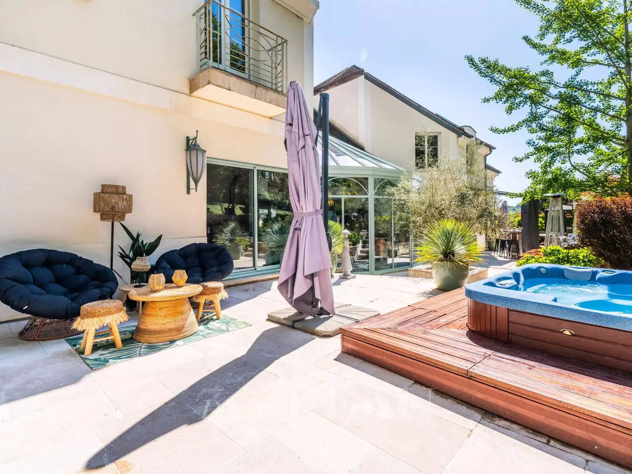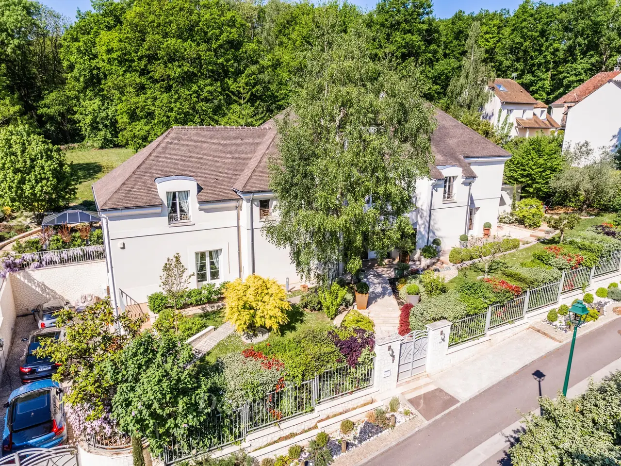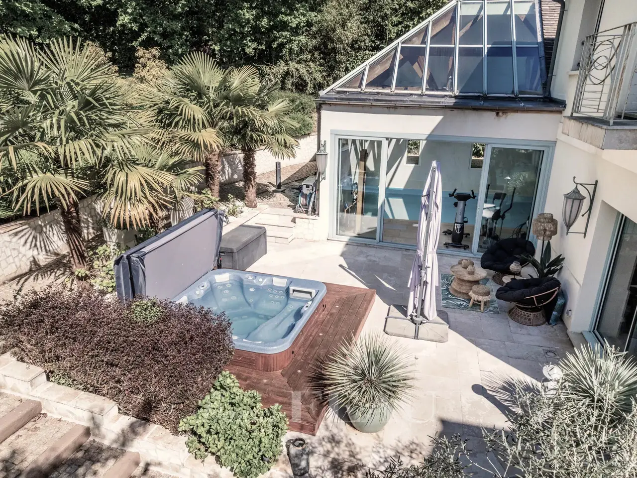 Sole Agent. This exceptional contemporary property dating from 2007 is located near the centre of Orgeval, 5 minutes from the A13 and A14 autoroutes, and 10 minutes from Saint-Germain-en-Laye. Set in a landscaped 3400 sqm landscaped plot with automatic sprinkling, it offers about 490 sqm of floor space and 321 sqm of living space including an entrance hall, a spacious living/reception room with wide bay windows overlooking the indoor swimming pool, a dining room boasting a soaring ceiling with a skylight, a luxurious equipped kitchen with a dining area, and a bedroom with a bathroom and a study. The upper floor comprises a mezzanine, four spacious bedrooms including a suite, a shower room, and a master suite with a bathroom and a bespoke dressing room. The fitted basement accesses the 10 x 4 metre swimming pool, a jacuzzi, a sauna, a shower room/wc, a home cinema, a bar, and an air-conditioned wine cellar. The landscaped garden benefits from a summer kitchen with a pizza oven, a plancha and a ceramic barbeque. Floor-heating, solid parquet flooring. With a double garage and a workshop.