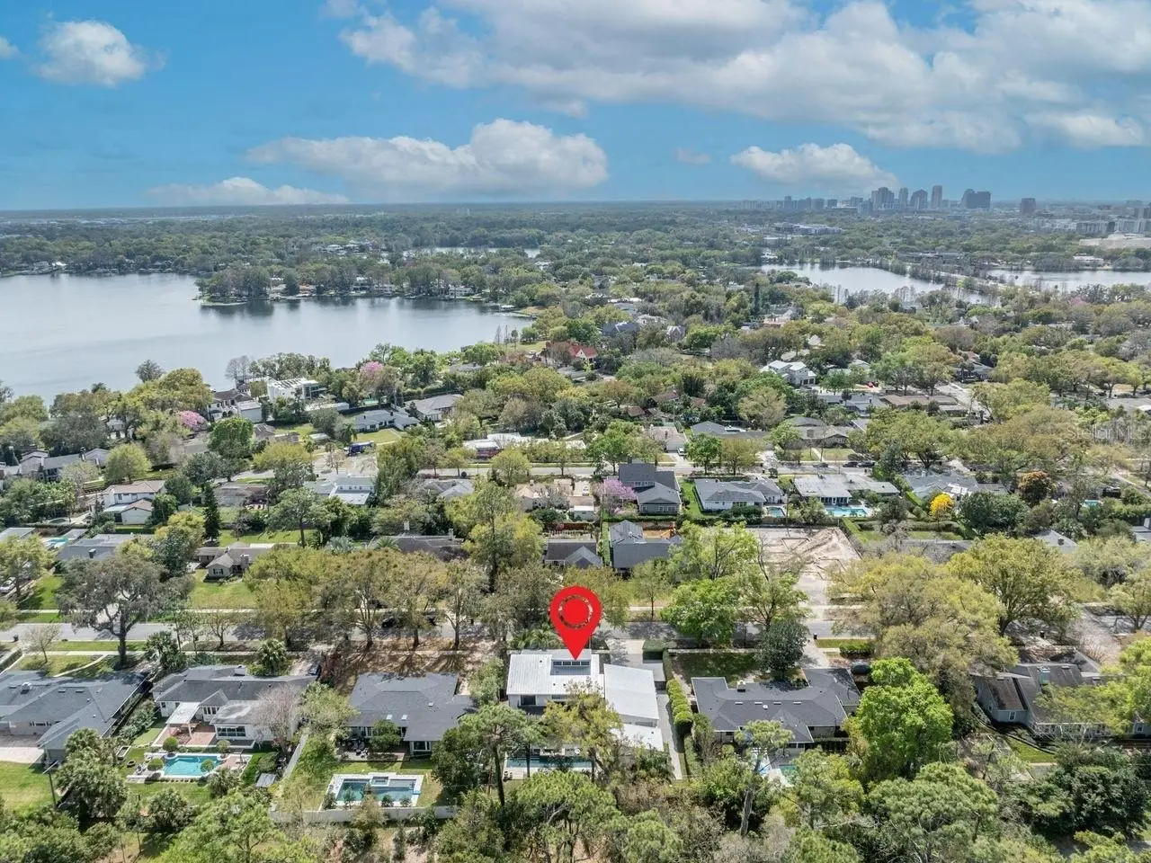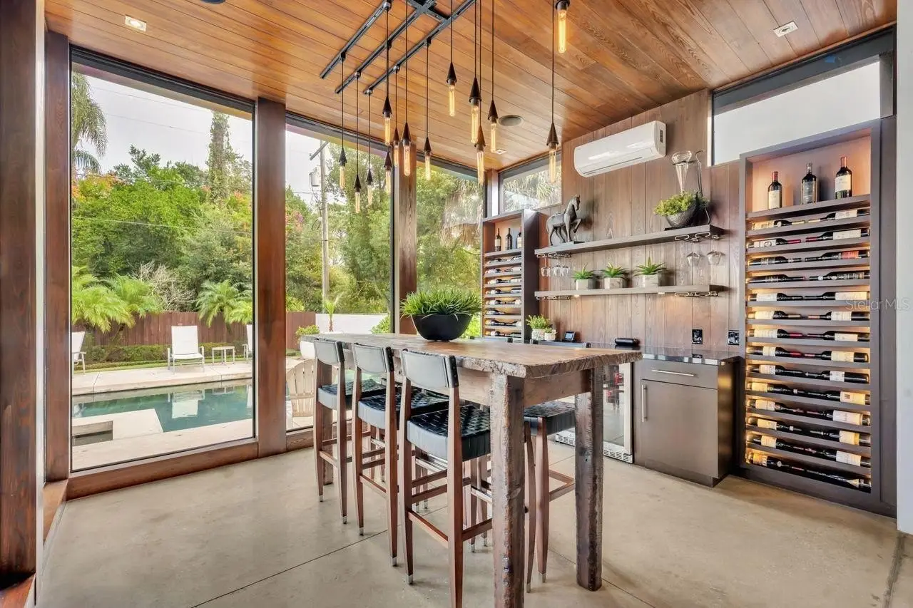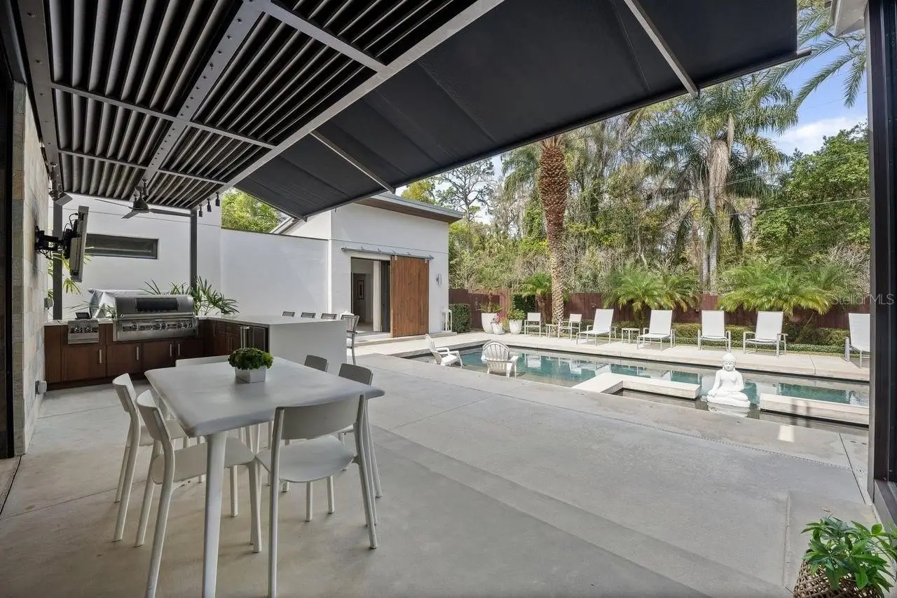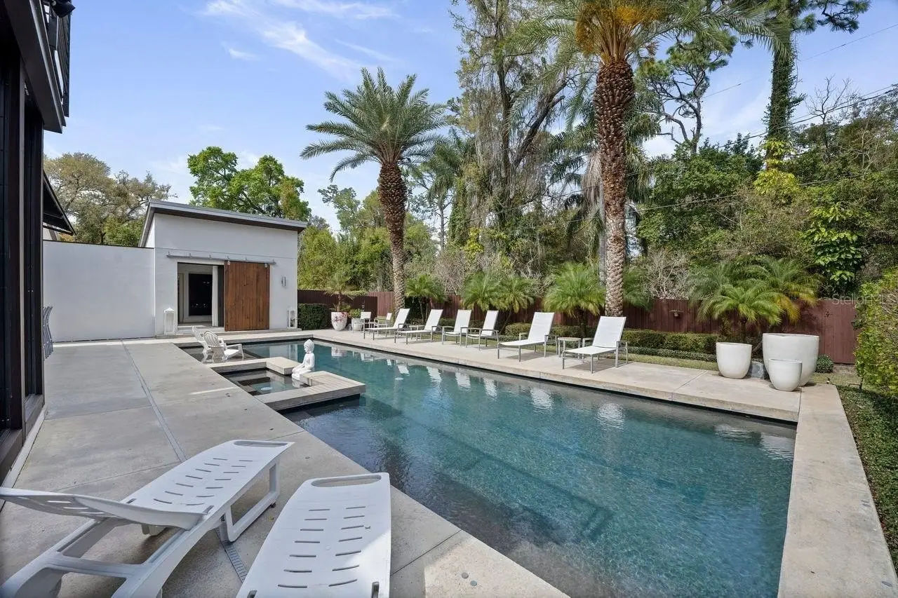 This contemporary four-bedroom, three-and-a-half-bath home with a detached 384 SF cabana in desirable Beverly Shores/Rose Isle showcases designer-inspired finishes and a resort-style pool retreat. Custom-built with a modern aesthetic and open floor plan, it features a gourmet kitchen with an island, breakfast bar, stainless steel appliances including a Viking refrigerator and separate freezer, espresso cabinetry, and Caesarstone countertops. The open dining area flows seamlessly into the spacious great room, highlighted by polished concrete floors, a custom-built media center, a wine room, bedroom with en-suite bath, and aan office with wrap around desk. Twelve-foot retractable sliding glass doors fill the main living area with natural light and open to spectacular views of the heated saltwater pool and spa. Upstairs, the primary suite offers a serene retreat with a custom-designed walk-in closet, Caesarstone dual vanities, soaking tub, separate shower, and a private balcony overlooking the pool and Mead Gardens. Two additional bedrooms share a Jack-and-Jill bath, while another flexible space serves perfectly as a media room, gym, or nursery. A secondary washer and dryer upstairs add convenience. The outdoor living area is an entertainer’s dream, complete with a summer kitchen, bar area, gas grill, and retractable awning. Guests will love the detached guest house with its private entrance and pool views. The garage provides flexibility, accommodating either two or four cars. Ideally located near both Orlando and Winter Park, and just steps from scenic Mead Gardens, this home offers luxury living at its finest—a perfect blend of modern design, functionality, and resort-style comfort.