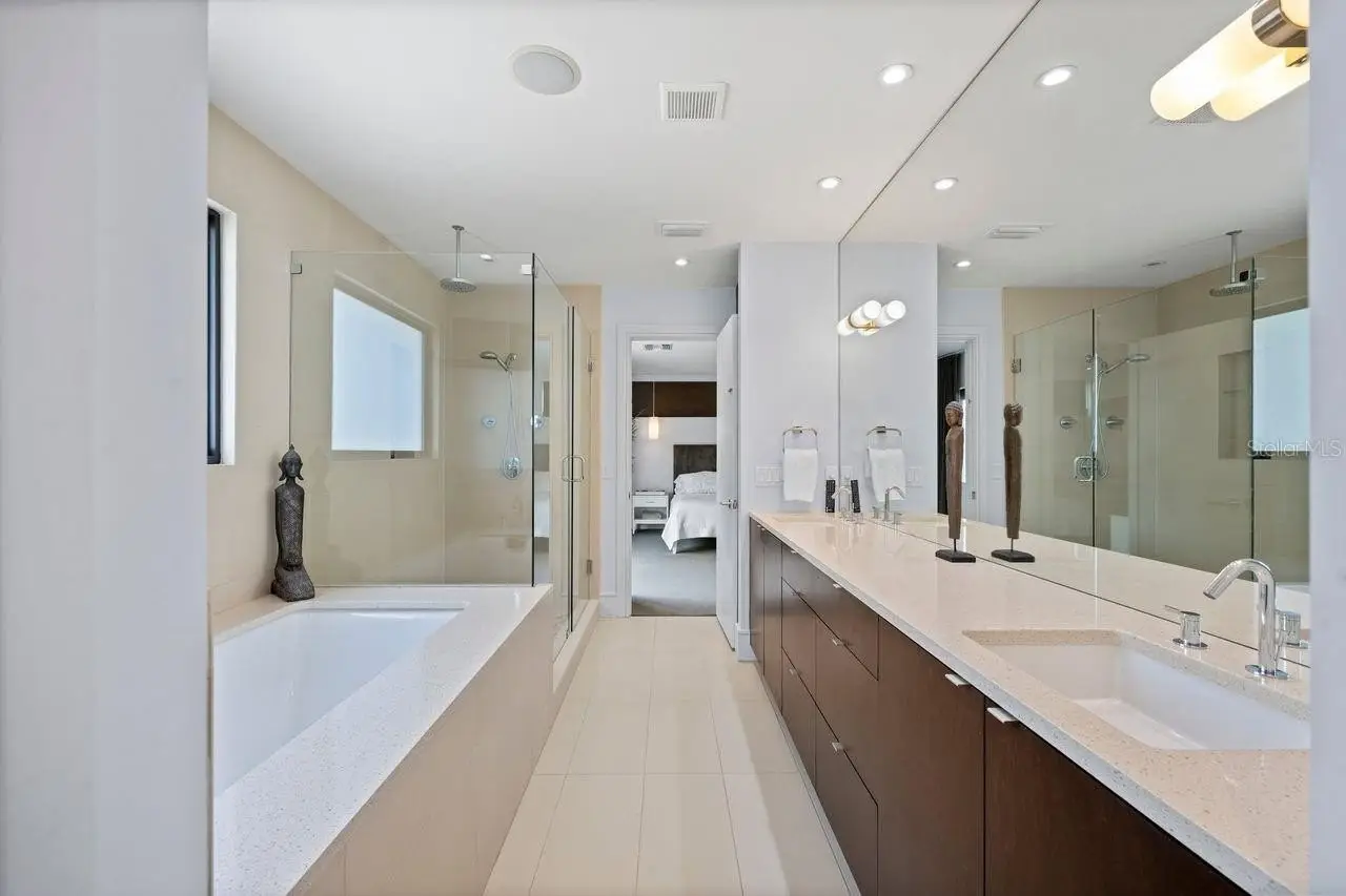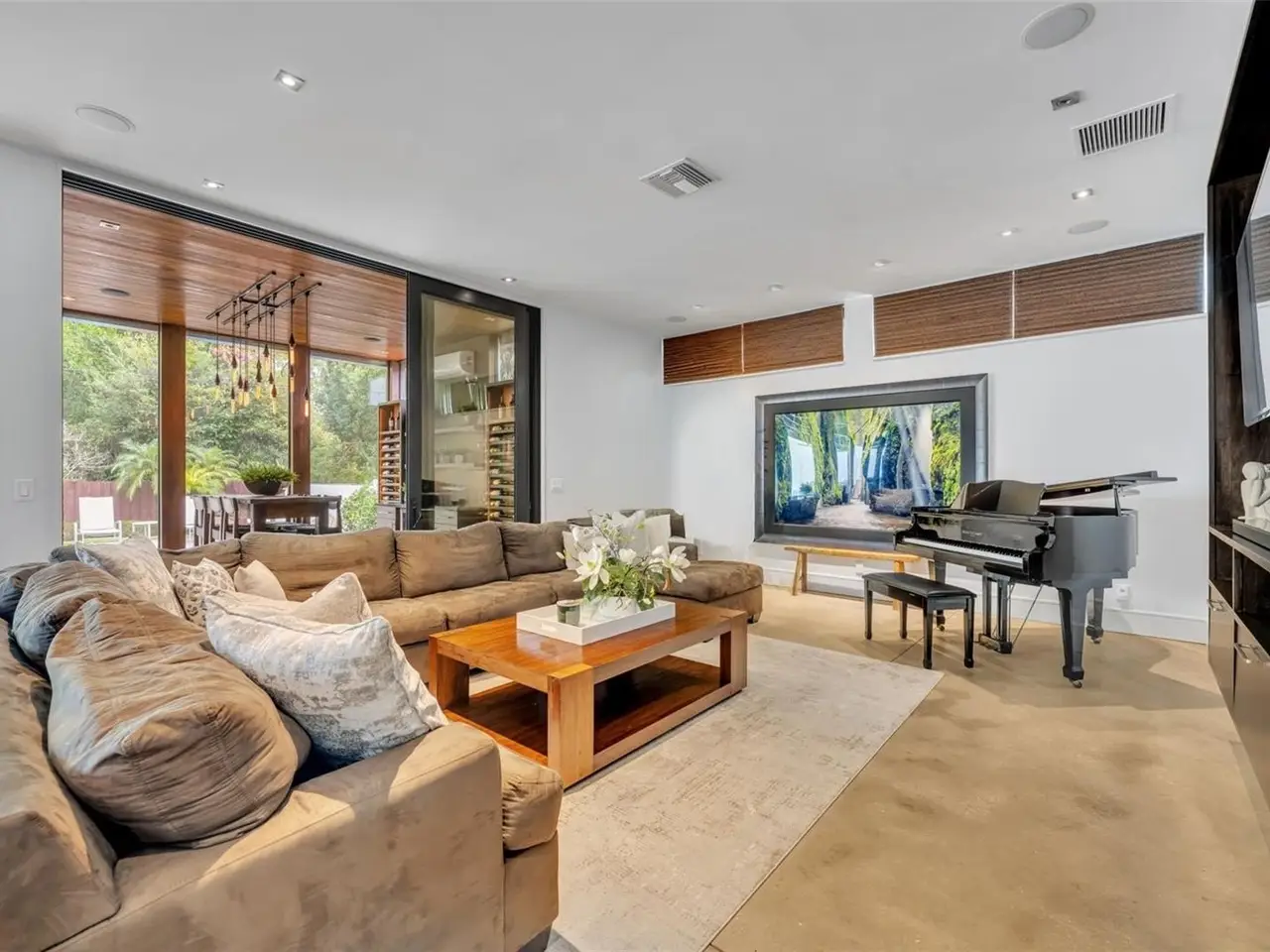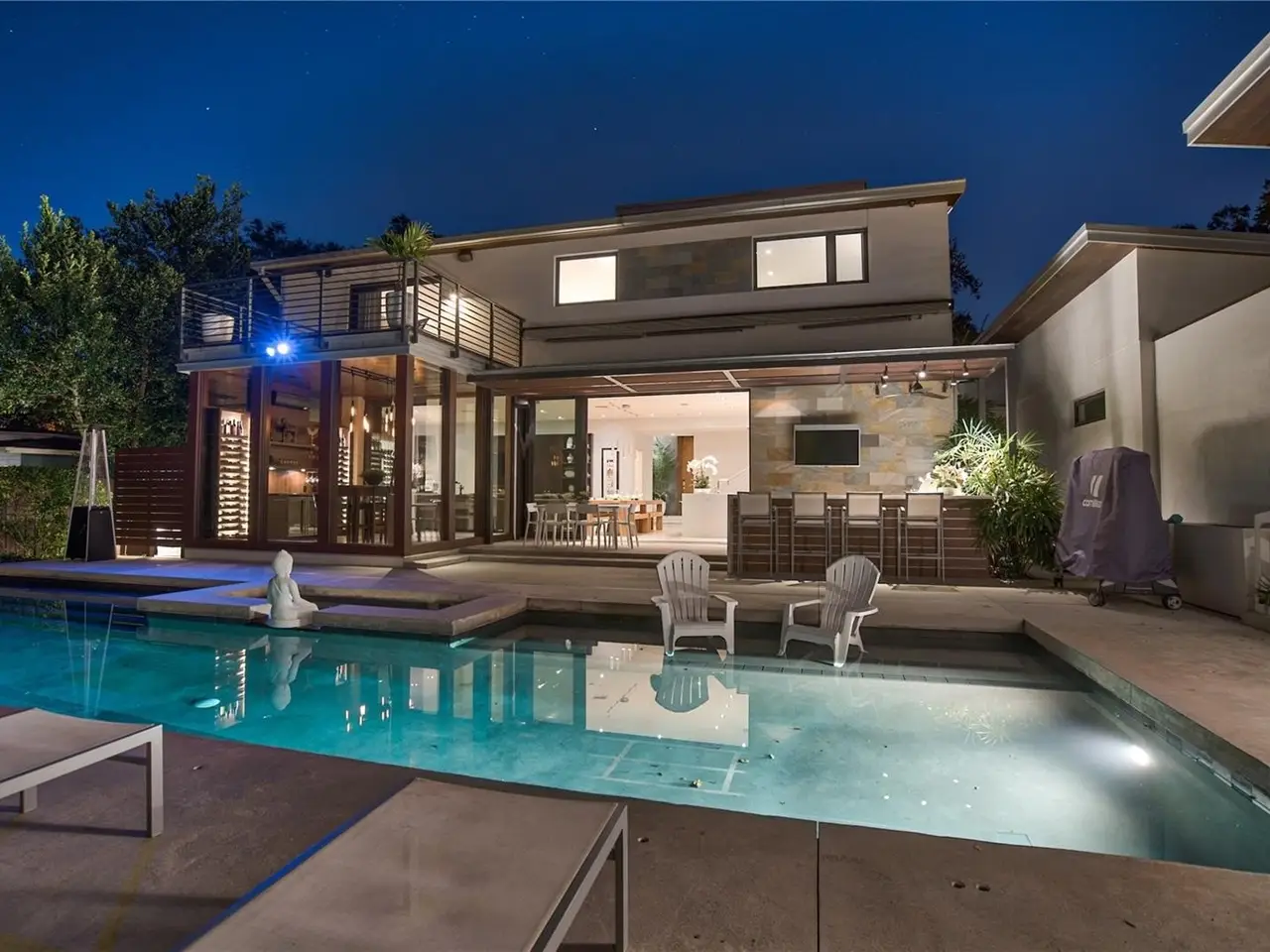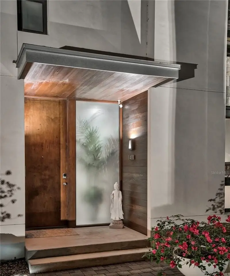 This contemporary four-bedroom, three-and-a-half-bath home with a detached 384 SF cabana in desirable Beverly Shores/Rose Isle showcases designer-inspired finishes and a resort-style pool retreat. Custom-built with a modern aesthetic and open floor plan, it features a gourmet kitchen with an island, breakfast bar, stainless steel appliances including a Viking refrigerator and separate freezer, espresso cabinetry, and Caesarstone countertops. The open dining area flows seamlessly into the spacious great room, highlighted by polished concrete floors, a custom-built media center, a wine room, bedroom with en-suite bath, and aan office with wrap around desk. Twelve-foot retractable sliding glass doors fill the main living area with natural light and open to spectacular views of the heated saltwater pool and spa. Upstairs, the primary suite offers a serene retreat with a custom-designed walk-in closet, Caesarstone dual vanities, soaking tub, separate shower, and a private balcony overlooking the pool and Mead Gardens. Two additional bedrooms share a Jack-and-Jill bath, while another flexible space serves perfectly as a media room, gym, or nursery. A secondary washer and dryer upstairs add convenience. The outdoor living area is an entertainer’s dream, complete with a summer kitchen, bar area, gas grill, and retractable awning. Guests will love the detached guest house with its private entrance and pool views. The garage provides flexibility, accommodating either two or four cars. Ideally located near both Orlando and Winter Park, and just steps from scenic Mead Gardens, this home offers luxury living at its finest—a perfect blend of modern design, functionality, and resort-style comfort.