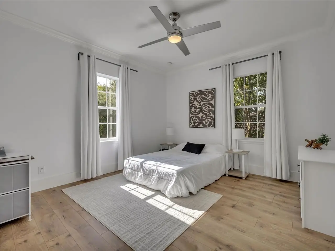 Under contract-accepting backup offers. Come see this stunning 5-bedroom, 4.5-bath, 3,811 sq ft home with a luxurious garage apartment, ideally situated on a prime corner lot in the heart of Baldwin Park. Inspired by the iconic style of Jonathan Adler, this home blends timeless sophistication with bold designer flair. Elegant details abound, including custom moldings, 8-inch wide French oak flooring, wainscoting in the office and dining room, and striking fixtures throughout. The light-filled great room features custom wall paneling, offering a refined yet welcoming space for relaxing or entertaining. The fully remodeled kitchen is a chef’s dream, boasting premium Bosch stainless steel appliances, custom marble countertops, and a show-stopping marble waterfall island with ample storage. Just off the kitchen, you’ll find a spacious walk-in pantry, a built-in office nook, and a custom banquette with hidden storage in the cozy eat-in area. The first-floor primary suite is a tranquil retreat, showcasing a beamed ceiling with tongue-and-groove paneling, crown molding, and French doors that open to a private side porch. The en suite bath feels like a spa, with marble floors and shower walls, a freestanding soaking tub, and a custom quartz-topped vanity. The second floor features two generously sized bedrooms connected by a shared Jack-and-Jill bathroom, an additional bedroom conveniently located next to a full hall bath, and a spacious, light-filled loft—perfect for use as a playroom, media room, or home office. Upstairs flooring has been recently upgraded with stylish laminate throughout, and all upstairs interior walls have been freshly repainted for a crisp, move-in-ready feel. Completing this exceptional property is a beautifully appointed garage apartment—ideal as a guest suite, home office, or rental opportunity—adding flexibility and value to an already incredible home. This is Baldwin Park living at its finest: elegant, functional, and effortlessly stylish. HVAC: 2021. Roof: 2021. New laminate floors and paint in the upstairs area of the main home.