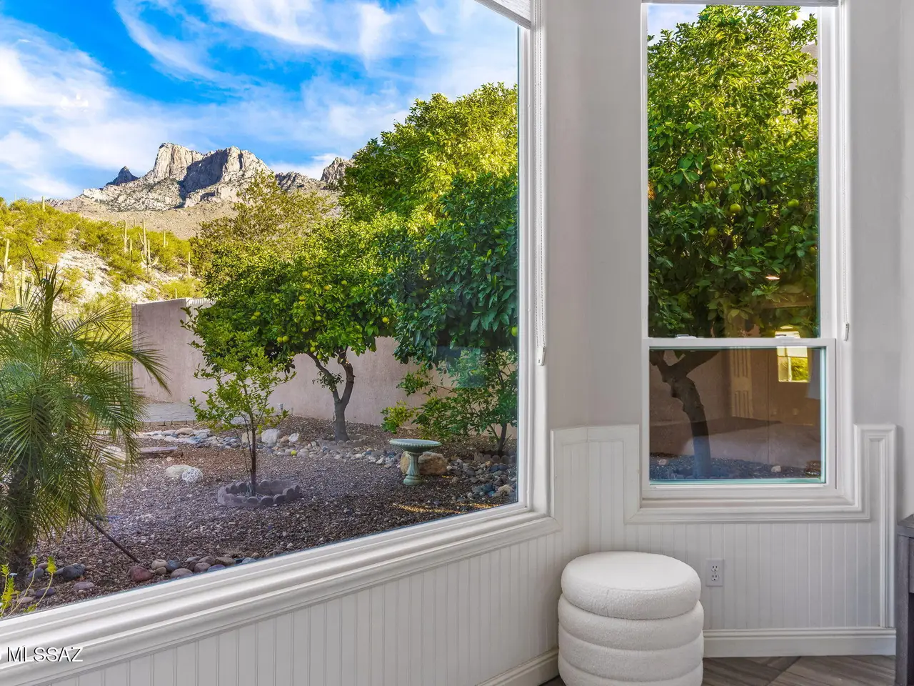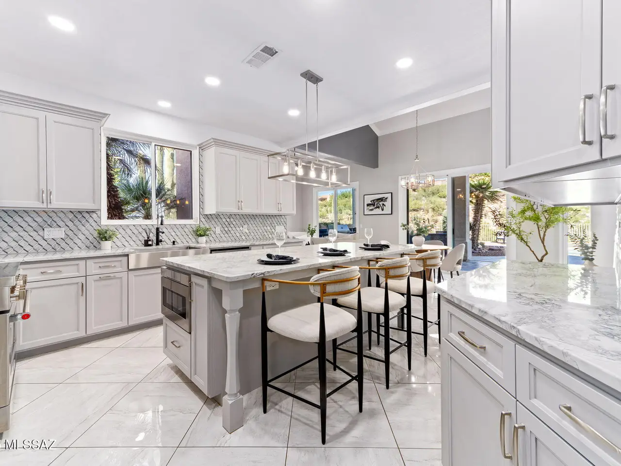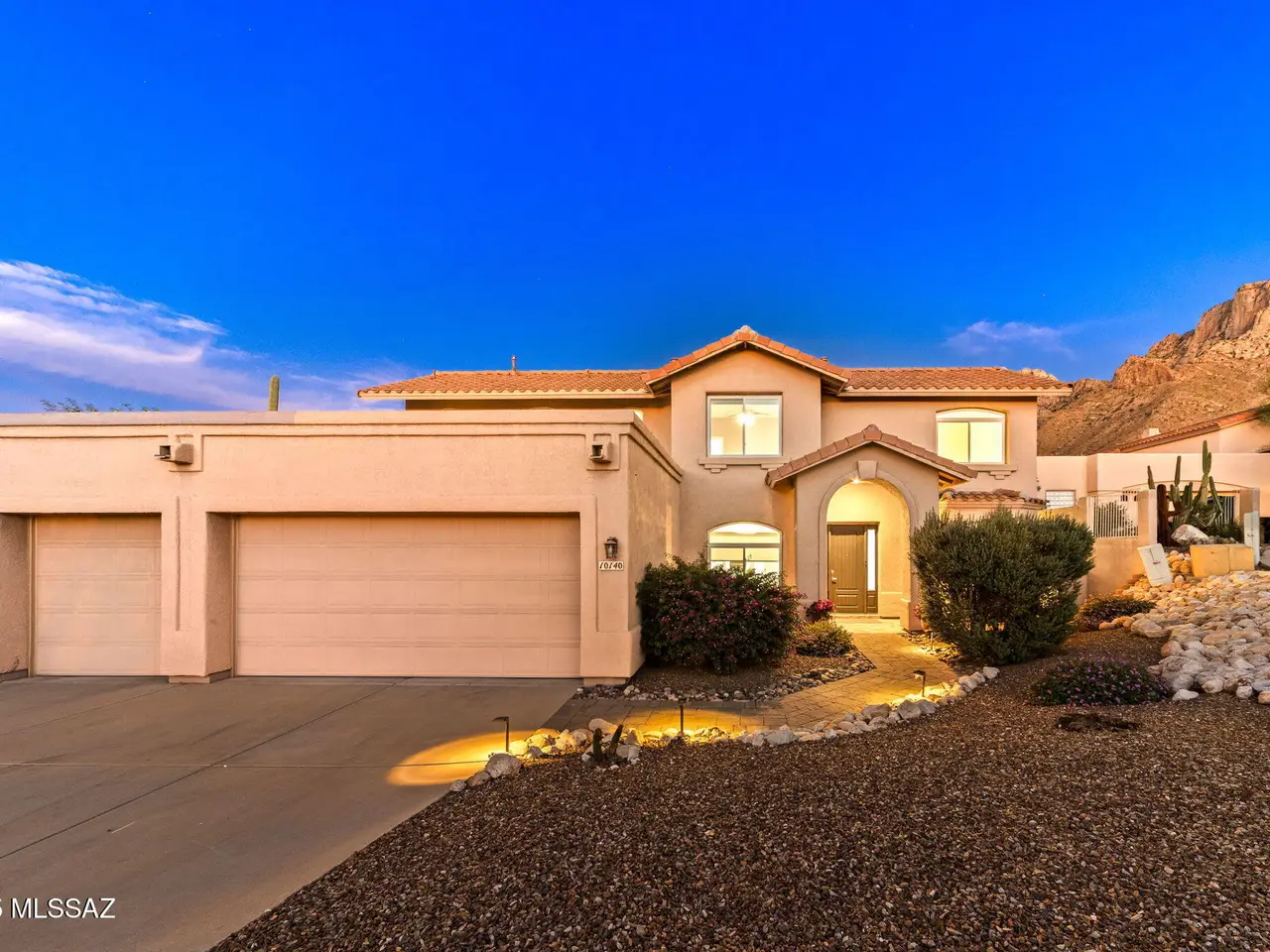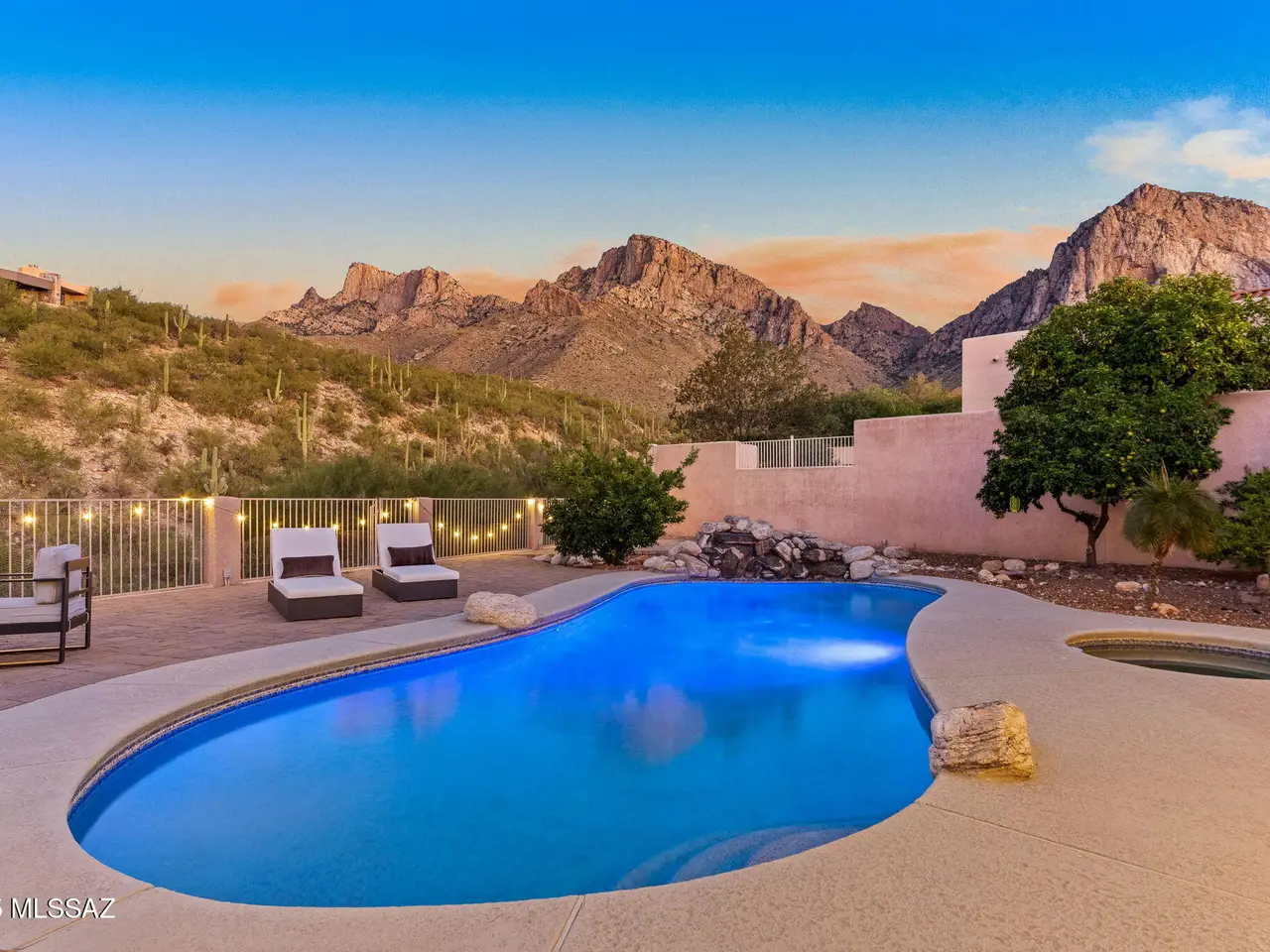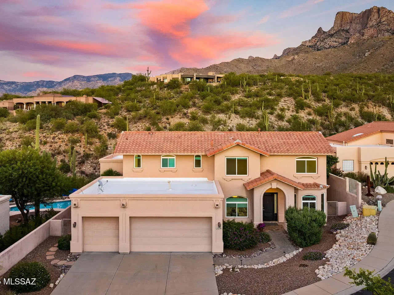 VIEWS! If you've been looking for one of the best mountain views in Oro Valley, this is it! Discover refined living in this thoughtfully updated 4-bedroom, 5-bathroom contemporary home, nestled within the 24-hour guard gated La Reserve community. Spanning 3,300 square feet across two stories, with the primary bedroom DOWNSTAIRS. Step inside to an open great room featuring a gas fireplace seamlessly flowing into a formal dining area and a versatile den/bar with a beverage refrigerator and ice maker. The remodeled kitchen is a culinary haven, boasting custom cabinetry, quartzite countertops, a spacious island with breakfast bar, and premium stainless-steel appliances including a 6-burner gas range, and custom tiled backsplash. The primary suite on the downstairs level offers a serene retreat with unobstructed mountain views of Pusch Ridge, complete with its own entrance to the backyard. The showstopper is the newly renovated master bath that makes you feel like you're at the spa featuring a relaxing soaking tub, a separate spacious walk-in tiled shower, dual floating vanities, and 2 LED mirrors. Also downstairs is a functional office or exercise room. Upstairs, 3 additional bedrooms and 3 additional bathrooms provide privacy. Outside, embrace desert serenity with panoramic views of Pusch Ridge and the Catalina Mountains. The low-maintenance backyard oasis includes a sparkling pebble-tec pool with waterfall, spa, outdoor kitchen with BBQ grill, sink, and refrigerator, plus a cozy fire-pit for year-round enjoyment. The spacious backyard also has several mature citrus trees including grapefruit and orange tree. Additional recent enhancements like new windows, doors, HVAC systems, re-piped water lines, and irrigation ensure modern efficiency. Finishing off the home is a 3 car garage with ample storage. Located in Oro Valley with easy access to top rated golf, shopping, and restaurants, this home offers a perfect balance of luxury and tranquility.