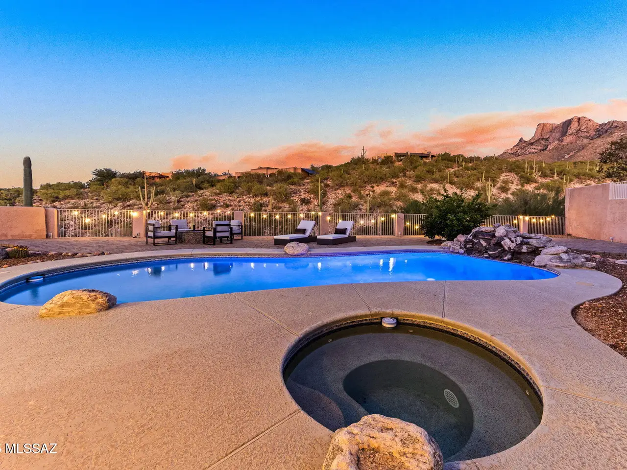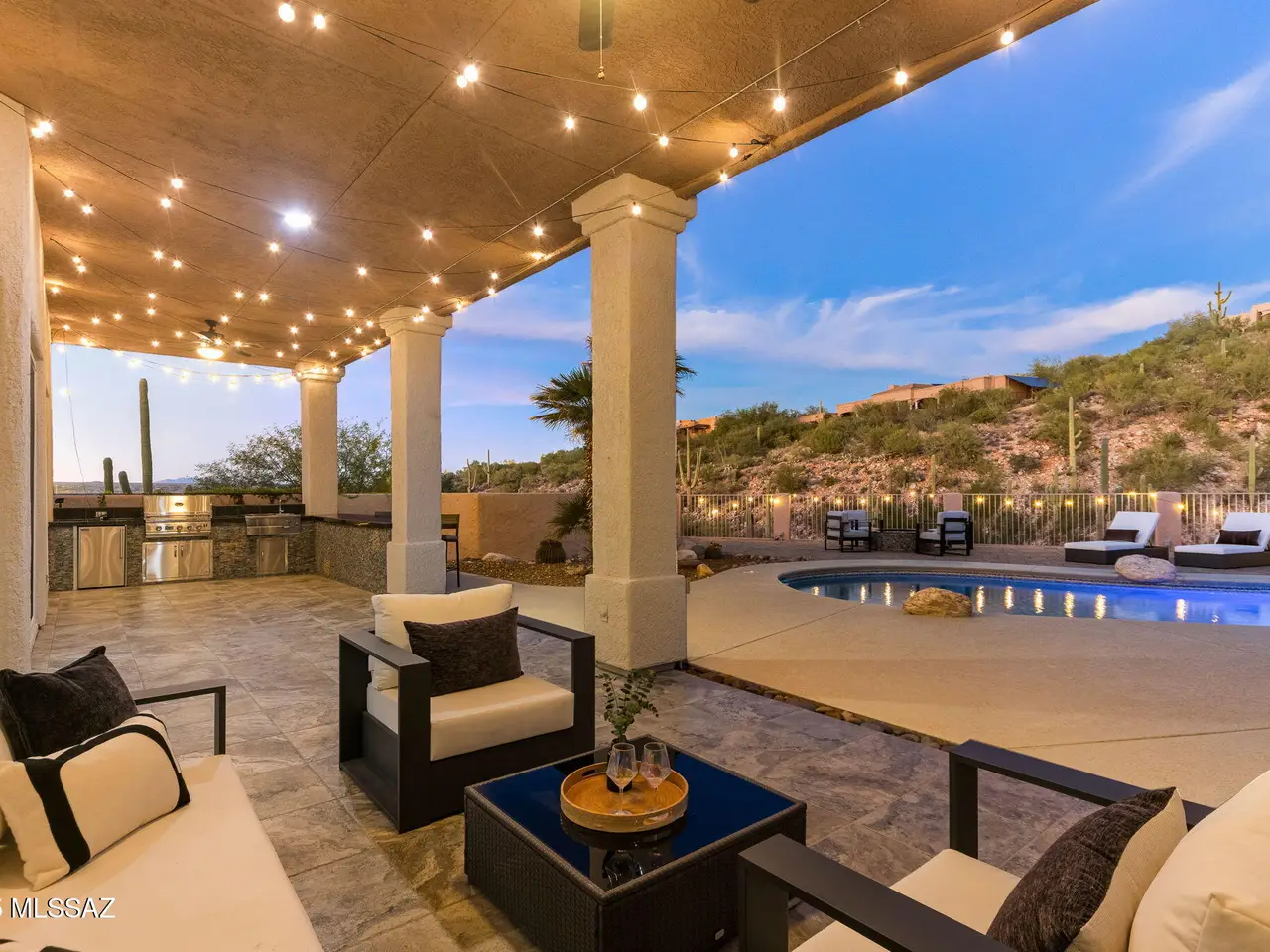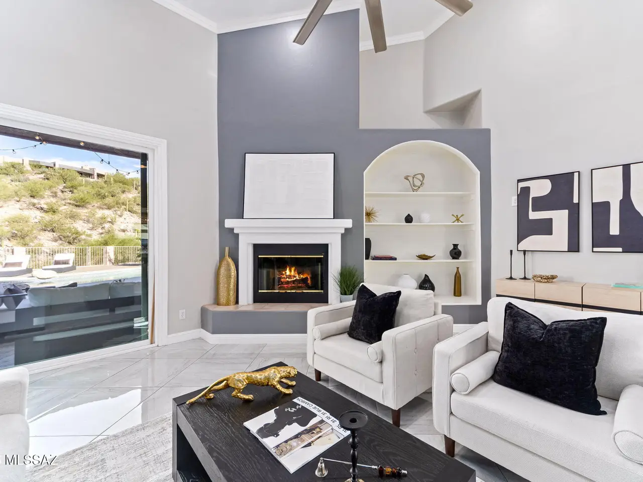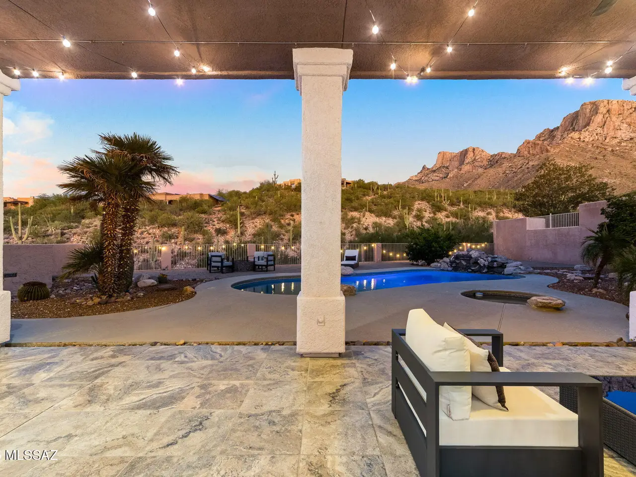 VIEWS! If you've been looking for one of the best mountain views in Oro Valley, this is it! Discover refined living in this thoughtfully updated 4-bedroom, 5-bathroom contemporary home, nestled within the 24-hour guard gated La Reserve community. Spanning 3,300 square feet across two stories, with the primary bedroom DOWNSTAIRS. Step inside to an open great room featuring a gas fireplace seamlessly flowing into a formal dining area and a versatile den/bar with a beverage refrigerator and ice maker. The remodeled kitchen is a culinary haven, boasting custom cabinetry, quartzite countertops, a spacious island with breakfast bar, and premium stainless-steel appliances including a 6-burner gas range, and custom tiled backsplash. The primary suite on the downstairs level offers a serene retreat with unobstructed mountain views of Pusch Ridge, complete with its own entrance to the backyard. The showstopper is the newly renovated master bath that makes you feel like you're at the spa featuring a relaxing soaking tub, a separate spacious walk-in tiled shower, dual floating vanities, and 2 LED mirrors. Also downstairs is a functional office or exercise room. Upstairs, 3 additional bedrooms and 3 additional bathrooms provide privacy. Outside, embrace desert serenity with panoramic views of Pusch Ridge and the Catalina Mountains. The low-maintenance backyard oasis includes a sparkling pebble-tec pool with waterfall, spa, outdoor kitchen with BBQ grill, sink, and refrigerator, plus a cozy fire-pit for year-round enjoyment. The spacious backyard also has several mature citrus trees including grapefruit and orange tree. Additional recent enhancements like new windows, doors, HVAC systems, re-piped water lines, and irrigation ensure modern efficiency. Finishing off the home is a 3 car garage with ample storage. Located in Oro Valley with easy access to top rated golf, shopping, and restaurants, this home offers a perfect balance of luxury and tranquility.