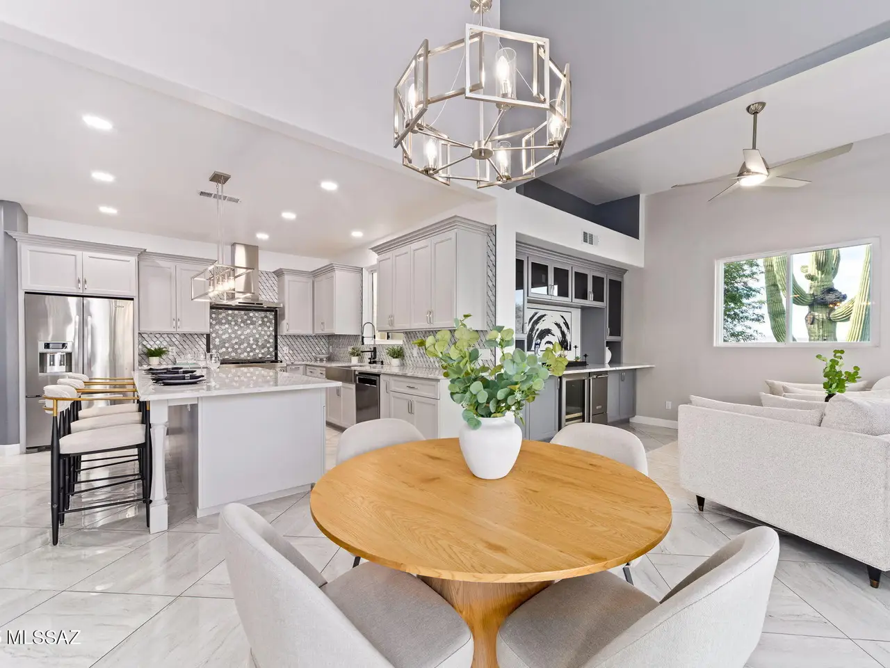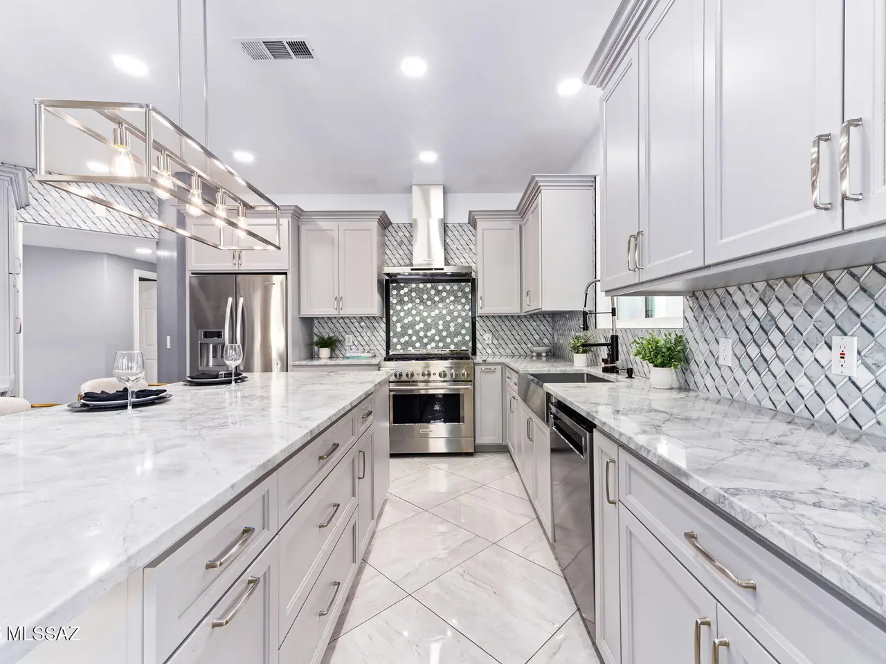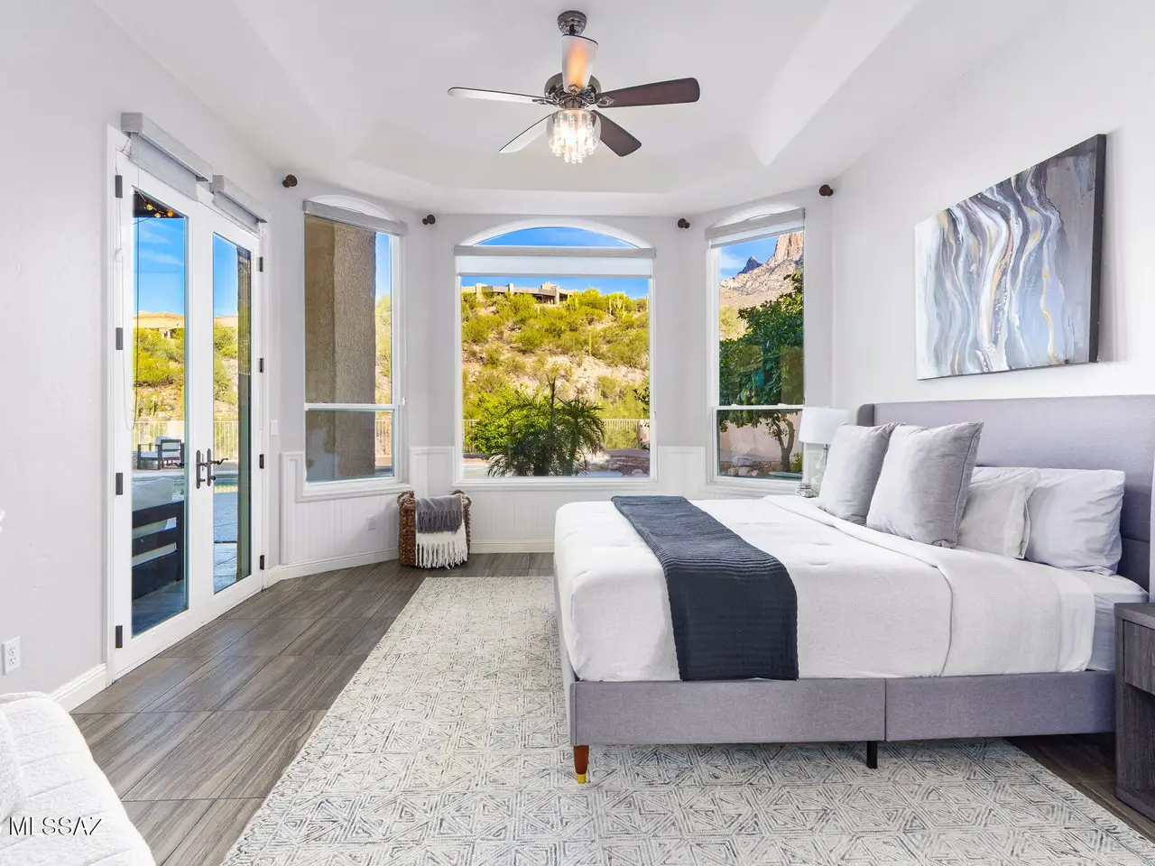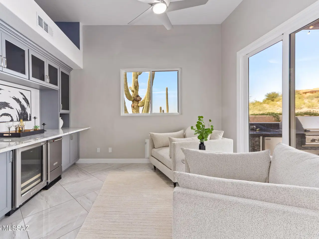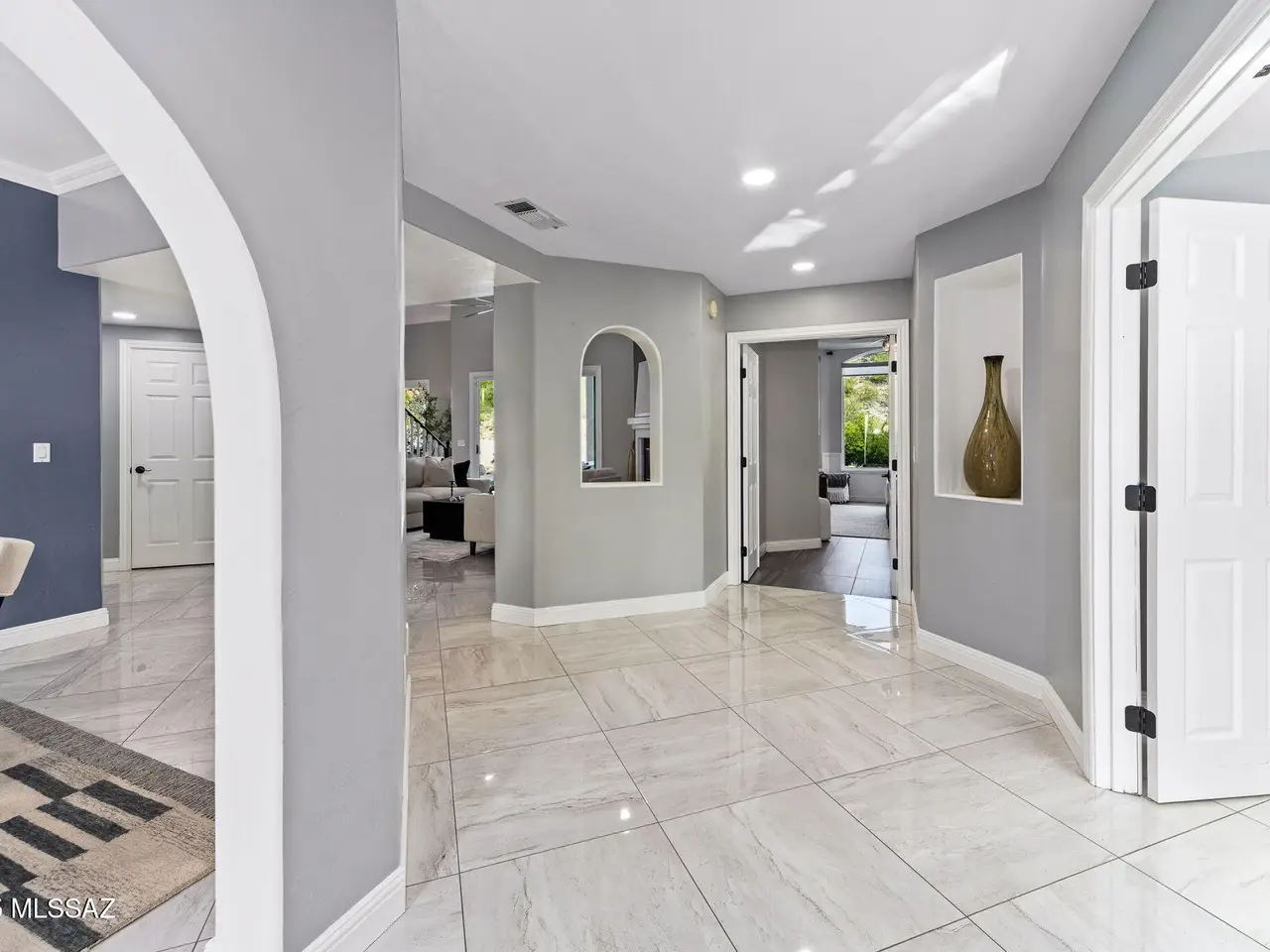 VIEWS! If you've been looking for one of the best mountain views in Oro Valley, this is it! Discover refined living in this thoughtfully updated 4-bedroom, 5-bathroom contemporary home, nestled within the 24-hour guard gated La Reserve community. Spanning 3,300 square feet across two stories, with the primary bedroom DOWNSTAIRS. Step inside to an open great room featuring a gas fireplace seamlessly flowing into a formal dining area and a versatile den/bar with a beverage refrigerator and ice maker. The remodeled kitchen is a culinary haven, boasting custom cabinetry, quartzite countertops, a spacious island with breakfast bar, and premium stainless-steel appliances including a 6-burner gas range, and custom tiled backsplash. The primary suite on the downstairs level offers a serene retreat with unobstructed mountain views of Pusch Ridge, complete with its own entrance to the backyard. The showstopper is the newly renovated master bath that makes you feel like you're at the spa featuring a relaxing soaking tub, a separate spacious walk-in tiled shower, dual floating vanities, and 2 LED mirrors. Also downstairs is a functional office or exercise room. Upstairs, 3 additional bedrooms and 3 additional bathrooms provide privacy. Outside, embrace desert serenity with panoramic views of Pusch Ridge and the Catalina Mountains. The low-maintenance backyard oasis includes a sparkling pebble-tec pool with waterfall, spa, outdoor kitchen with BBQ grill, sink, and refrigerator, plus a cozy fire-pit for year-round enjoyment. The spacious backyard also has several mature citrus trees including grapefruit and orange tree. Additional recent enhancements like new windows, doors, HVAC systems, re-piped water lines, and irrigation ensure modern efficiency. Finishing off the home is a 3 car garage with ample storage. Located in Oro Valley with easy access to top rated golf, shopping, and restaurants, this home offers a perfect balance of luxury and tranquility.