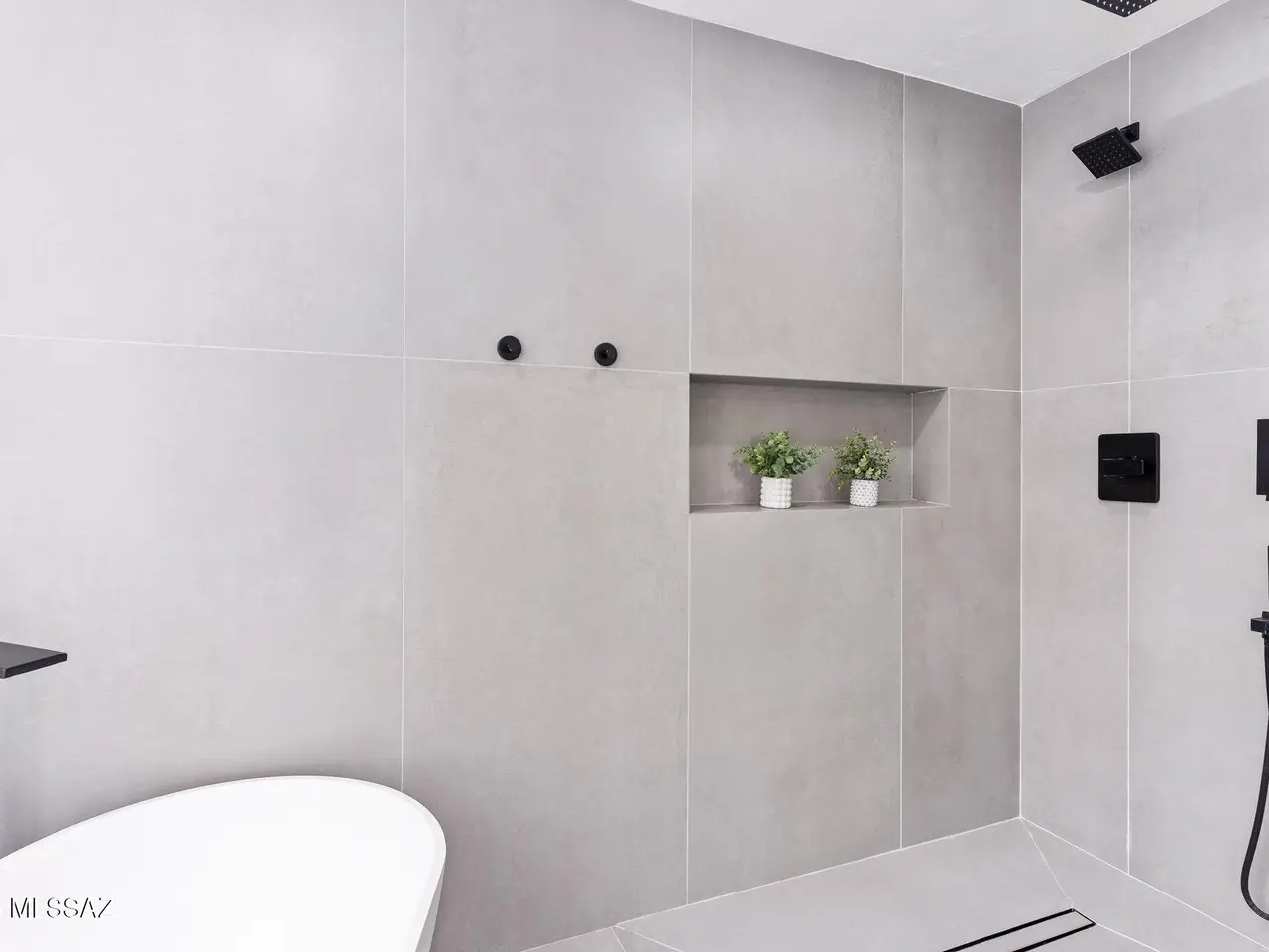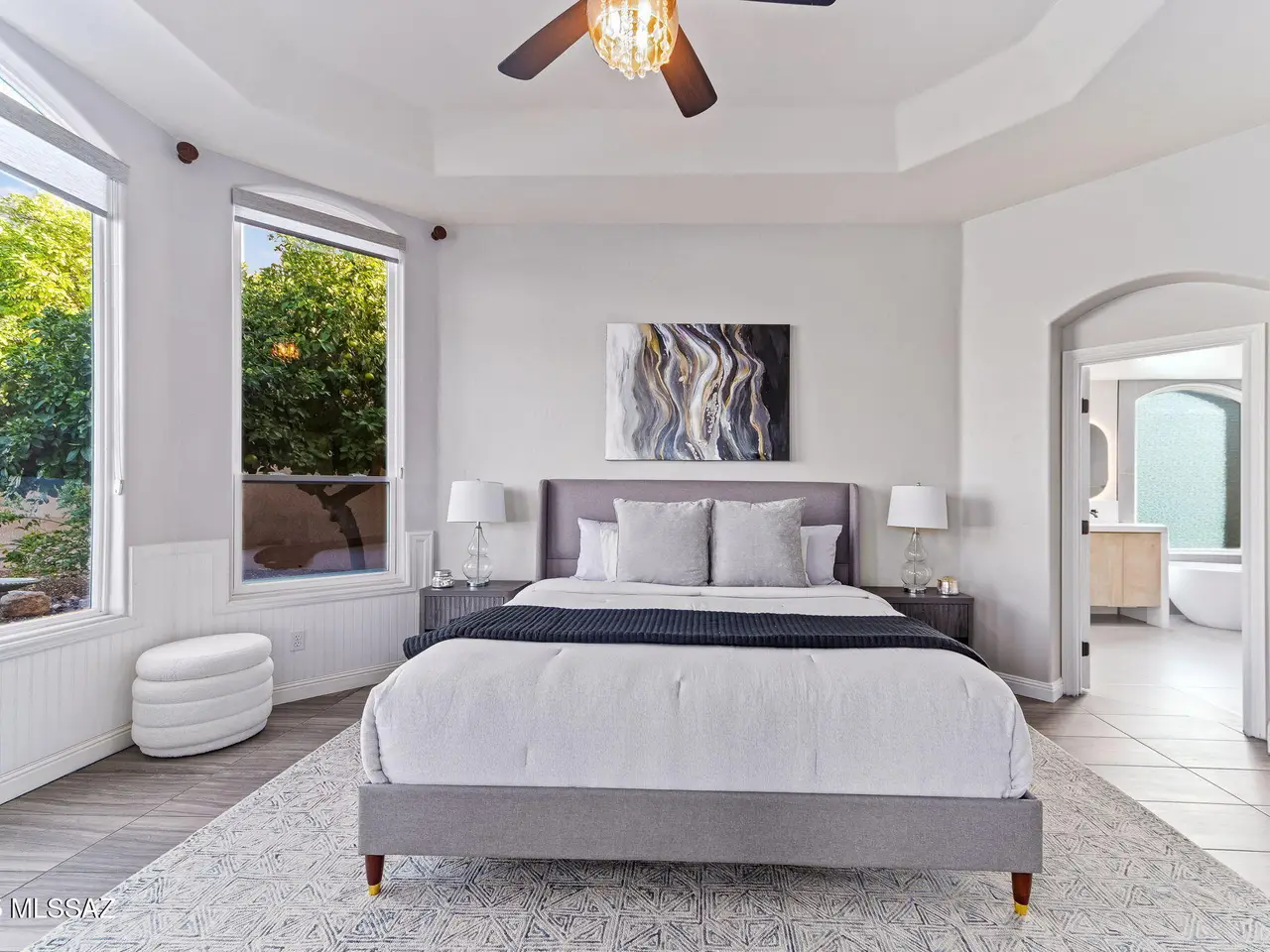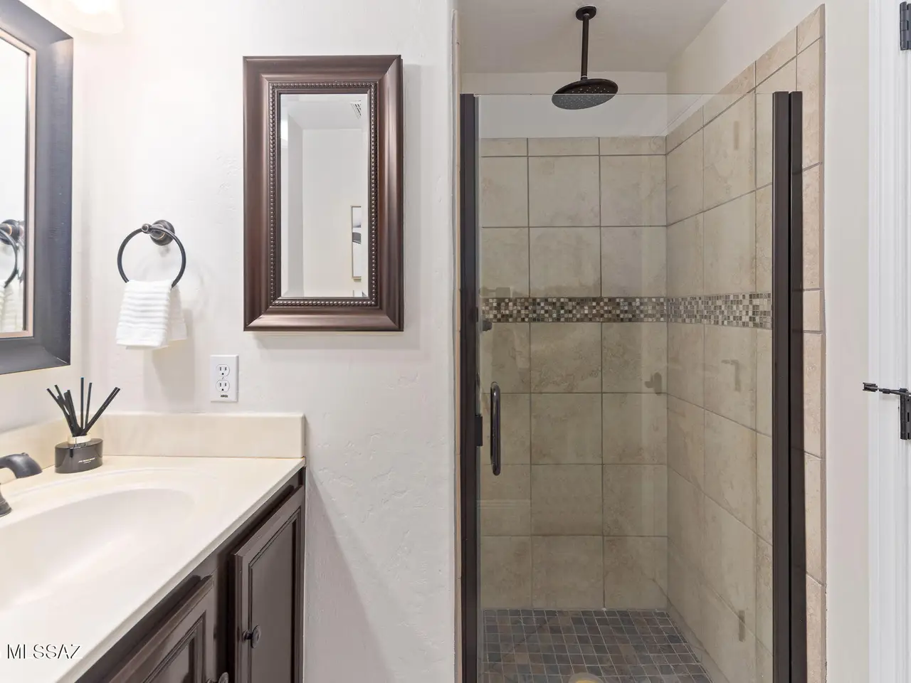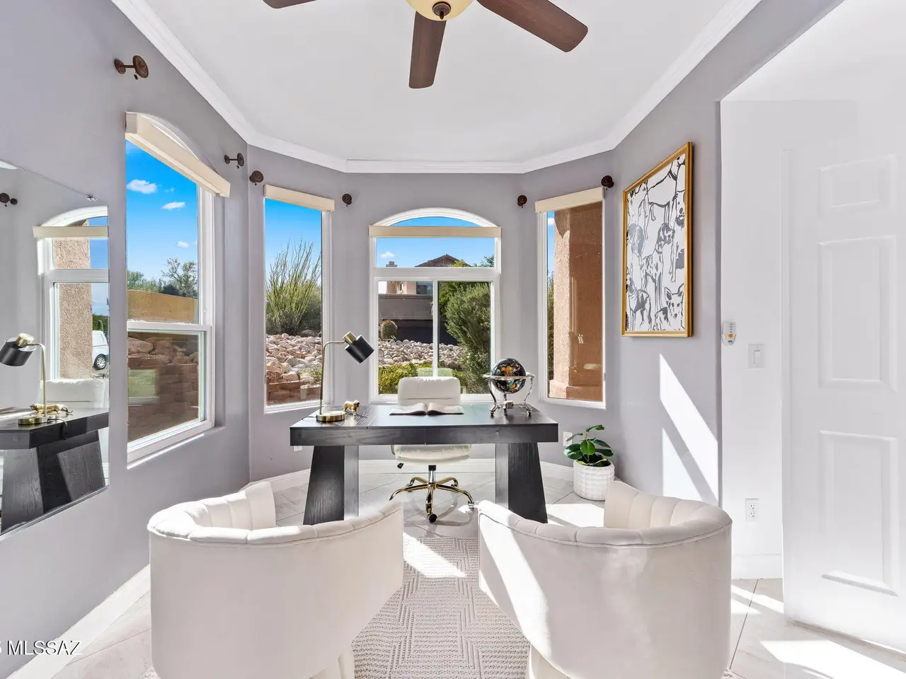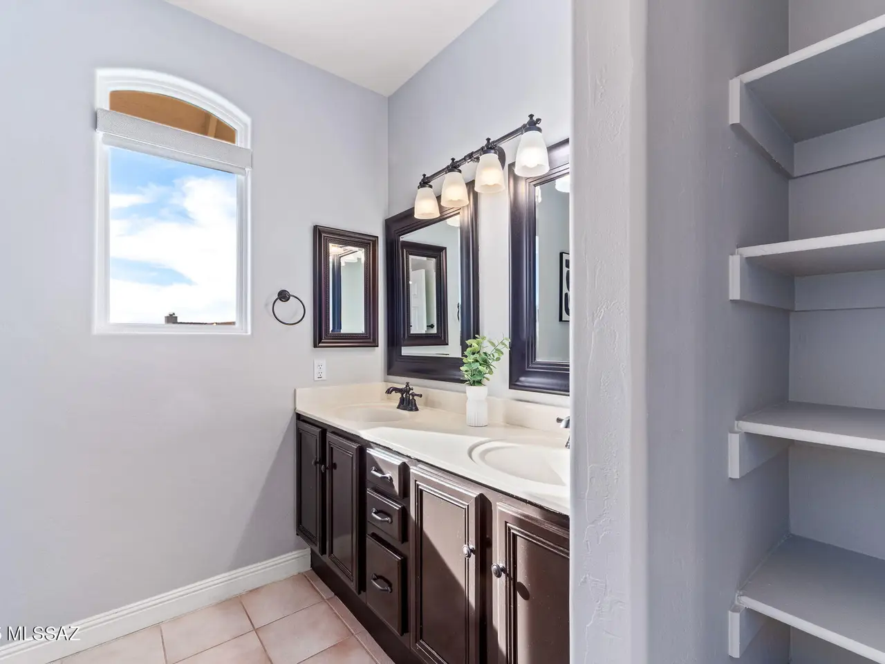 VIEWS! If you've been looking for one of the best mountain views in Oro Valley, this is it! Discover refined living in this thoughtfully updated 4-bedroom, 5-bathroom contemporary home, nestled within the 24-hour guard gated La Reserve community. Spanning 3,300 square feet across two stories, with the primary bedroom DOWNSTAIRS. Step inside to an open great room featuring a gas fireplace seamlessly flowing into a formal dining area and a versatile den/bar with a beverage refrigerator and ice maker. The remodeled kitchen is a culinary haven, boasting custom cabinetry, quartzite countertops, a spacious island with breakfast bar, and premium stainless-steel appliances including a 6-burner gas range, and custom tiled backsplash. The primary suite on the downstairs level offers a serene retreat with unobstructed mountain views of Pusch Ridge, complete with its own entrance to the backyard. The showstopper is the newly renovated master bath that makes you feel like you're at the spa featuring a relaxing soaking tub, a separate spacious walk-in tiled shower, dual floating vanities, and 2 LED mirrors. Also downstairs is a functional office or exercise room. Upstairs, 3 additional bedrooms and 3 additional bathrooms provide privacy. Outside, embrace desert serenity with panoramic views of Pusch Ridge and the Catalina Mountains. The low-maintenance backyard oasis includes a sparkling pebble-tec pool with waterfall, spa, outdoor kitchen with BBQ grill, sink, and refrigerator, plus a cozy fire-pit for year-round enjoyment. The spacious backyard also has several mature citrus trees including grapefruit and orange tree. Additional recent enhancements like new windows, doors, HVAC systems, re-piped water lines, and irrigation ensure modern efficiency. Finishing off the home is a 3 car garage with ample storage. Located in Oro Valley with easy access to top rated golf, shopping, and restaurants, this home offers a perfect balance of luxury and tranquility.