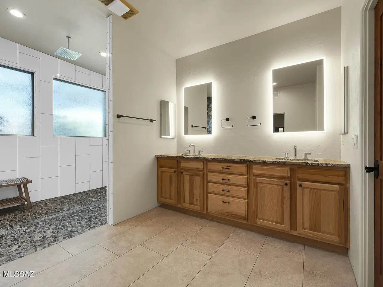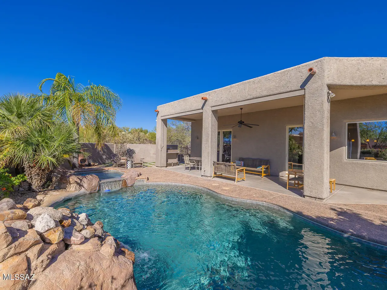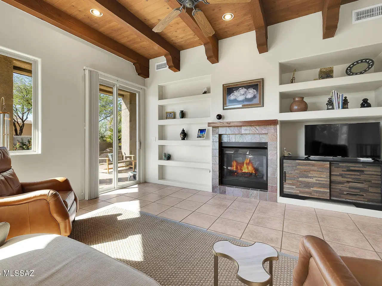 Experience refined desert living in this stunning 4BR/2.5BA custom home in the exclusive gated community of The Estates at High Mesa in Oro Valley. Set on a private 0.65-acre lot surrounded by lush landscape and sweeping mountain views, this 3,175 sq. ft. residence blends luxury and comfort throughout. Enjoy formal living and dining areas, a family room with Viga beams and dual-sided fireplace flows to a versatile bonus room with patio access ideal for entertaining. The chef's kitchen features hickory cabinetry, granite counters, large walk-in pantry, and new state-of-the-art appliances. The owner's suite offers French doors, private patio access, completely remodeled spa-inspired bath with soaking tub, 5-head shower, and spacious walk-in closet. Split floor plan provides privacy