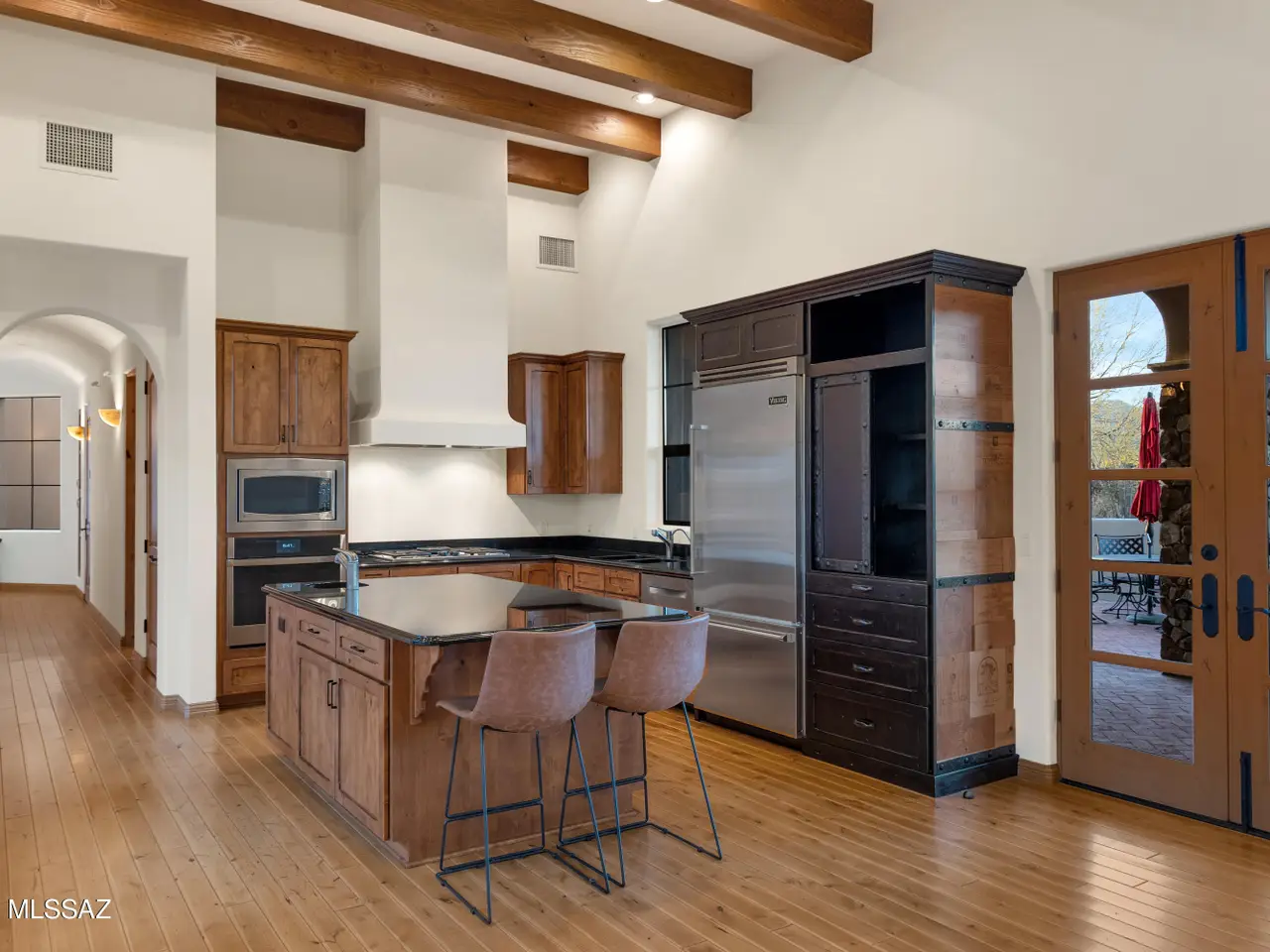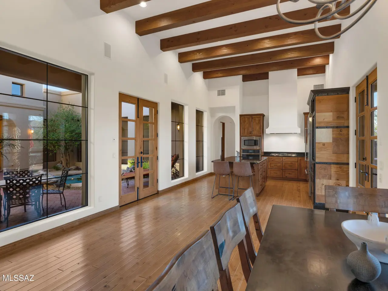 Enduring Mediterranean influence by RB Construction, SOLID masonry construction for unmatched durability and timeless architecture. 4,484 sq ft of grand scale living space, this home presents a unique tranquil interior courtyard complete with a soothing spa and expansive paneled windows that frame the space beautifully. Adding to its appeal, the property is situated adjacent to 26 acres of pristine conservation easement, ensuring a serene natural backdrop and enhanced privacy.Upon entering, you're greeted by a striking wood-beamed foyer that seamlessly transitions into a sophisticated kitchen featuring black granite countertops, a prep sink, large island with a built-in dining area overlooking the patio.