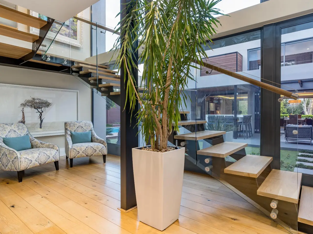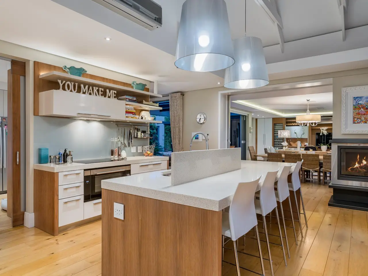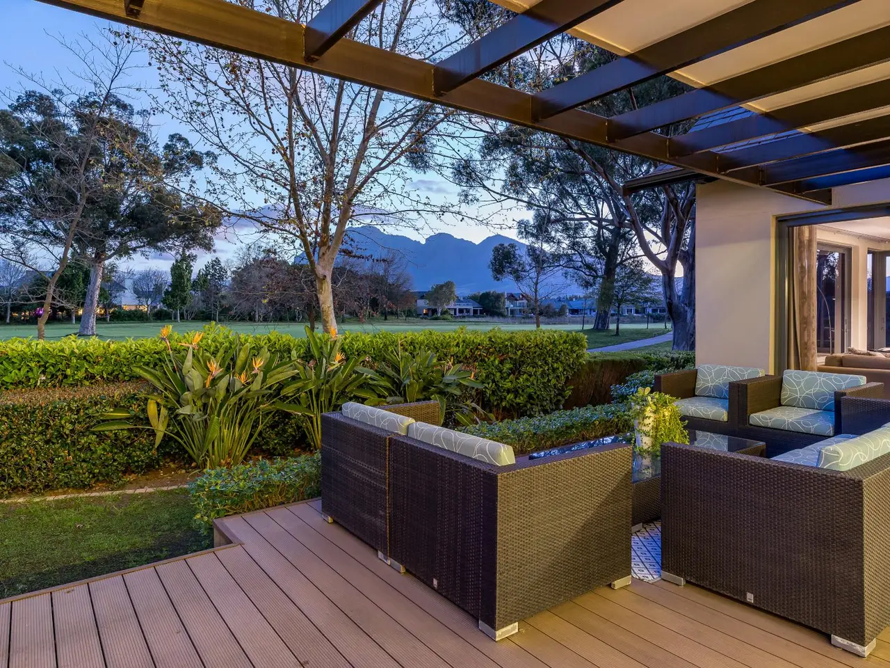 This impeccable property sets the bar for a home on Pearl Valley Golf and Country Estate. The superb location, on the 14th fairway of the award winning Jack Nicklaus Pearl Valley Golf Course, gave the architect an opportunity to work with a great stand and to match the homeowners requirements with the natural beauty of the golf course and surrounding mountain ranges with impressive results. The views from this property are magical. From the home's threshold there are views through floor-to-ceiling glass across the central garden area and beyond making the unique layout truly captivating on entering the property. The living spaces are crafted by a refined and highly practical floor plan with an open plan custom designed kitchen, with integrated Gaggenau appliances, that connects with a number of interior living spaces as well as offering direct access to the stunning outdoor areas including a covered patio, scenic garden, heated pool and sundecks - all that invites for amazing entertaining. Located on the ground floor there is a luxurious guest suite, for undisturbed privacy, as well as a gym / studio / library / study room, guest cloakroom, a utility room as well as a separate laundry room with a laundry shoot from the first floor, staff accommodation, a storage room and 3 garages. The first floor comprises 3 spacious bedroom suites, including the master, as well as a sleek home office sited at the entrance to the landing of the floor. The master suite is beautiful - all that one would expect from a home of this caliber. There are many added features to this meticulous home that includes energy efficient systems of heat pump underfloor heating, solar panels with an inverter battery backup system and LED lighting, engineered wooden flooring, a smart home automation system, a Hergam combustion fireplace, air conditioning throughout, direct access for a golf cart to the golf course and so much more. Custom Features Golf cart garage and car port Underfloor heating system Engineerd wooden flooring Integrated Gaggenau Fridge freezer and wine cooler Home Automation system LED lights through out home Laundry shoot in scullery Full staff accomodation with en-suite and store room Heated pool Caesar stone in kitchen Wood fireplace Portico Entrance Water tank Engineered komposit