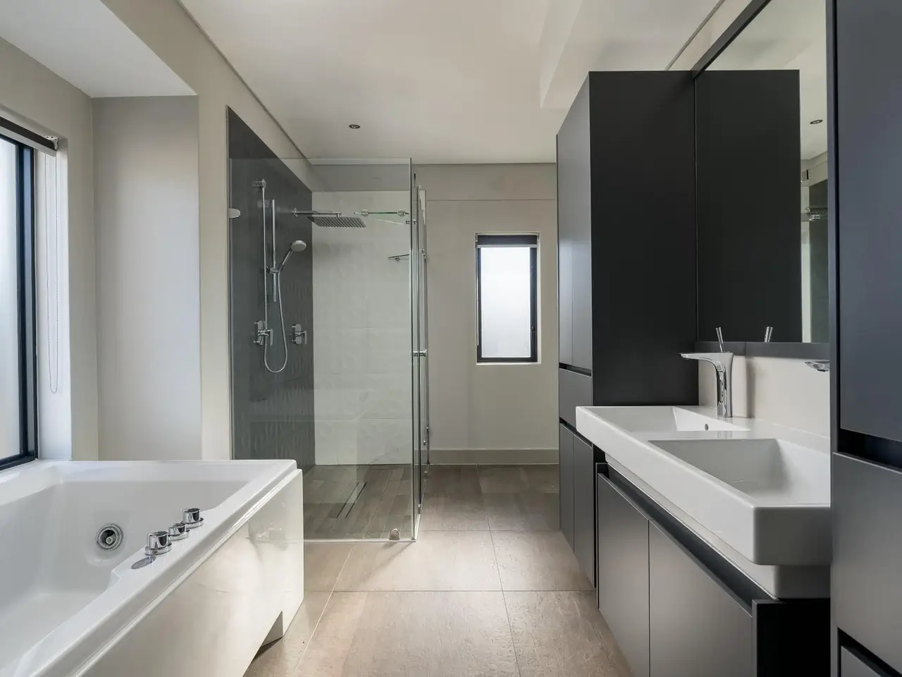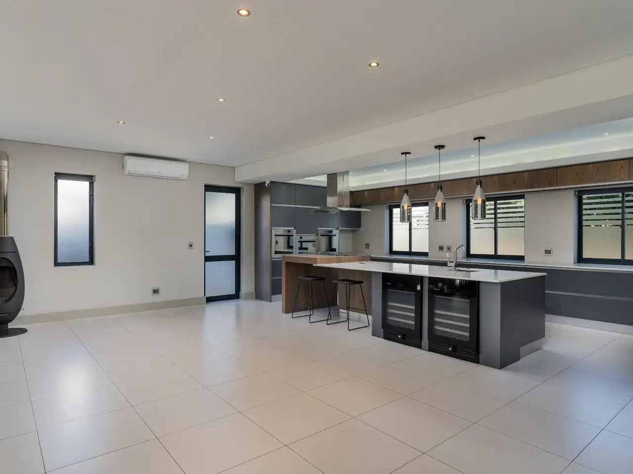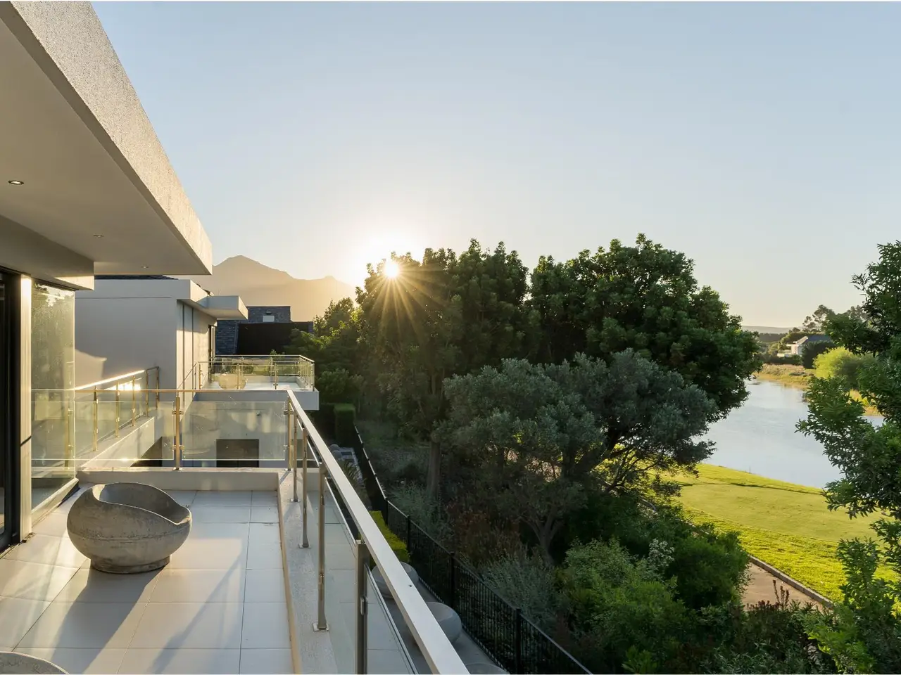 Indulge in modern living in this stunning four-bedroom, all-en-suite home nestled on the prestigious Pearl Valley Golf Estate. This north-facing property offers breathtaking views of the Jack Nicklaus Signature Golf Course. A sleek water feature welcomes you when you park in the driveway and entice you to enter the double volume foyer. Large glass panels and folding doors glide open to bring abundant natural light and views into the entertainment areas. Open-plan living areas designed for effortless entertaining and flows out to a private heated pool and expansive patio perfect for al fresco dining. The well designed and equipped modern kitchen caters for any occasion and completes the enviting feel of beautiful views to the green golf course. The property boasts four generously sized bedrooms, each with a luxurious en-suite bathroom. The main bedroom is located on the first floor of the property and spoils any stay with a private balcony overlooking the course, lake and Boland mountains. It also has a comfortable walk-in wardrobe and luxurious bathroom. Two more bedrooms are on the first floor, each with their own balcony and beautiful views. The fourth bedroom is on the ground level with access directly to the well landscaped and manicured garden. This property is in an immaculate condition, ready to welcome you home in a quiet Cul de Sac. Ideally located within walking distance of the Pearl Valley Clubhouse and facilities. Experience the ultimate in luxury living. Contact us today to schedule a private viewing.