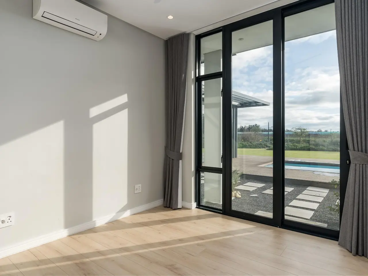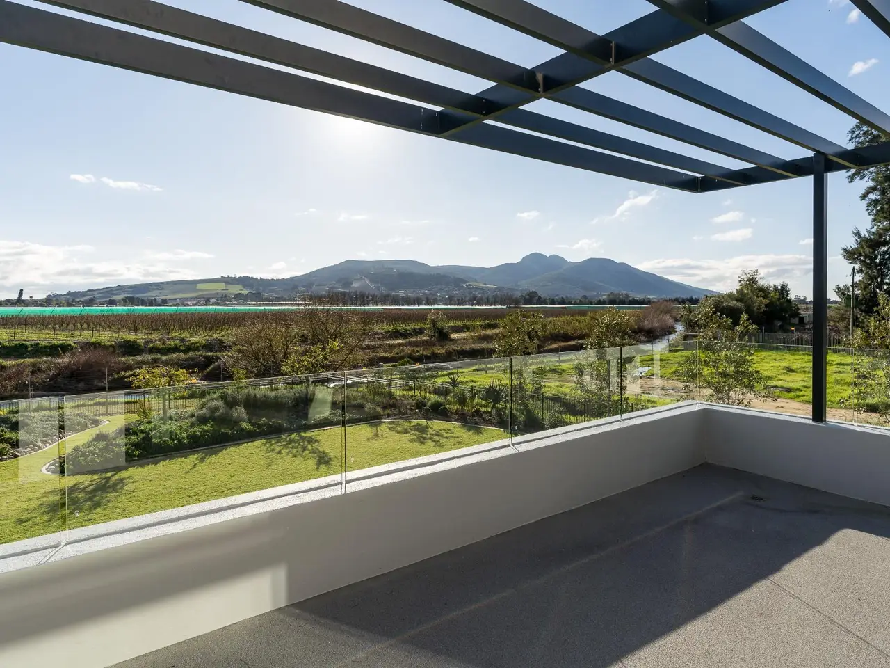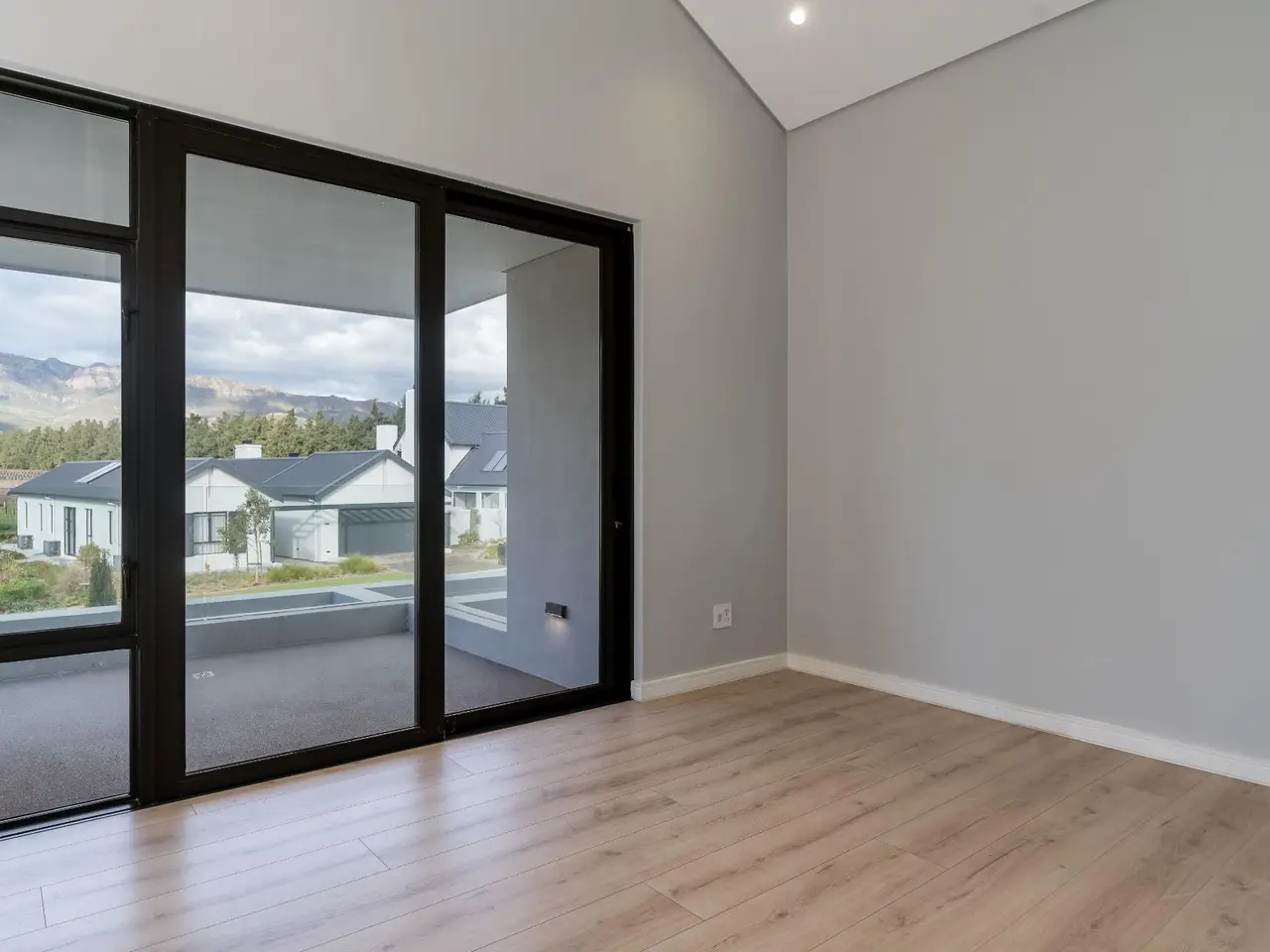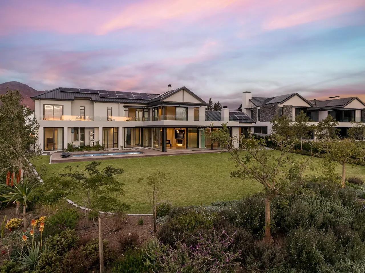 Where mountain views, modern design, and estate lifestyle meet. Situated in the prestigious River Farm area of Val de Vie Estate, this beautifully designed five-bedroom residence offers panoramic views of the Berg River, private vineyards and mountain ranges - an ideal blend of natural beauty and sophisticated living. The layout is thoughtfully planned for both family life and entertaining. The open-concept living space features large glass doors that flood the interior with natural light and lead to a covered entertainment area complete with a built-in braai and bar. A stylish kitchen with a central island, walk-in pantry, and scullery caters to both everyday use and special gatherings. A sliding window brings fresh air and scenic garden views directly into the cooking space. Upstairs, three luxurious en-suite bedrooms open onto a balcony with river and mountain vistas. The main suite is a standout, offering a spacious bathroom with double vanities and a double shower. An additional lounge upstairsGÇöideal for a home office or reading area - also enjoys its own balcony access. Downstairs, two more bedrooms (one en-suite) open to the landscaped garden, creating a private wing perfect for guests or multi-generational living. A second lounge on this level offers added flexibility for quiet evenings or family movie nights. The home is equipped with solar panels, a powerful 30kW inverter system, air conditioning throughout, and a heated saltwater pool - designed for comfort and sustainability. A double garage, separate laundry room, and staff WC round out the practical features. Living in Val de Vie Estate means access to world-class amenities including state-of-the-art security, wellness facilities, top-rated restaurants, scenic trails, polo fields, and quite a few elite schools.