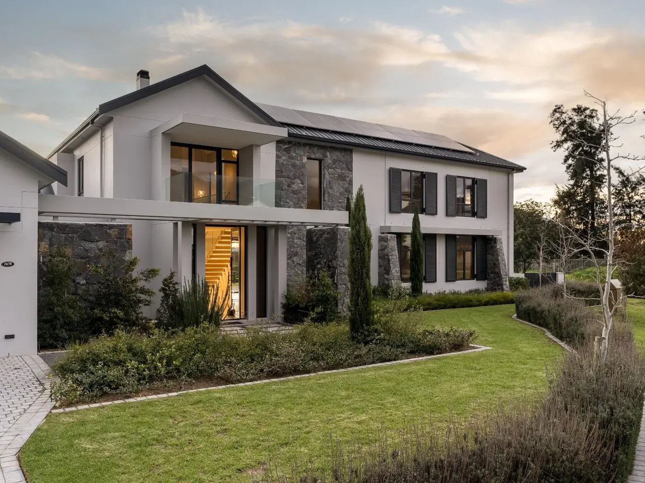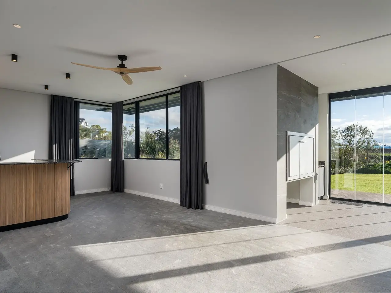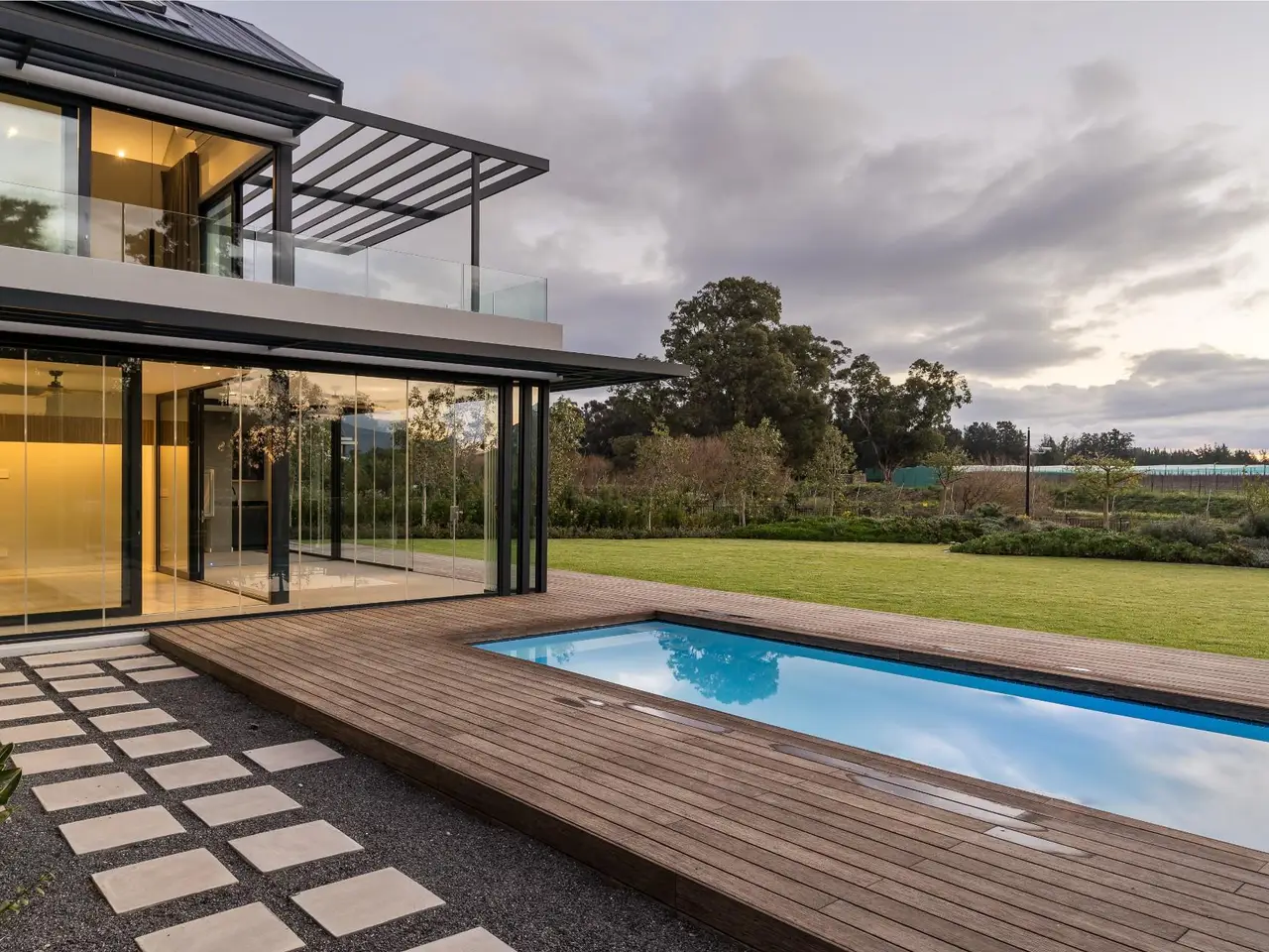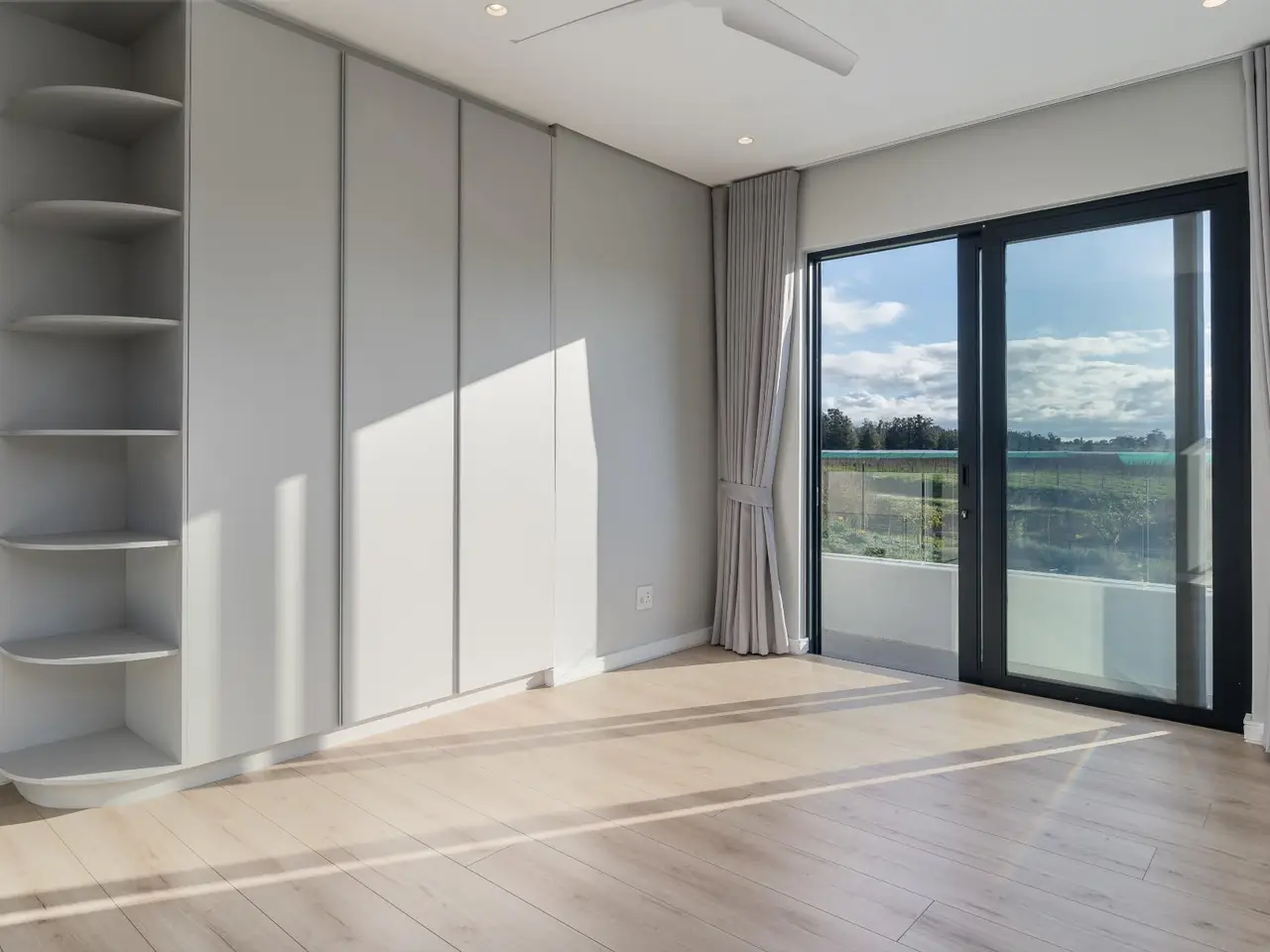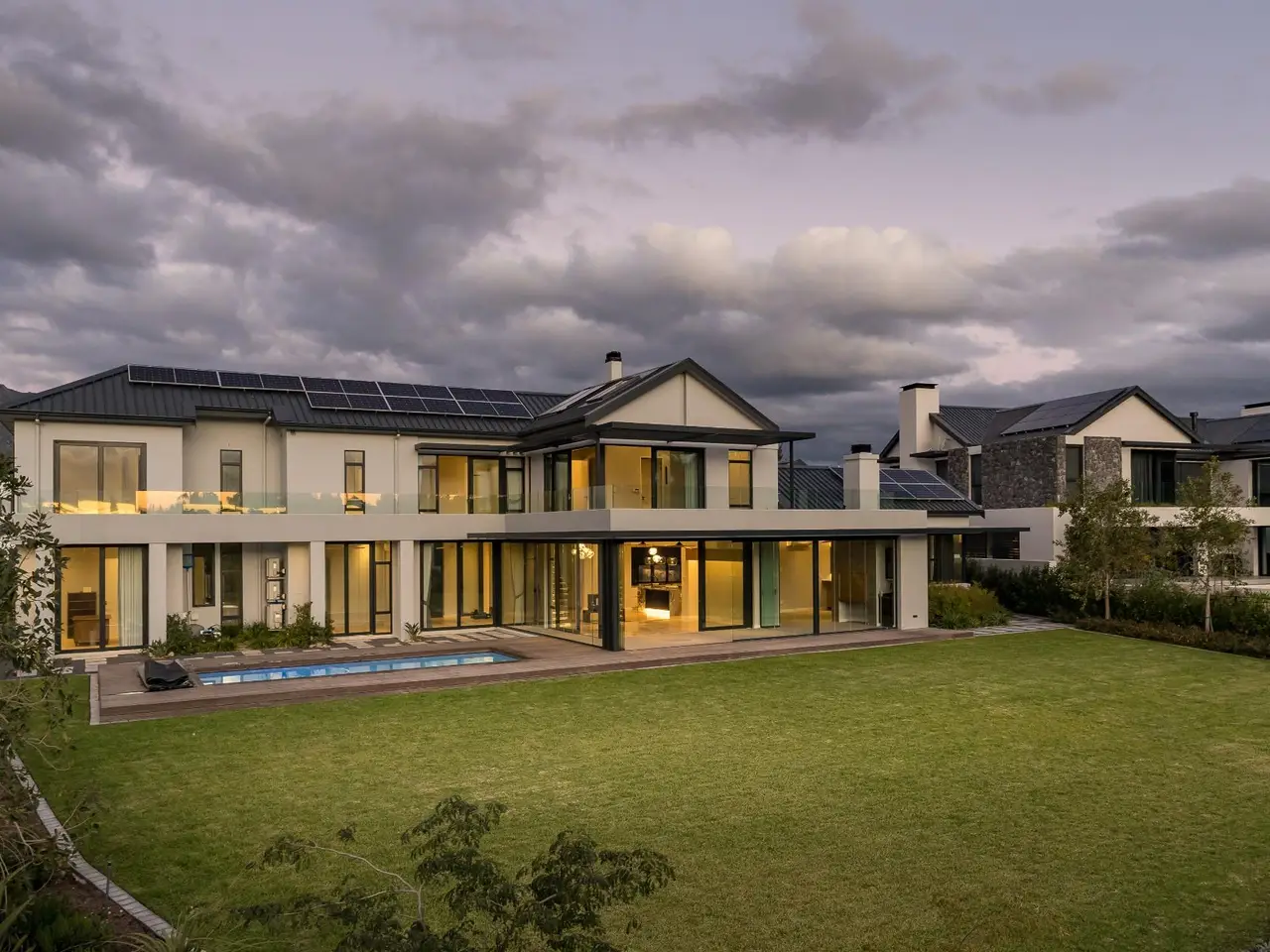 Where mountain views, modern design, and estate lifestyle meet. Situated in the prestigious River Farm area of Val de Vie Estate, this beautifully designed five-bedroom residence offers panoramic views of the Berg River, private vineyards and mountain ranges - an ideal blend of natural beauty and sophisticated living. The layout is thoughtfully planned for both family life and entertaining. The open-concept living space features large glass doors that flood the interior with natural light and lead to a covered entertainment area complete with a built-in braai and bar. A stylish kitchen with a central island, walk-in pantry, and scullery caters to both everyday use and special gatherings. A sliding window brings fresh air and scenic garden views directly into the cooking space. Upstairs, three luxurious en-suite bedrooms open onto a balcony with river and mountain vistas. The main suite is a standout, offering a spacious bathroom with double vanities and a double shower. An additional lounge upstairsGÇöideal for a home office or reading area - also enjoys its own balcony access. Downstairs, two more bedrooms (one en-suite) open to the landscaped garden, creating a private wing perfect for guests or multi-generational living. A second lounge on this level offers added flexibility for quiet evenings or family movie nights. The home is equipped with solar panels, a powerful 30kW inverter system, air conditioning throughout, and a heated saltwater pool - designed for comfort and sustainability. A double garage, separate laundry room, and staff WC round out the practical features. Living in Val de Vie Estate means access to world-class amenities including state-of-the-art security, wellness facilities, top-rated restaurants, scenic trails, polo fields, and quite a few elite schools.
