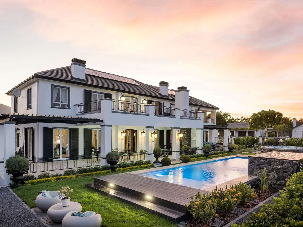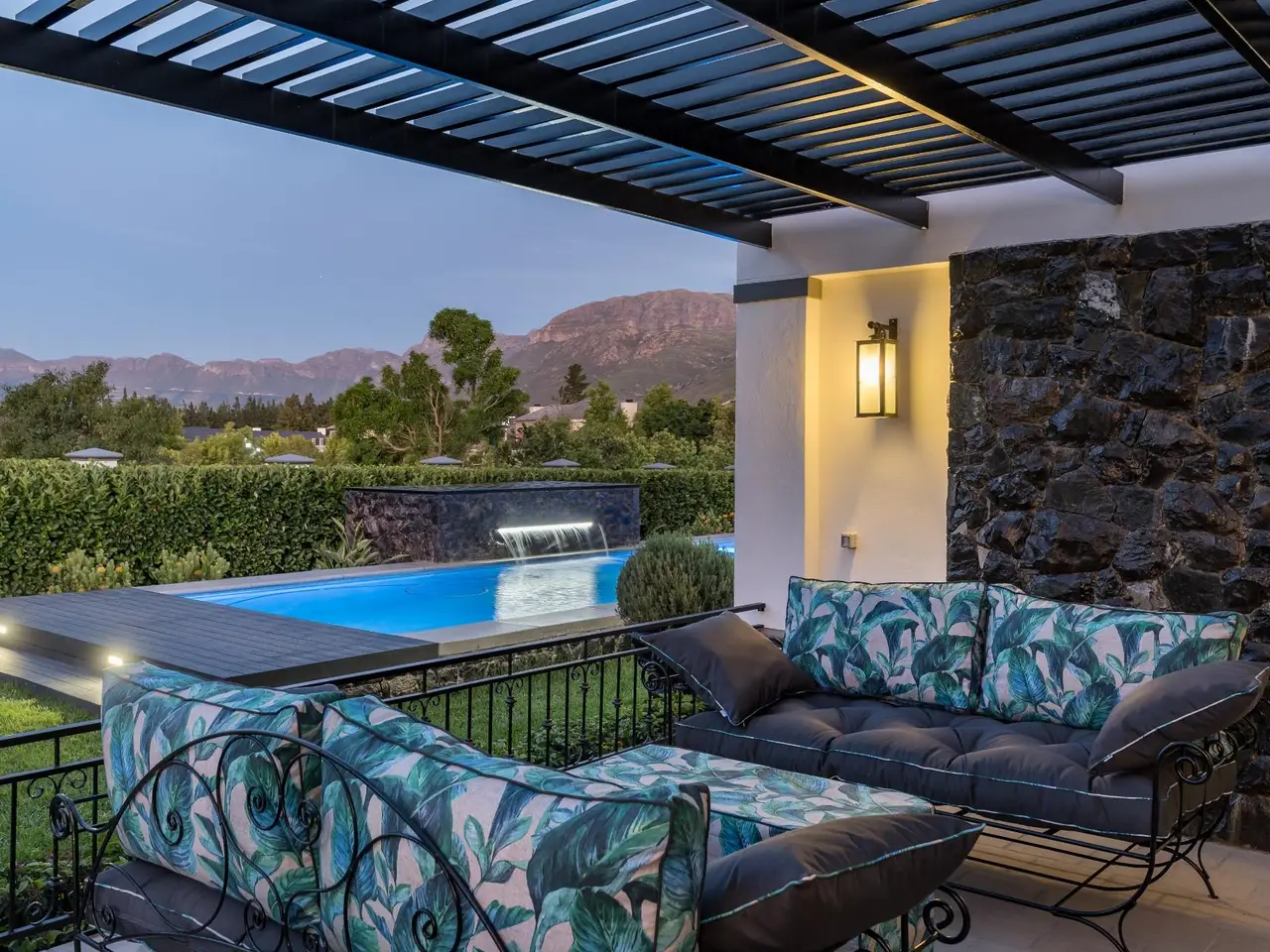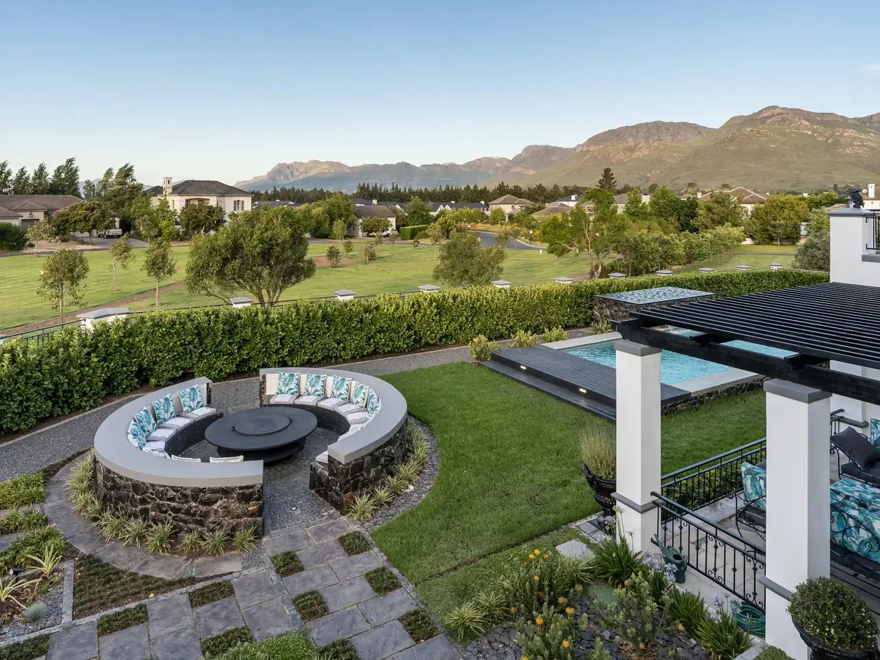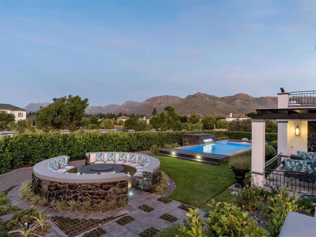 Cocooned between a serene Fynbos Reserve and manicured parklands lies this remarkable residence, offering breathtaking views of the Simonsberg mountains. Panoramic windows frame these stunning vistas, creating a seamless connection between indoor and outdoor ambiance. Designed with both elegance and practicality in mind, the open-plan kitchen, living, and dining areas are perfect for modern living. Custom cabinetry made from reclaimed railway sleepers compliments the black granite of the breakfast nook, which takes centre stage in the kitchen and allows one to gaze at the mesmerizing views. The space is further enhanced by a walk-in pantry, scullery/ laundry and French doors that open to a private courtyard garden. The northern side of the home cleverly offers an an undercover patio, accessed via French doors and spanning the entire frontage , effortlessly linking the sunlit interiors to the surrounding natural beauty, while offering protection from the wind. A beautifully landscaped garden framed by lush hedges offers an expansive pool, fabulous firepit and direct access to a stunning green belt. Downstairs also hosts a formal lounge with wood burning fireplace and a guest bedroom featuring its own private patio. The master suite is exceptional in size and comforts and enjoys sweeping views from both sides. A true sanctuary, complete with a spacious dressing room, luxurious en suite bathroom, underfloor heating and a private balcony. There are two additional en suite bedrooms upstairs, one of which offers a spa bath and sauna in the bathroom. Additionally, a North facing home office opens onto the balcony, offering more mountain views. Finishing off this incredible home are 3 garages, a CCTV and motion-sensor system, outdoor lighting for security, heat pump & automated pool cover for energy efficiency and solar power system with batteries & inverter. Set in one of Val de Vie EstateGÇÖs most sought-after locations, this home blends refined luxury with functional design and natural beauty, making it one of the most desirable properties on Val de Vie Estate. The home is sold fully furnished and includes valuable artwork and bespoke furniture, as well as appliances. Further details can be provided on request.
