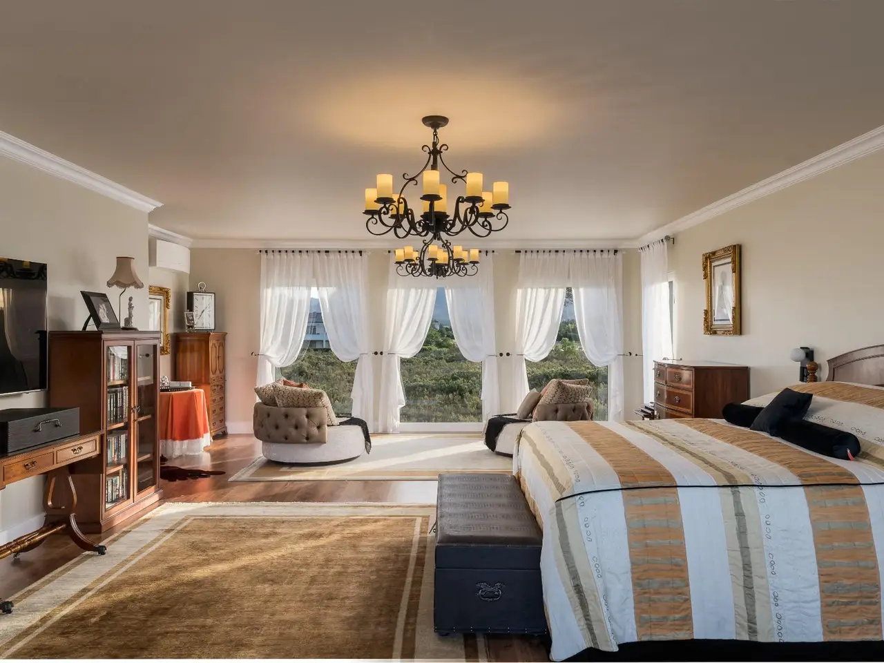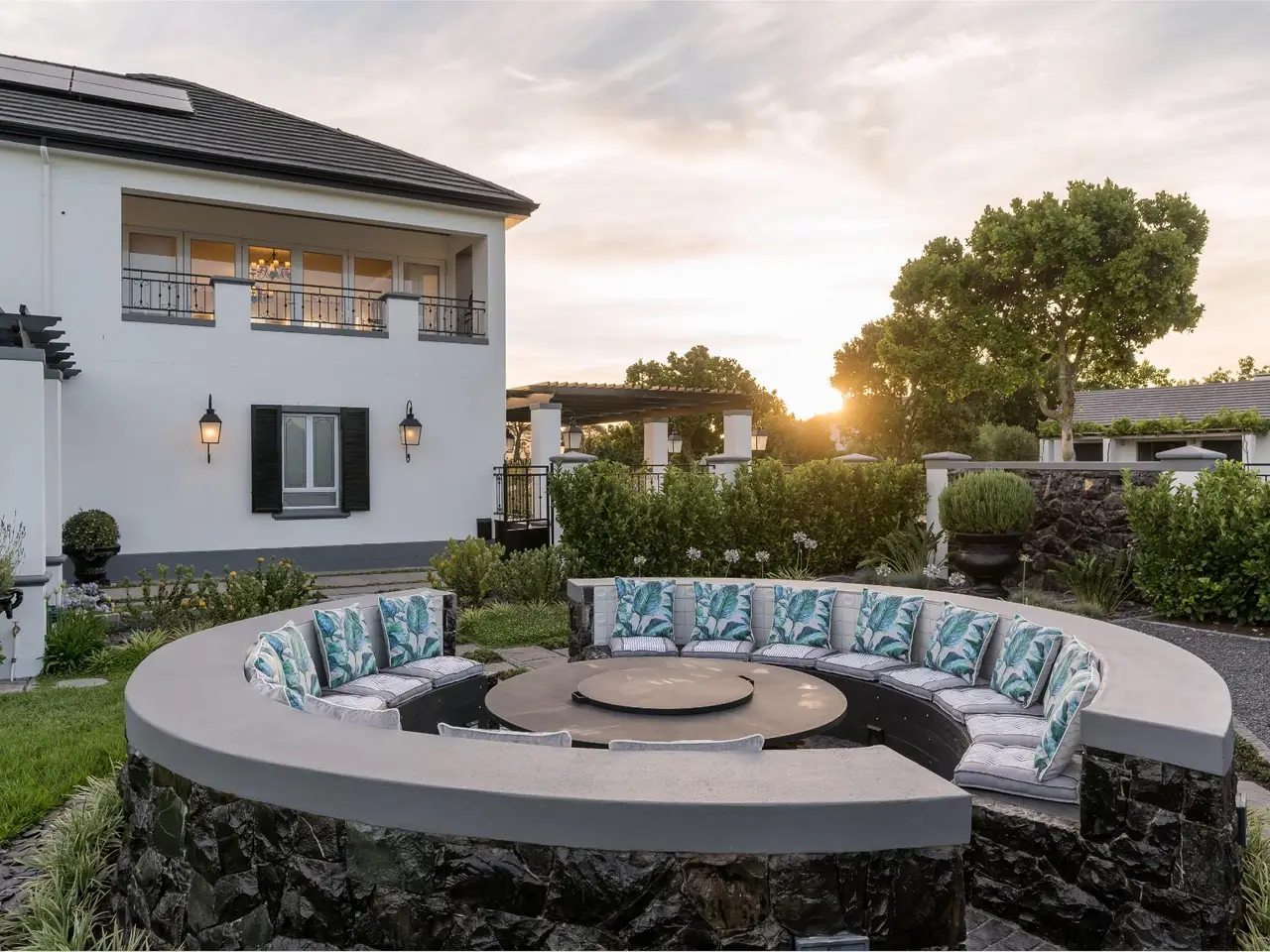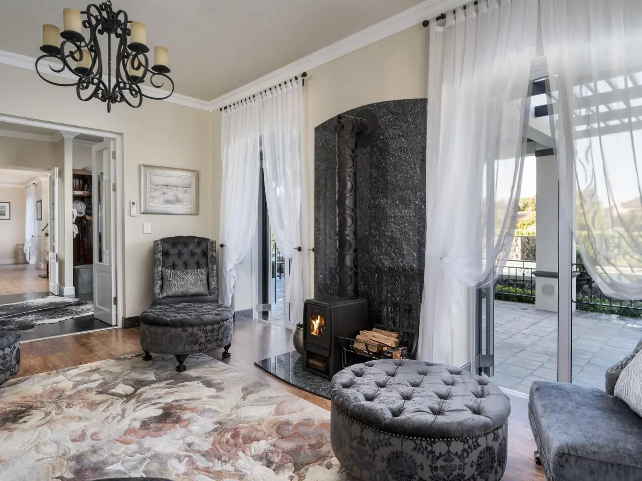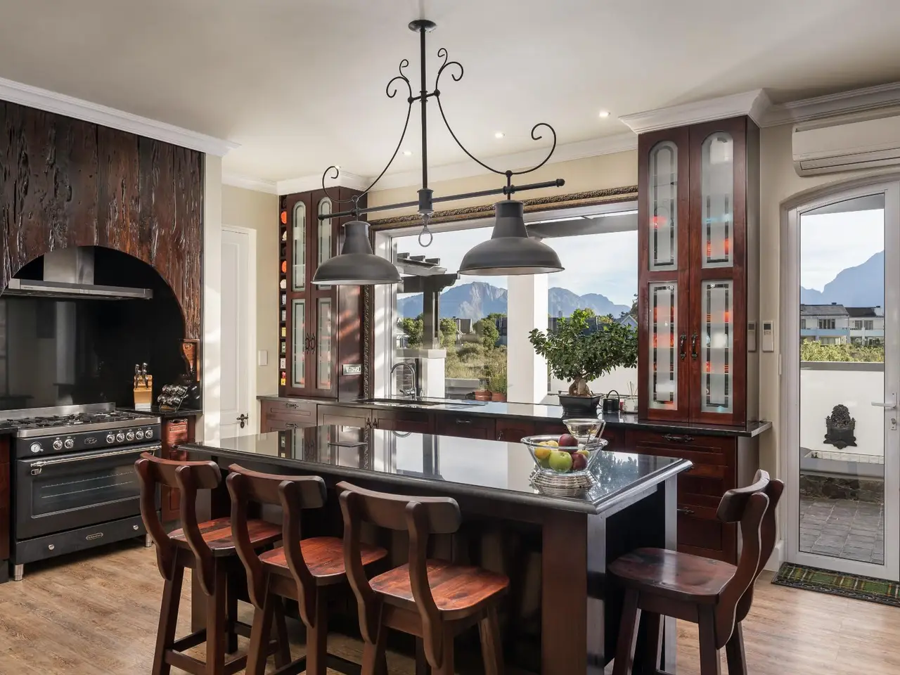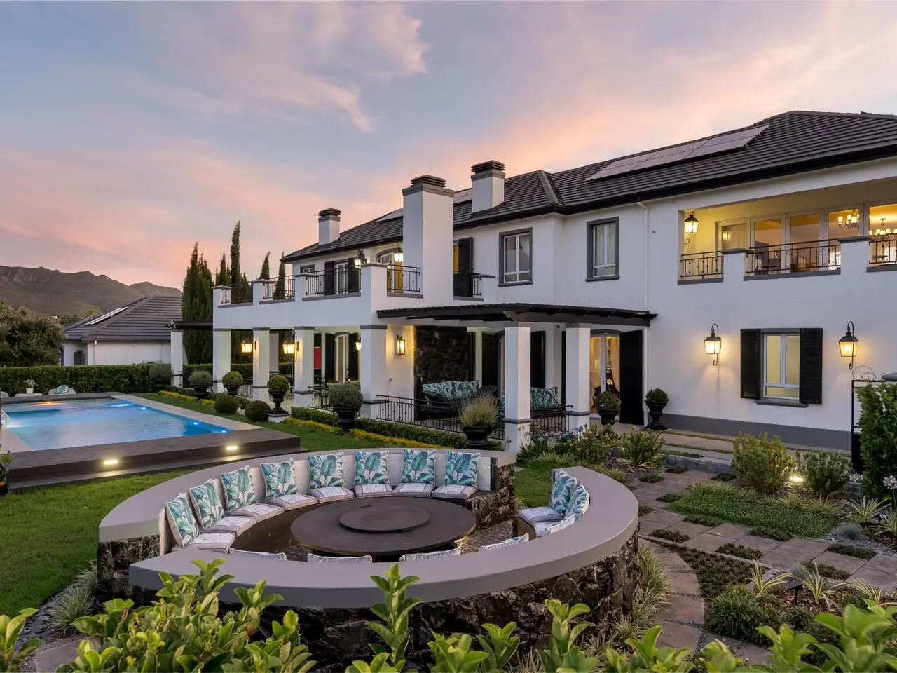 Cocooned between a serene Fynbos Reserve and manicured parklands lies this remarkable residence, offering breathtaking views of the Simonsberg mountains. Panoramic windows frame these stunning vistas, creating a seamless connection between indoor and outdoor ambiance. Designed with both elegance and practicality in mind, the open-plan kitchen, living, and dining areas are perfect for modern living. Custom cabinetry made from reclaimed railway sleepers compliments the black granite of the breakfast nook, which takes centre stage in the kitchen and allows one to gaze at the mesmerizing views. The space is further enhanced by a walk-in pantry, scullery/ laundry and French doors that open to a private courtyard garden. The northern side of the home cleverly offers an an undercover patio, accessed via French doors and spanning the entire frontage , effortlessly linking the sunlit interiors to the surrounding natural beauty, while offering protection from the wind. A beautifully landscaped garden framed by lush hedges offers an expansive pool, fabulous firepit and direct access to a stunning green belt. Downstairs also hosts a formal lounge with wood burning fireplace and a guest bedroom featuring its own private patio. The master suite is exceptional in size and comforts and enjoys sweeping views from both sides. A true sanctuary, complete with a spacious dressing room, luxurious en suite bathroom, underfloor heating and a private balcony. There are two additional en suite bedrooms upstairs, one of which offers a spa bath and sauna in the bathroom. Additionally, a North facing home office opens onto the balcony, offering more mountain views. Finishing off this incredible home are 3 garages, a CCTV and motion-sensor system, outdoor lighting for security, heat pump & automated pool cover for energy efficiency and solar power system with batteries & inverter. Set in one of Val de Vie EstateGÇÖs most sought-after locations, this home blends refined luxury with functional design and natural beauty, making it one of the most desirable properties on Val de Vie Estate. The home is sold fully furnished and includes valuable artwork and bespoke furniture, as well as appliances. Further details can be provided on request.