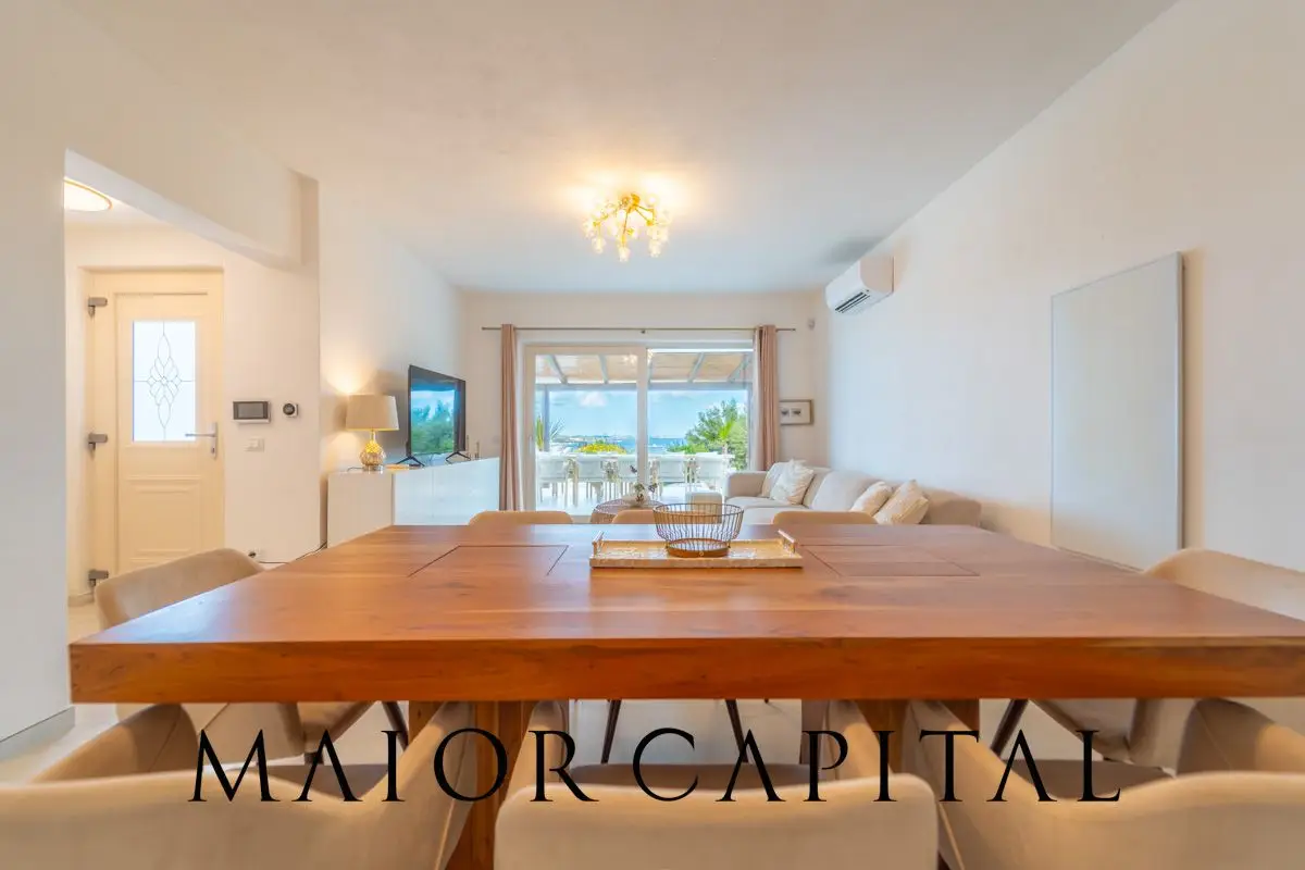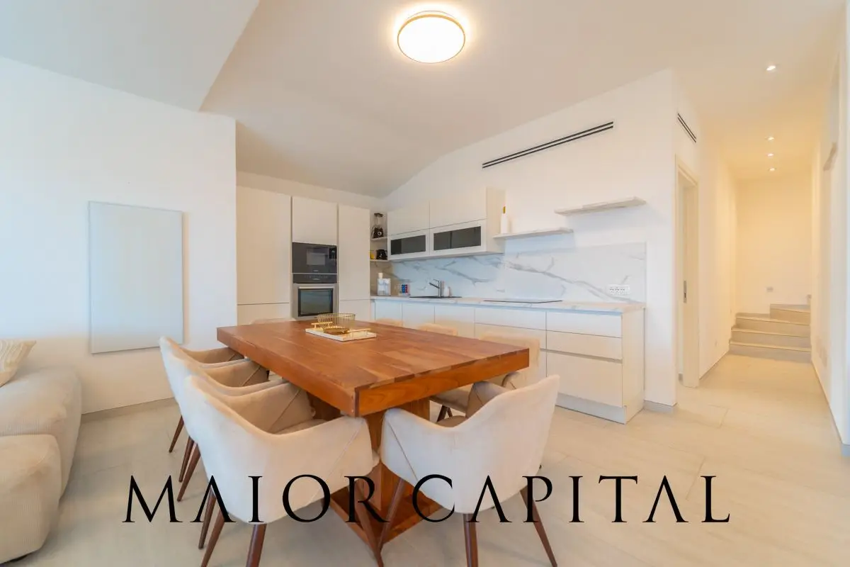 The sea-view living area is the vibrant heart of the home, featuring an open-plan kitchen and direct access to a large panoramic terrace with heated infinity pool, BBQ area, covered dining space, and panoramic solarium.