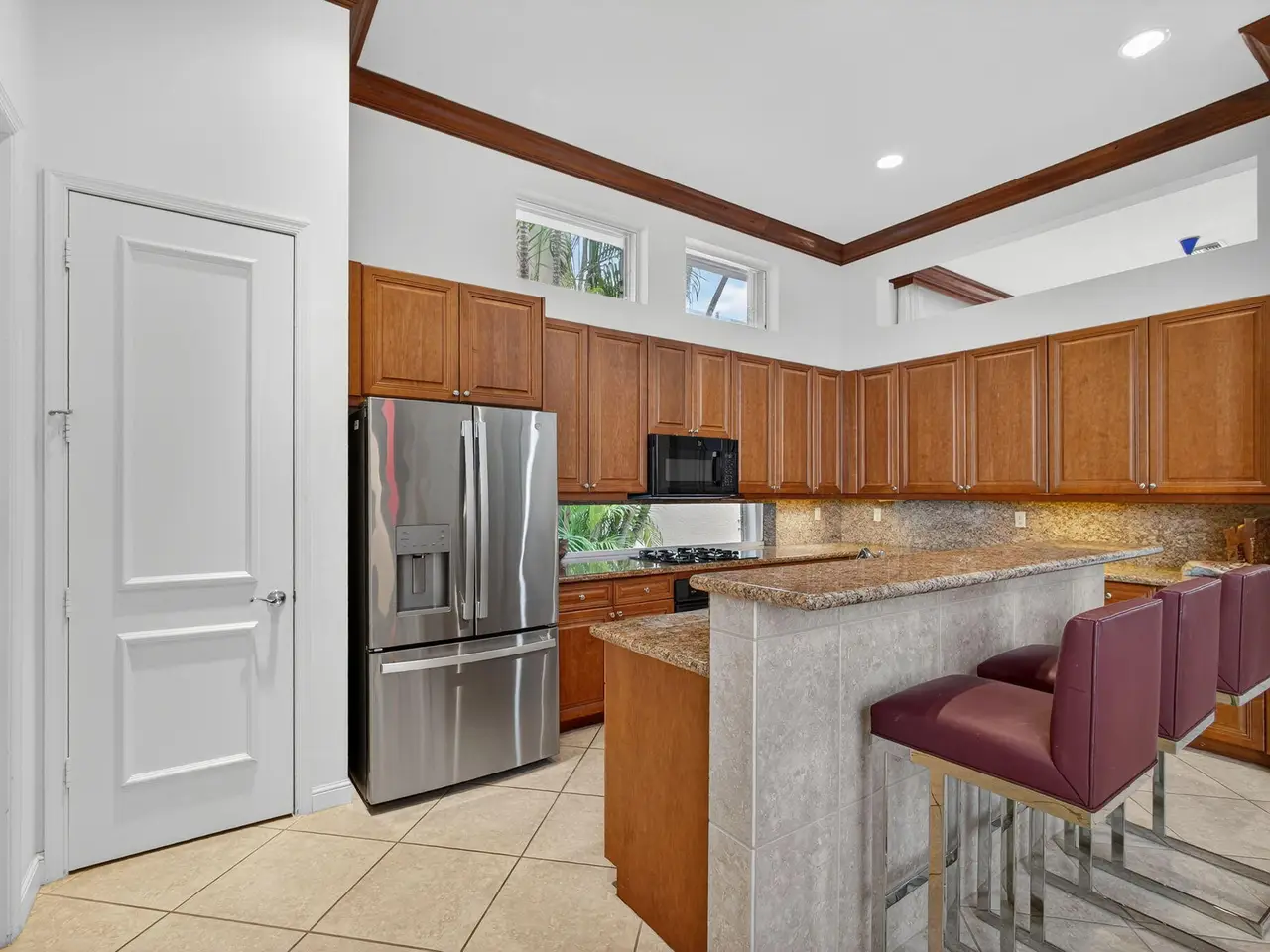 Welcome to 154 Porto Vecchio, Palm Beach Gardens Nestled in the prestigious Country Club at Mirasol, this charming three-bedroom, three-bath home is a true gem. Boasting a brand-new roof and newly installed accordion shutters, this home is not only aesthetically pleasing but also offers significant insurance benefits. The home features a serene and private lot with beautiful lake views and a private preserve at the back, creating a peaceful retreat. The great room-style floor plan, known as the Bardini, showcases light and bright transitional decor. The kitchen, with its warm maple cabinetry, offers stunning views of the lake and the Sunrise golf course.