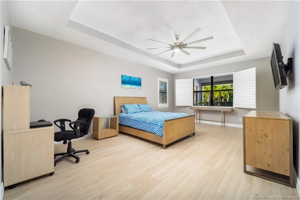Luxury living meet? Timeless elegance in this stunning Clubview floor plan, nestled on a rare .57-acre corner lot in the exclusive Palm City community of Copperleaf. Meticulously maintained and designed for both comfort and sophistication, this 3,089 sq. ft. home offers 4 bedrooms plus a den and office—a possible 6-bedroom layout—with 3 full baths. The living room features a cozy fireplace, and the kitchen showcases white cabinetry, quartz countertops, and an open layout perfect for gatherings. The primary suite includes dual walk-in closets and a beautiful bathroom with a large step-in shower and separate soaking tub. Plantation shutters throughout add a refined touch. Enjoy your private retreat with a heated oversized lap pool, marble-paver patio, lush landscaping, 3-car garage, and full impact windows and doors. Copperleaf offers resort-style amenities including tennis, pickleball, clubhouse, pool, fitness center, playground, and walking trails.
